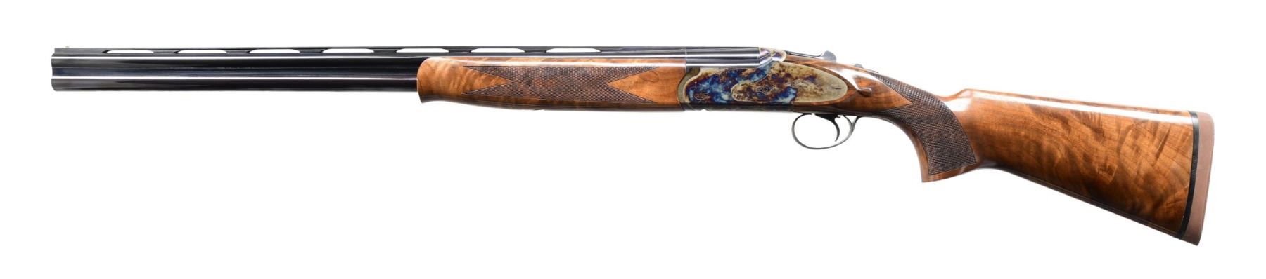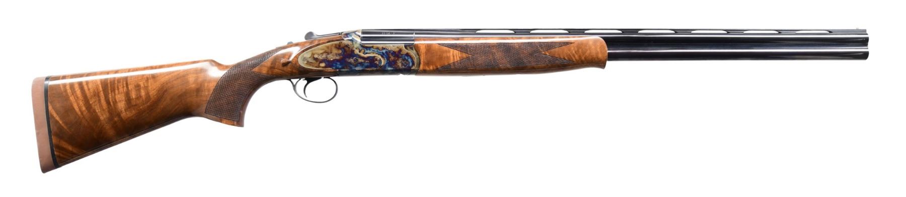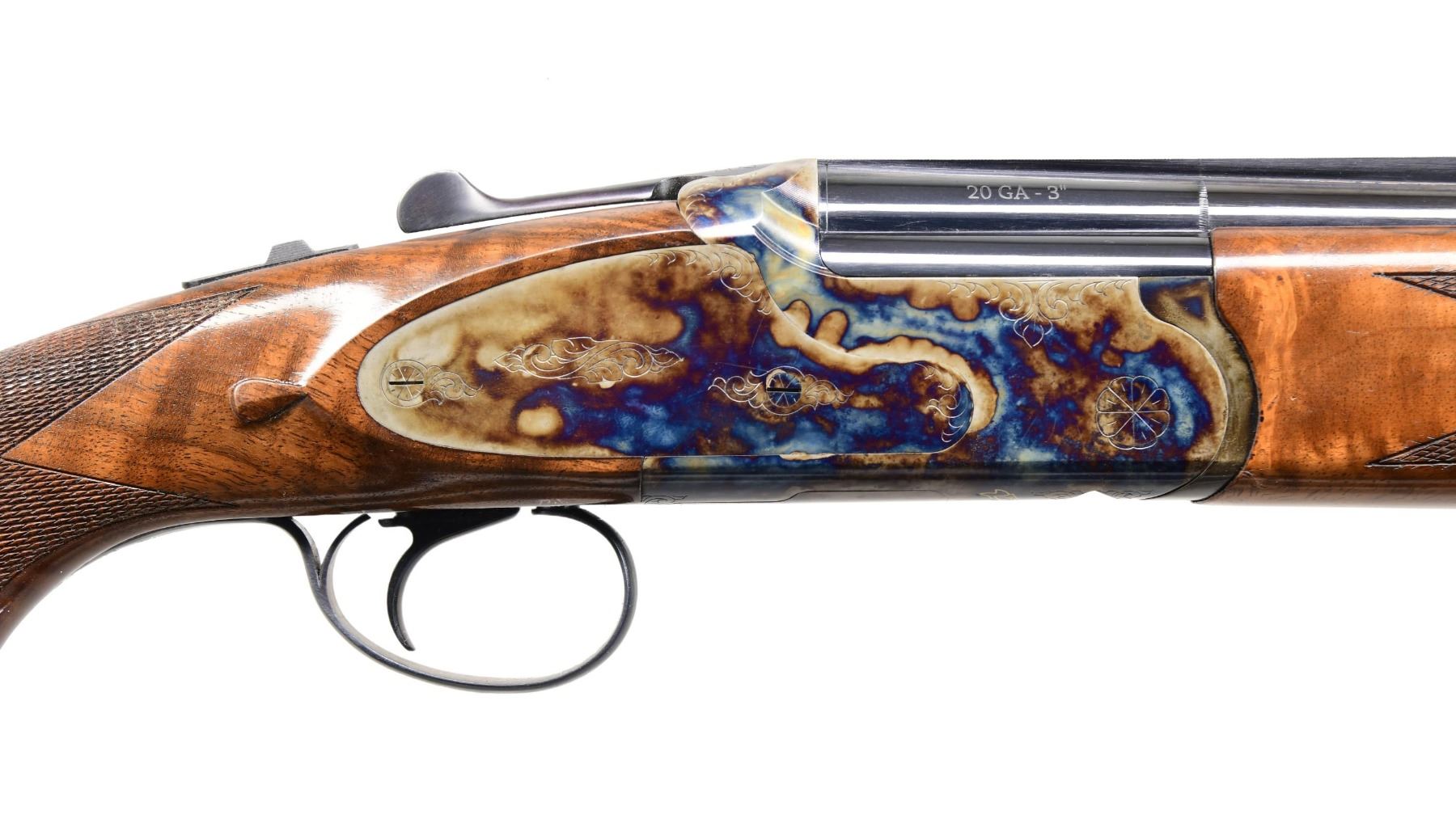 O/U SHOTGUN. Cal. 20 Ga., 3". S# TRS0207. Imported by Dickinson Arms Co. of Moonpark, CA from Turkey. The VR 28" Barrels has brass bead & fitted for interchangeable chokes. Bone charcoal case hardened sideplate action with SST, ejectors & auto-safety. Checkered Turkish Walnut stock set; schnabel tip forearm & pistol grip buttstock w/ tear drops behind locks. LOP: 14.25" to Decelerator pad. CONDITION: near excellent wood & metal finish; bright shiny bore with light residue near choke tubes. (24-3167/MD). MODERN. $800-1,200.