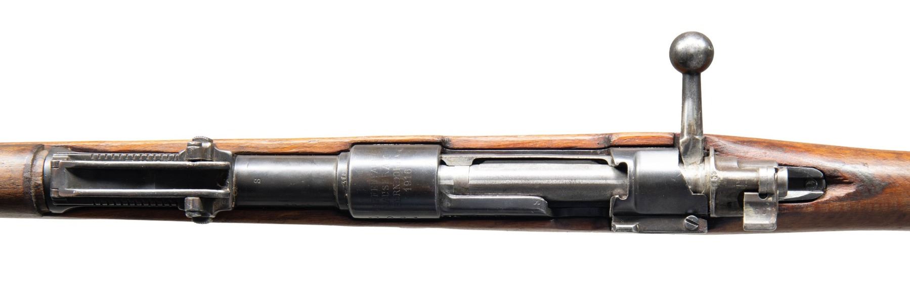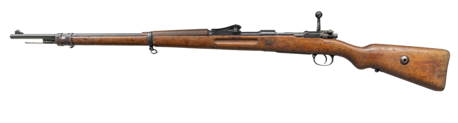 Cal. 8x57 (8mm Mauser). S# 1081. Bbl. 29". Standard Imperial Gew 98 sights. Mismatched numbers throughout with bolt handle numbered appearing scrubbed & trigger guard being Czech made. Receiver ring has Mauser Oberndorf markings with 1916 date. Right side of receiver has small Navy Arms import marking. Left side of receiver arsenal renumbered by Turks. Bolt & buttplate are in the white. Remaining metal parts have arsenal reblue finish. Beech stock set with bottom mounted sling provisions. Handguard is loose & rear band is stuck. Cleaning rod present. CONDITION: stock set shows an armorer patch repair ahead of trigger guard, some chipping, a few small cracks, scattered black staining, finish wear, dings, & handling marks. Metal retains 50% arsenal rework blue with some blued over pitting, light tool marks on receiver, overall fading, scattered oxidation, some dings & edge wear. Action functions properly when hand cycled. Bore shows worn rifling with scattered pitting, oxidation & dried grease. (25-3957/MJC). CURIO. $300-450.