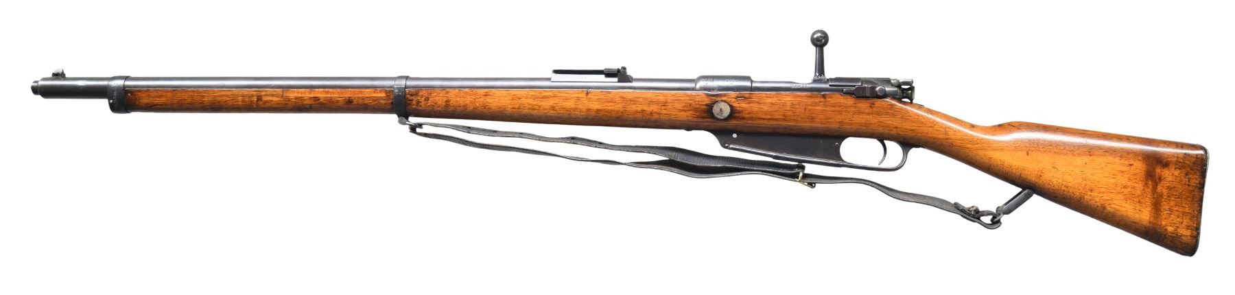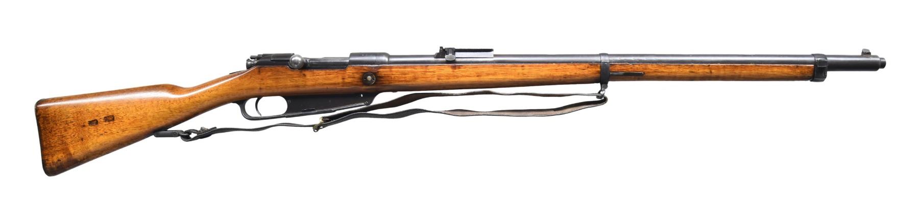 Cal. 8mm Mauser. S# 3939y. Bbl. 30" with jacket. Blade front sight. Ladder rear sight graduated to 2000m. Matching numbers on receiver, bbl. jacket & front sight. Other visible parts are mismatched. Bolt has Arabic numbers & Turkish Crescent moon marking on cocking piece. Receiver top has Imperial inspection stamps, "S" stamp, Erfurt marking & 1891 date. Gew 88 rifle updated to stripper clips by Imperial Germany & later provided as war aid for the Ottoman Empire. Arsenal rework blue finish. Hardwood stock with faint Imperial German cartouches, bottom mounted sling swivels & leather sling. No cleaning rod present. CONDITION: refinished stock has added varnish with scattered dings, light flaking & handling marks. Metal retains 90% Turkish arsenal rework blue with scattered fading along the exposed edges, some handling marks, blued over pitting & dings. Action functions properly when hand cycled. Bright bore with scattered frosting & light pitting but strong rifling. (01-27200/MJC). ANTIQUE. $300-500.