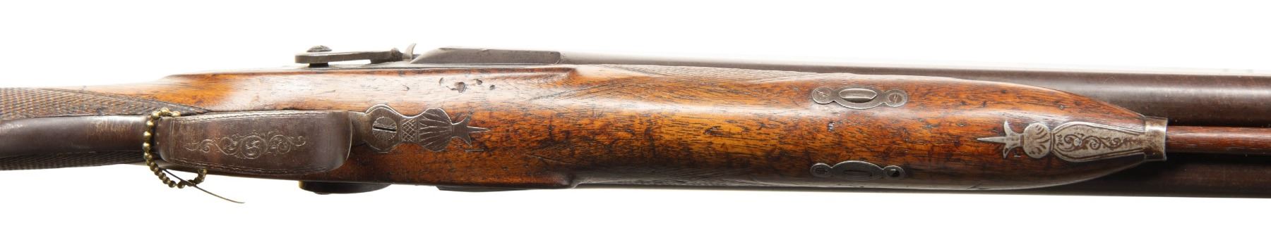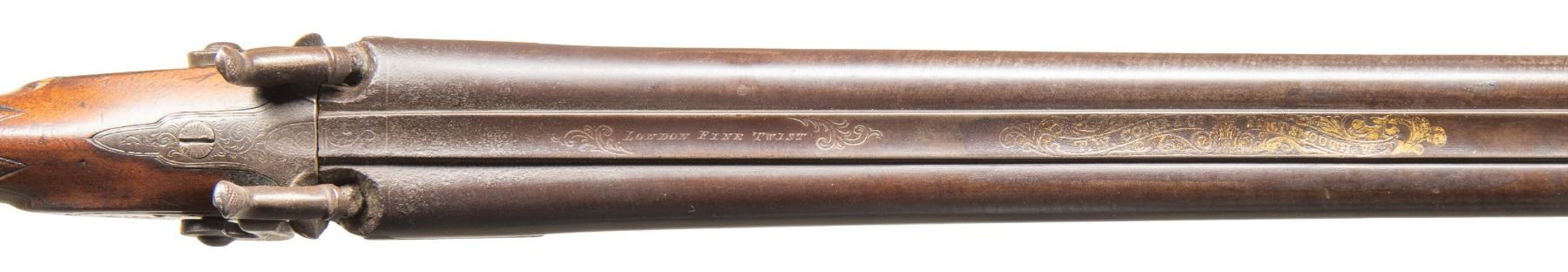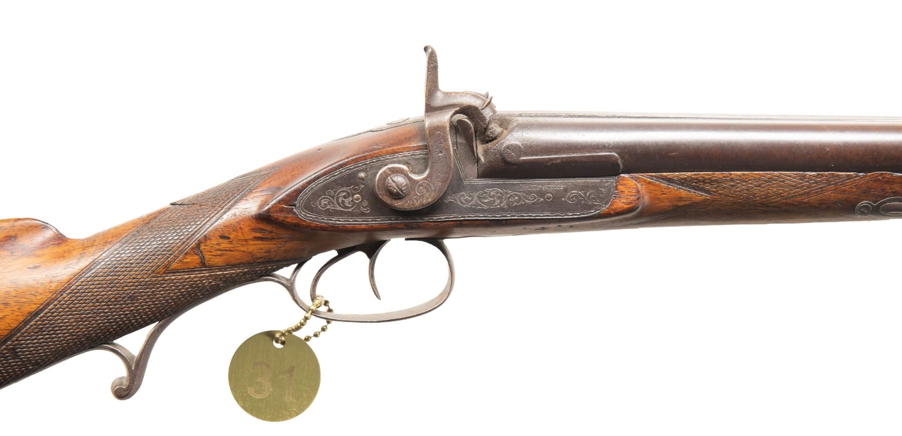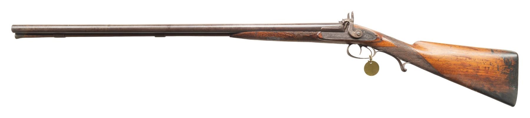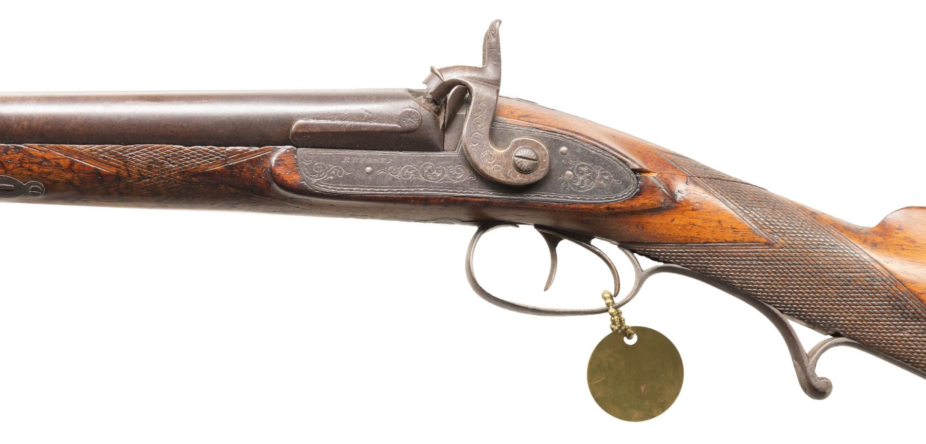SHOTGUN. Cal. 12ga. NSN. Thomas Cofer of Portsmouth, Va is best known as maker of rare brass framed Confederate revolvers but prior to the war he sold and repaired imported arms such as this circa 1860 side by side percussion shotgun. Few of these agent marked arms are known with fancy etched gilded marking on top rib "T.W. COFER & Co." "PORTSMOUTH, VA.". The shotgun was long time in the collection of Confederate collector Fred Edmunds and was displayed with his Cofer revolver for many years. William Albaugh, Hugh Benet, & Edward N. Simmons in their pioneering 1963 text "Confederate Handguns" show this identical marking on Mr. Simmons gun stating this arm is "even more uncommon than his pistols". 46" overall, 30" barrels, iron mounted, checkered wrist & forestock. Shotgun appears as found with old wrist repair, it has the look of so many wartime used arms, we don't know if this shotgun made it into the field, but many shotguns did. CONDITION: very good overall, dark iron patina, sound stock with staining and hand worn patina and new wrist repair, otherwise appears as manufactured circa 1860. Mechanics are sound, smooth clear bores. PROVENANCE: Fred Edmunds collection, Private Southern collection. (01-25748). ANTIQUE. $6,000-8,000.