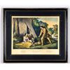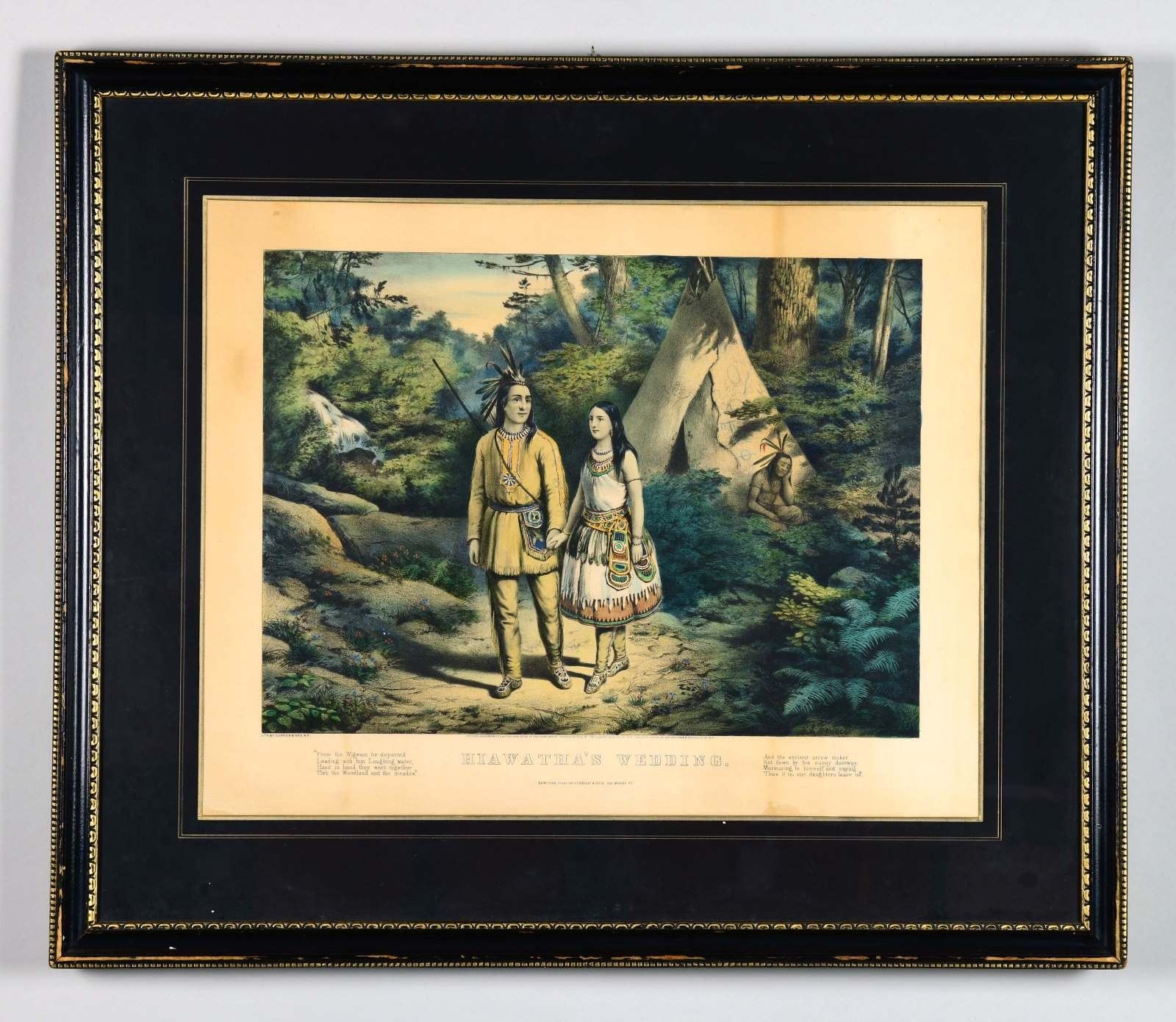 Circa 1858-1860. 1) "Hiawatha's Wedding". Hiawatha and his new wife laughing while walking away from the tent of her father. SIZE: overall 25" x 29 1/2", sight 17" x 22". 2) "Hiawhatha's Wooling". Hiawatha presenting a stag to Minnehaha and her father at his wigwam. SIZE: overall 25" x 29 1/2", sight 17 1/2" x 22 1/2". Each chromolithograph are housed in matching black frames with gold trim matted under glass. CONDITION: both are good with light toning. PROVENANCE: Martin Lane Historic & Western Americana Lifetime Collection. (02-21721/TG). $800-1,200.