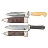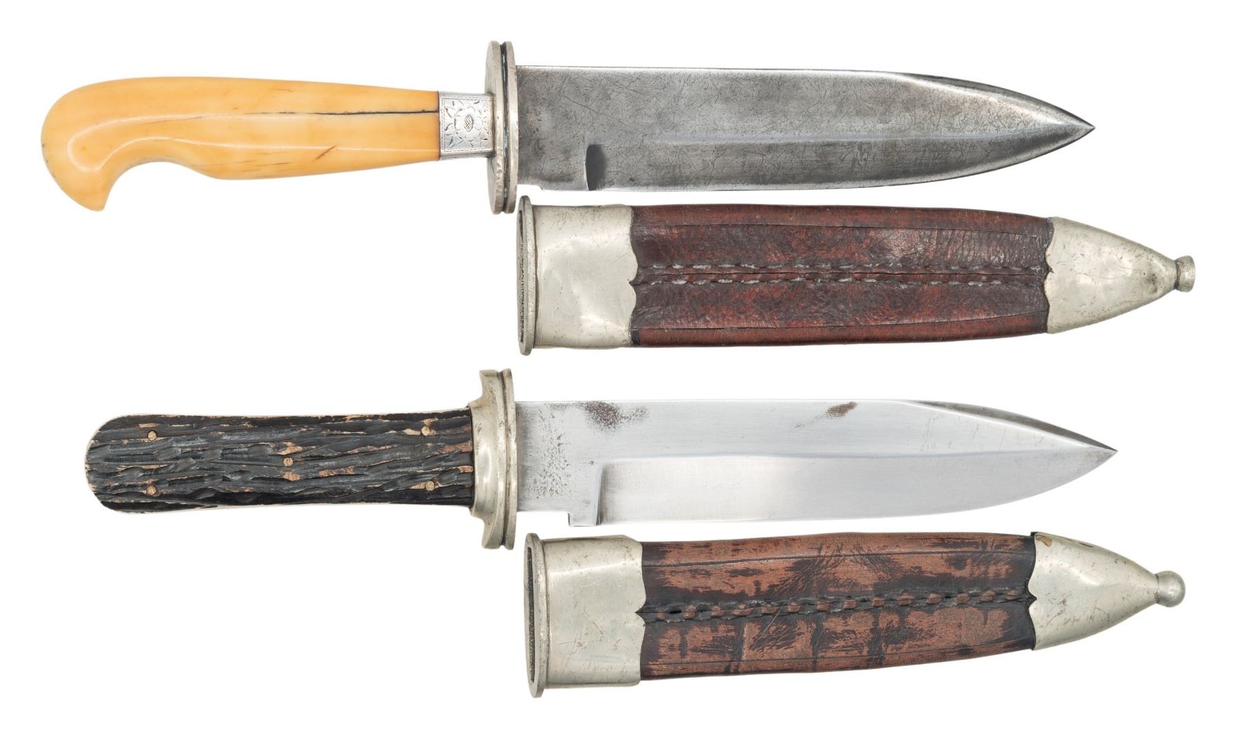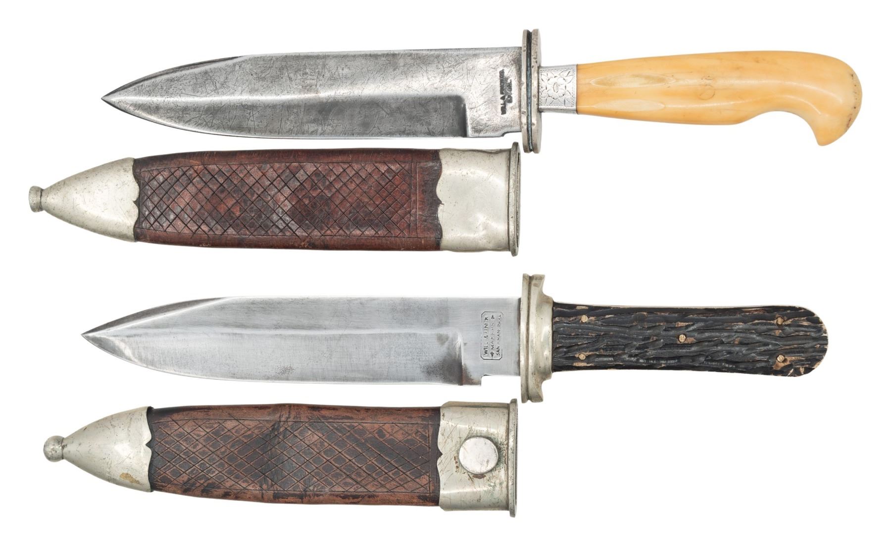 Modern fakes with different WILL & FINCK, SF markings, both 12' overall with 7" blades, German silver mounted tooled leather sheaths, one full tang with stag grips, other has vintage walrus ivory handle with its original engraved silver ferrule. CONDITION: very good overall. (02-25221, 02-25226/JS. NON-GUN. $300-500.