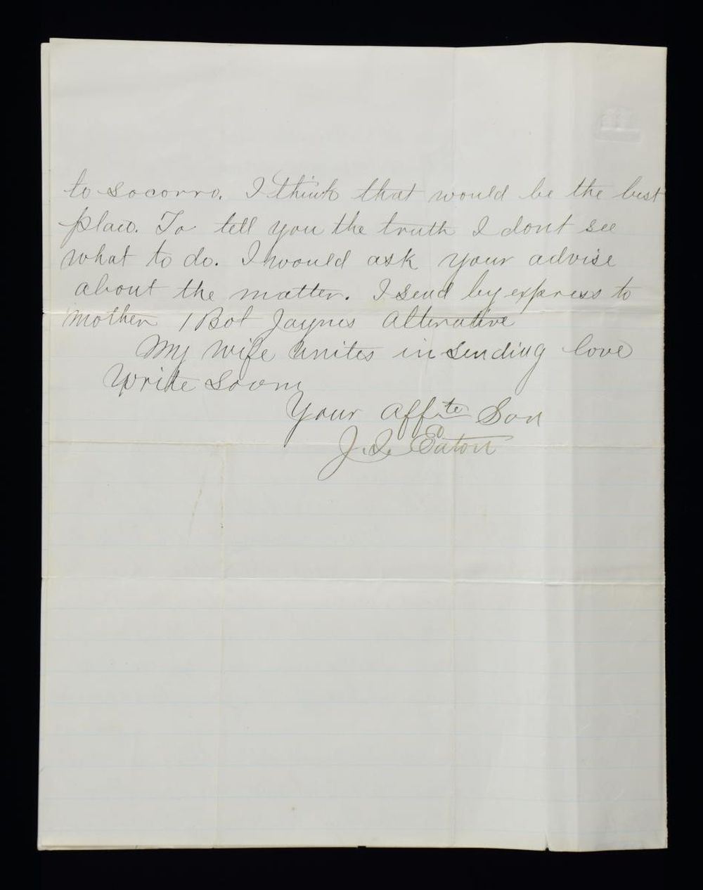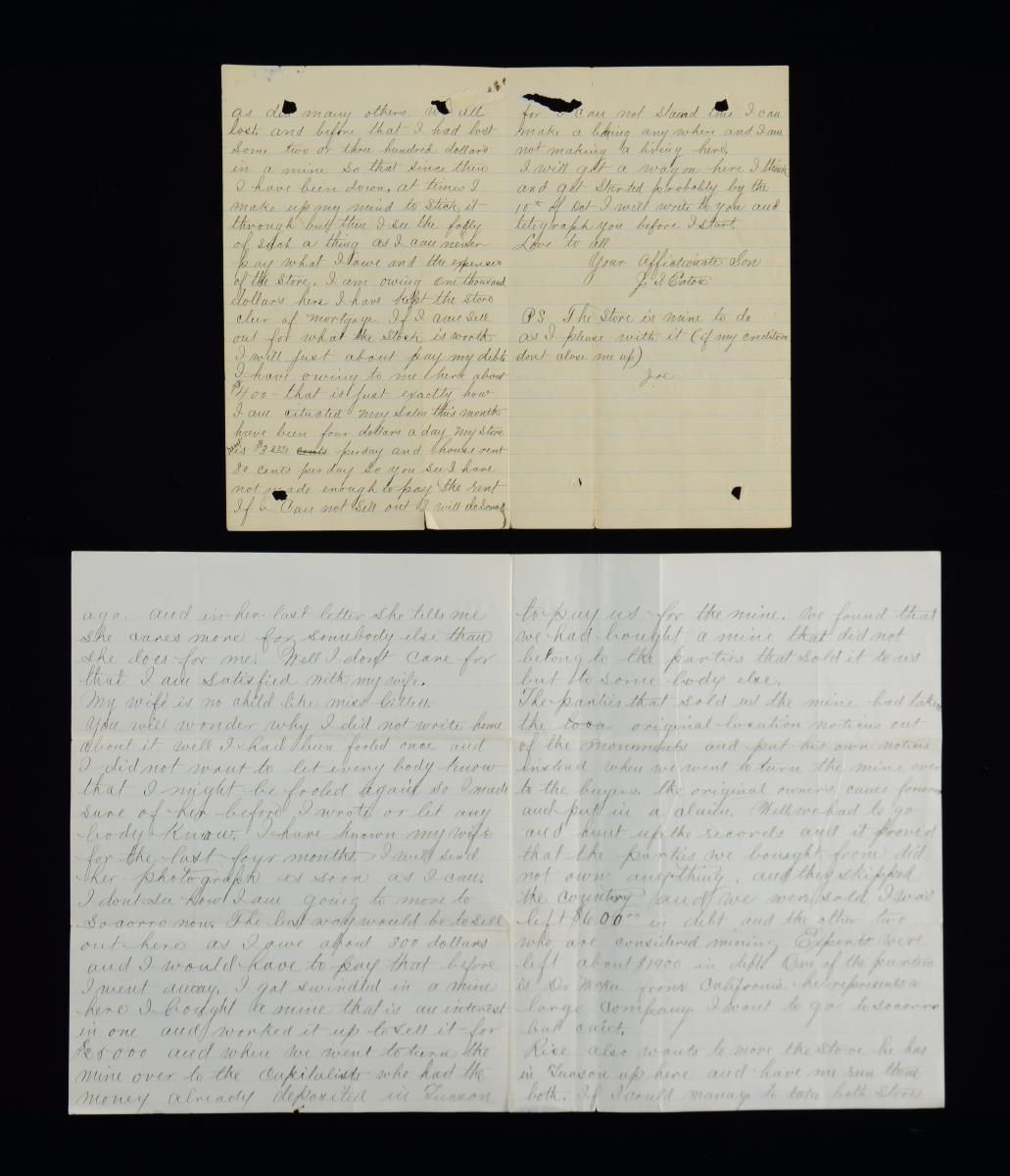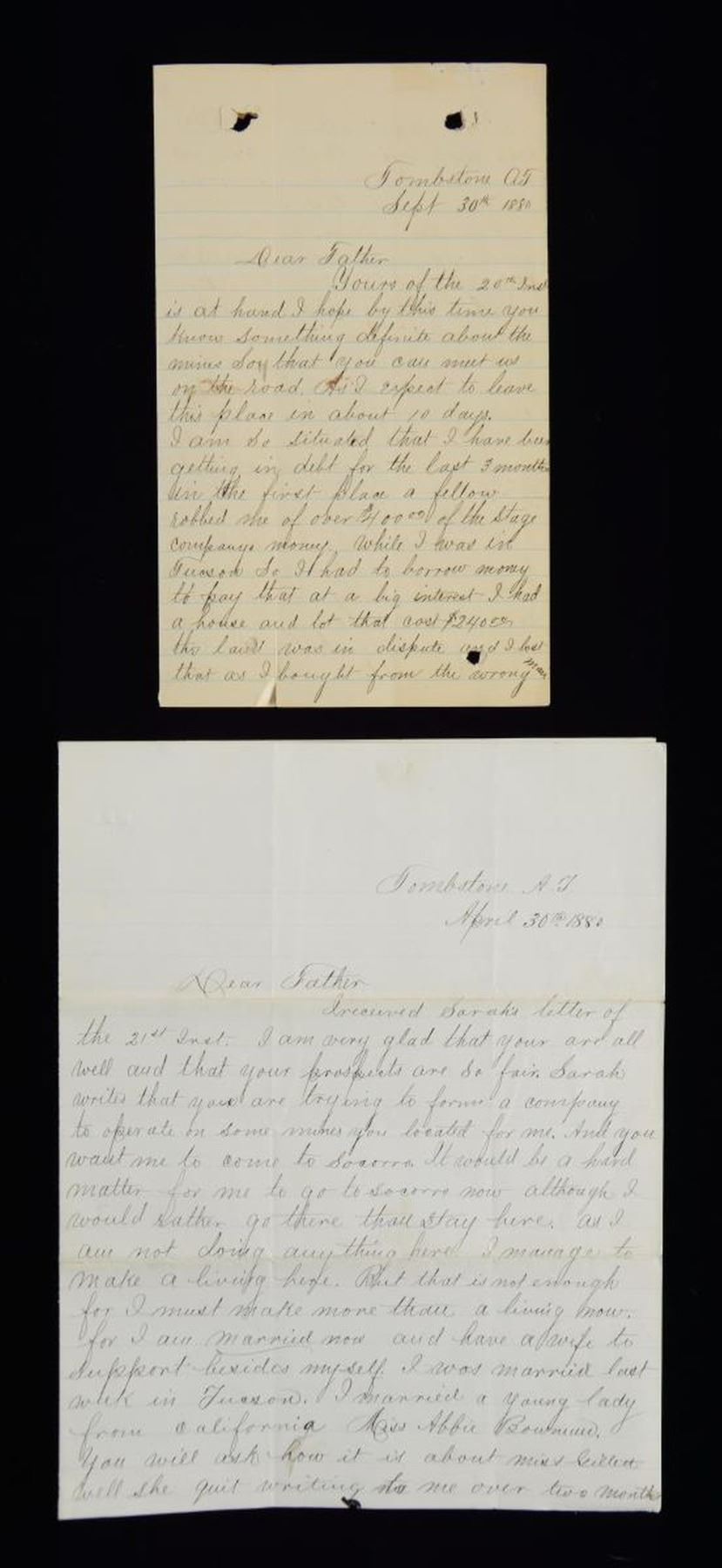 3 page and 4 page letters written by Joseph Isaac Eaton (1856-1949) to his father New Mexico pioneer Colonel Ethan W. Eaton. The 24 year old is sowing his oats in the wild town of Tombstone leaving comforts of father's 100,000 acre ranch near Socorro. "Tombstone the town to tough to die" was tough for hard working Joseph, he got swindled out of a $25,000 sale of a mine he bought from someone who skipped the country, he got stood up by his fiancé, robbed of $400 of stage coach money and had to borrow money at high interest to pay it back, bought house and land that he lost with disputed title ("bought from wrong man"), he closes with "I'm getting a wagon & moving". Joseph ends up in El Paso living into his 90s. CONDITION: good overall, small reductions in 3 page letter. PROVENANCE: Martin Lane Historic & Western Americana Lifetime Collection. (02-22025/JS). $200-400.