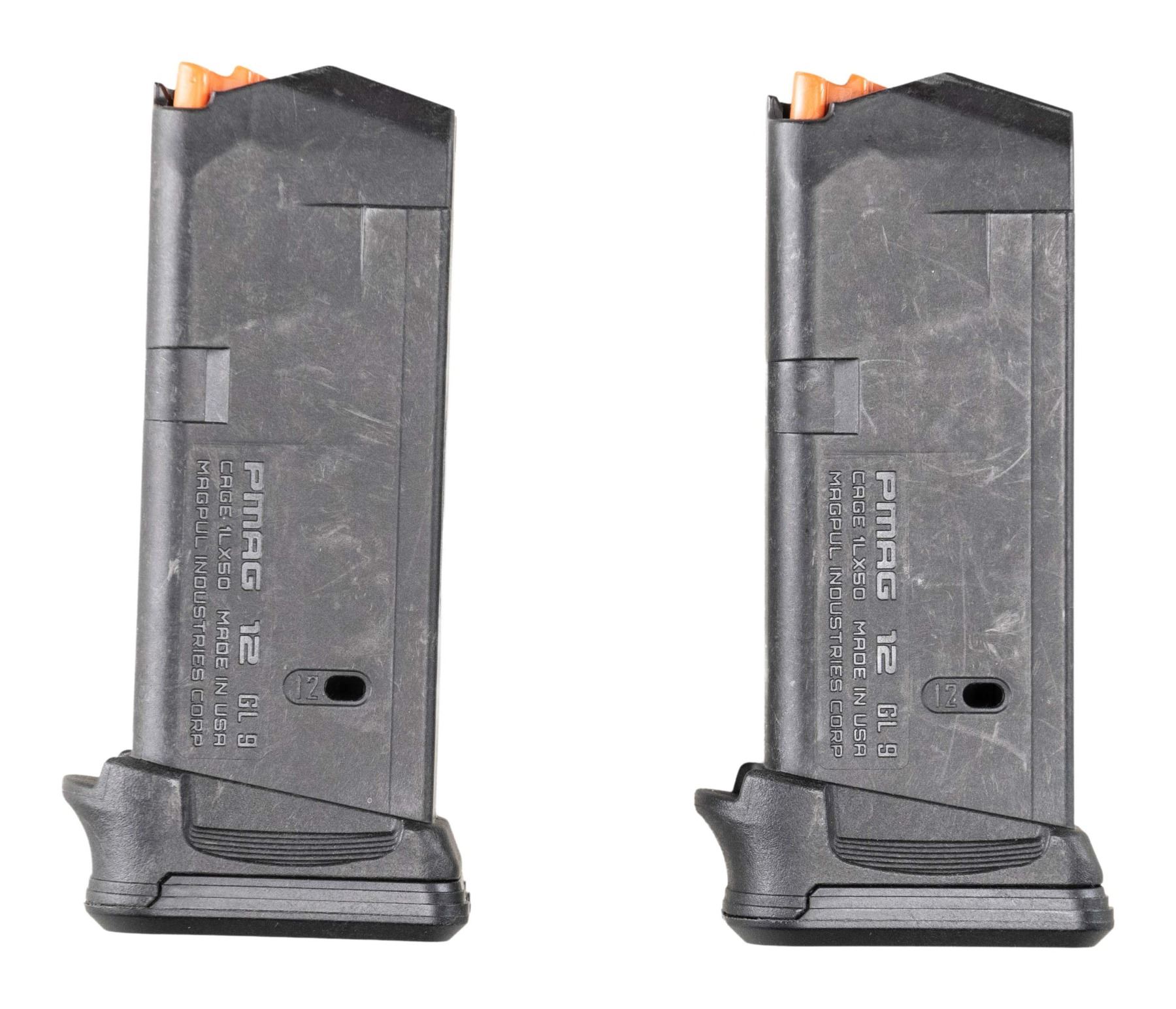Two Magpul P12 GL9 12 rd. double stack mags for 9mm Glock 26 pistols. CONDITION: very good plus with light usage wear. (02-26142/MJC). $30-50 for pair.