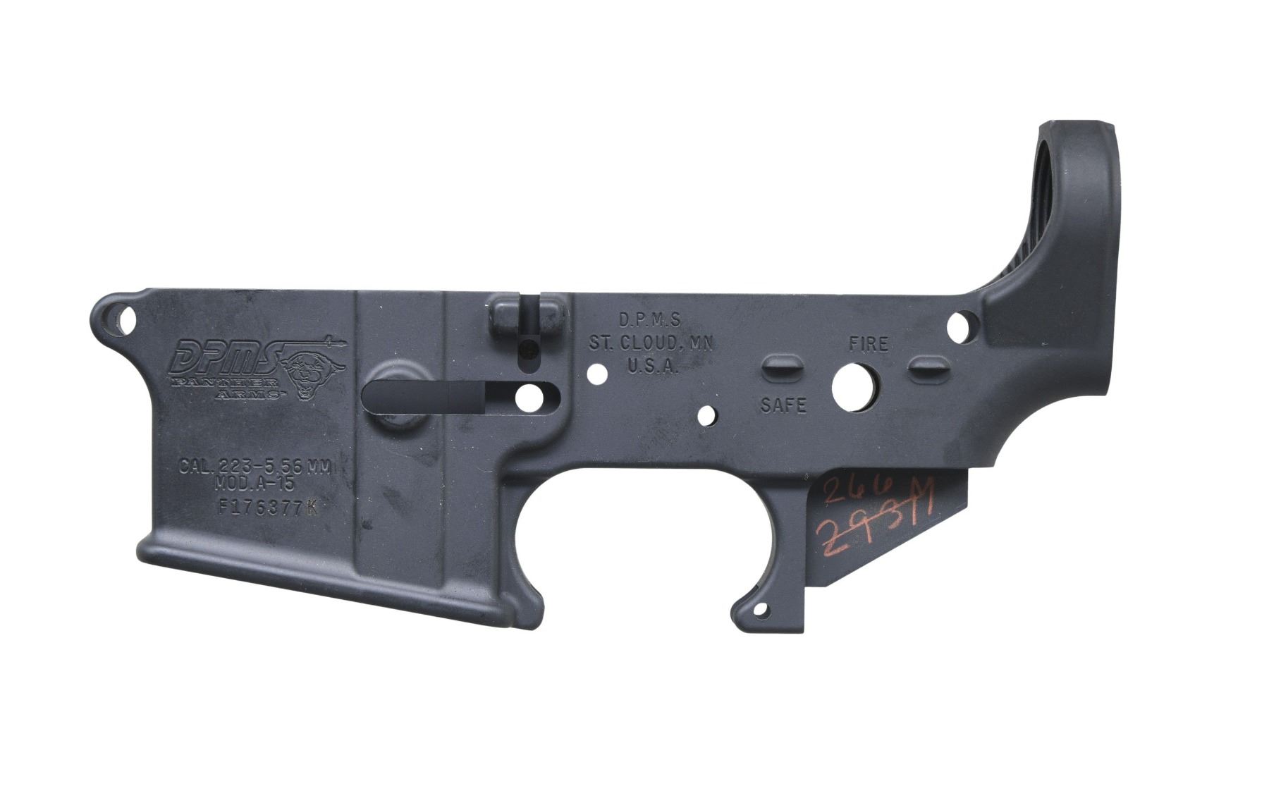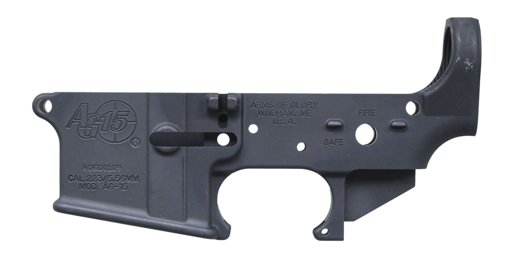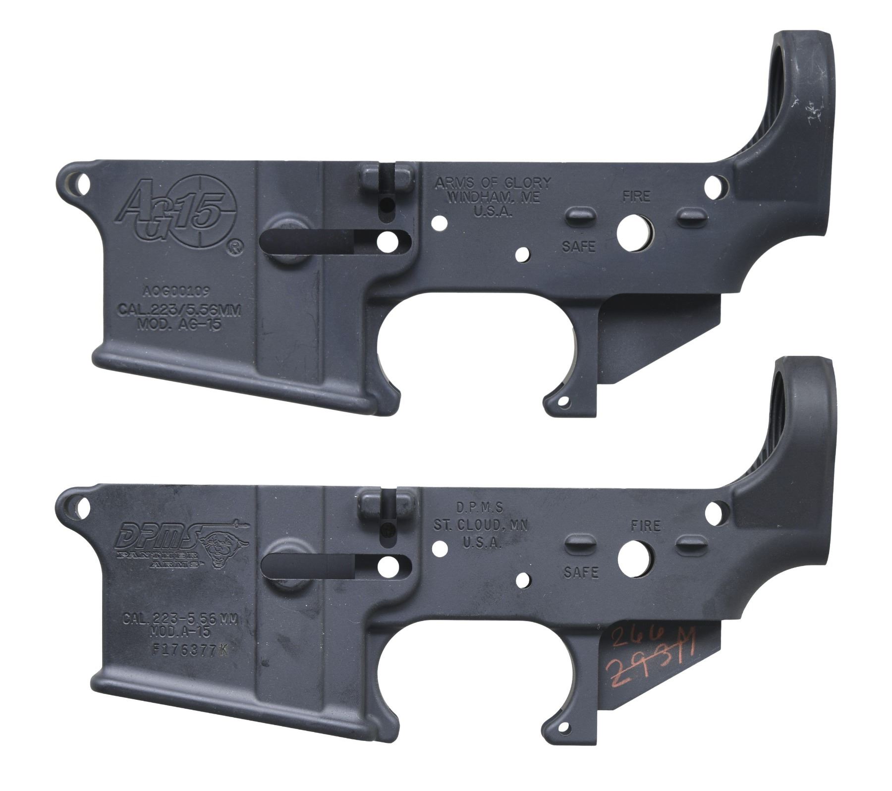 AND DPMS. No.1: Arms of Glory Receiver. S# AOG00109. Alloy receiver is marked w/ an "AG15" logo, serial number & "MOD. AG-15 CAL.223 / 5.56MM" over mag. well & is marked over trigger guard "ARMS OF GLORY / WINDHAM MAINE / U.S.A.". Selector switch position is marked "safe" & "fire". Receiver contains no additional parts & has a black non-reflective finish. CONDITION: receiver has not been assembled into a rifle & has nearly all of its finish present w/ several small handling marks. (25-3015/RW). No.2: DPMS Receiver. S# F176377K. Receiver is marked on the left side over the mag. well w/ the "DPMS Panther's head" logo, "MOD. A-15 CAL.223-5.56MM / serial number". The serial number w/ an added letter suffix indicates a receiver that was shipped as an item not fitted to a rifle. The receiver was also marked over the trigger guard "D.P.M.S. / S.T. CLOUD, MN / U.S.A.". Selector position has only "safe" & "fire". Receiver has black non-reflective finish & red inventory numbers underneath grip area. CONDITION: receiver retains nearly all of its original finish except for several very small handling marks. (25-3050/RW). BOTH MODERN. $150-350.