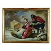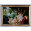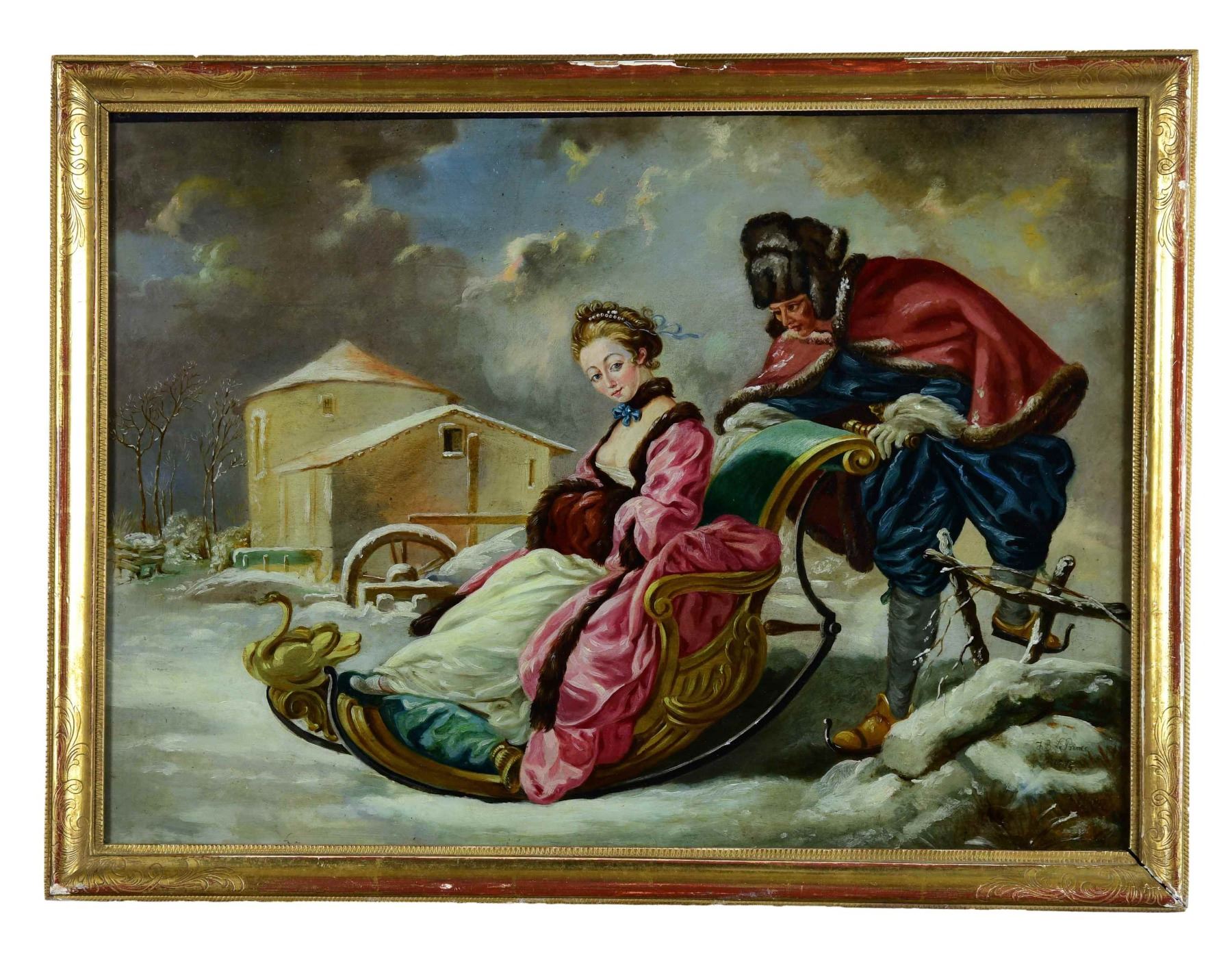 JEAN BAPTISTE LEPRINCE (French, 18th Century) BATHING AT THE WELL and THE SLEIGH RIDE. 1) Three nude and partially nude maidens bathing with a figural water fountain which has flowing water out of a dolphin's mouth deep in the woods. 2) A man in a colorful costume wearing ice skates pushing an elegantly dressed woman seated in an ornate swan-carved vozok. Both works are signed lower right "J.B. Leprince, 1779". Each housed in a gold leaf carved frame with foliate decoration. SIZE: each overall 20" x 27", each sight 17 1/2" x 24 1/2". CONDITION: both appear in original untouched condition and maintain a strong and vibrant palette. NOTE: for history and details on reverse painting techniques, refer to Mildred Lee Ward's book "Reverse Paintings on Glass". (05-958/TG). $3,000-5,000.