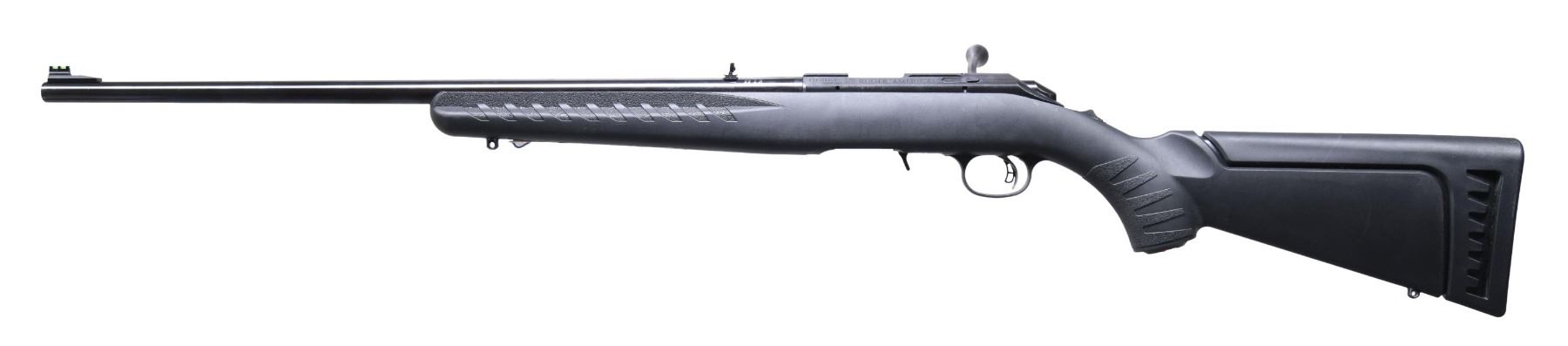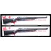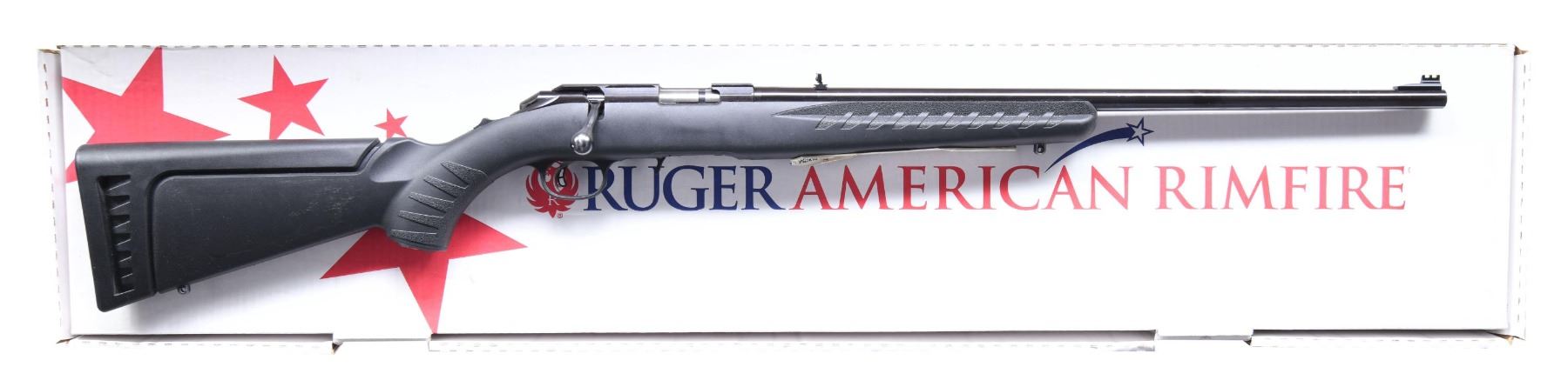 MATCHING FACTORY BOXES. 1) Cal. 22 LR. S# 833-58344. Bbl. 22". American bolt action rifle chambered in .22 LR mfg. by Ruger in 2016. Top of the bbl. is marked with Ruger's mfg. information, with the cal. designation marked on the left, towards the breech. Left side of the receiver is marked with the S#, followed by the Ruger logo, as well as "RUGER AMERICAN". Metal components exhibit a blue finish overall, save for on the bolt body, which is polished in-the-white. 1-piece textured black synthetic pistol grip buttstock. Green fiber optic blade front sight, with flip-up U-notch rear sight. MAGS: 1 10-rd. UNATTACHED ACCESSORIES: matching factory box, containing an additional stock module. CONDITION: very good, with metal components retaining bountiful amounts of their original factory blue finish overall. Mirror bore, exhibiting well defined rifling throughout. Bolt and muzzle crown exhibit some carbon build up from prior use. Stock is very good, showing some light handling marks. Box shows some exterior wear, and a couple of tears, but otherwise remains sturdy and serviceable. (24-7074/MLW). MODERN. 2) Cal. 22 LR. S# 833-58403. Bbl. 22". American bolt action rifle chambered in .22 LR mfg. by Ruger in 2016. Top of the bbl. is marked with Ruger's mfg. information, with the cal. designation marked on the left towards the breech. Left side of the receiver is marked with the S#, followed by the Ruger logo, and "RUGER AMERICAN". Metal components exhibit a blue finish overall, save for on the bolt body, which is polished in-the-white. 1-piece textured black synthetic pistol grip buttstock. Green fiber optic blade front sight, with flip-up U-notch rear sight. MAGS: 1 10-rd. UNATTACHED ACCESSORIES: matching factory box, containing an additional buttstock / cheek rest assembly. CONDITION: good, with metal components retaining the majority of their original factory blue finish, exhibiting scattered areas of light to mild surface oxidation. Mirror bore, exhibiting well defined rifling throughout. Bolt and muzzle crown exhibit some carbon build up from prior use. Stock is very good, showing some superficial marks from handling and storage. Box shows some exterior wear from handling and storage, but otherwise remains sturdy and serviceable. (24-7075/MLW). MODERN. $400-600.
