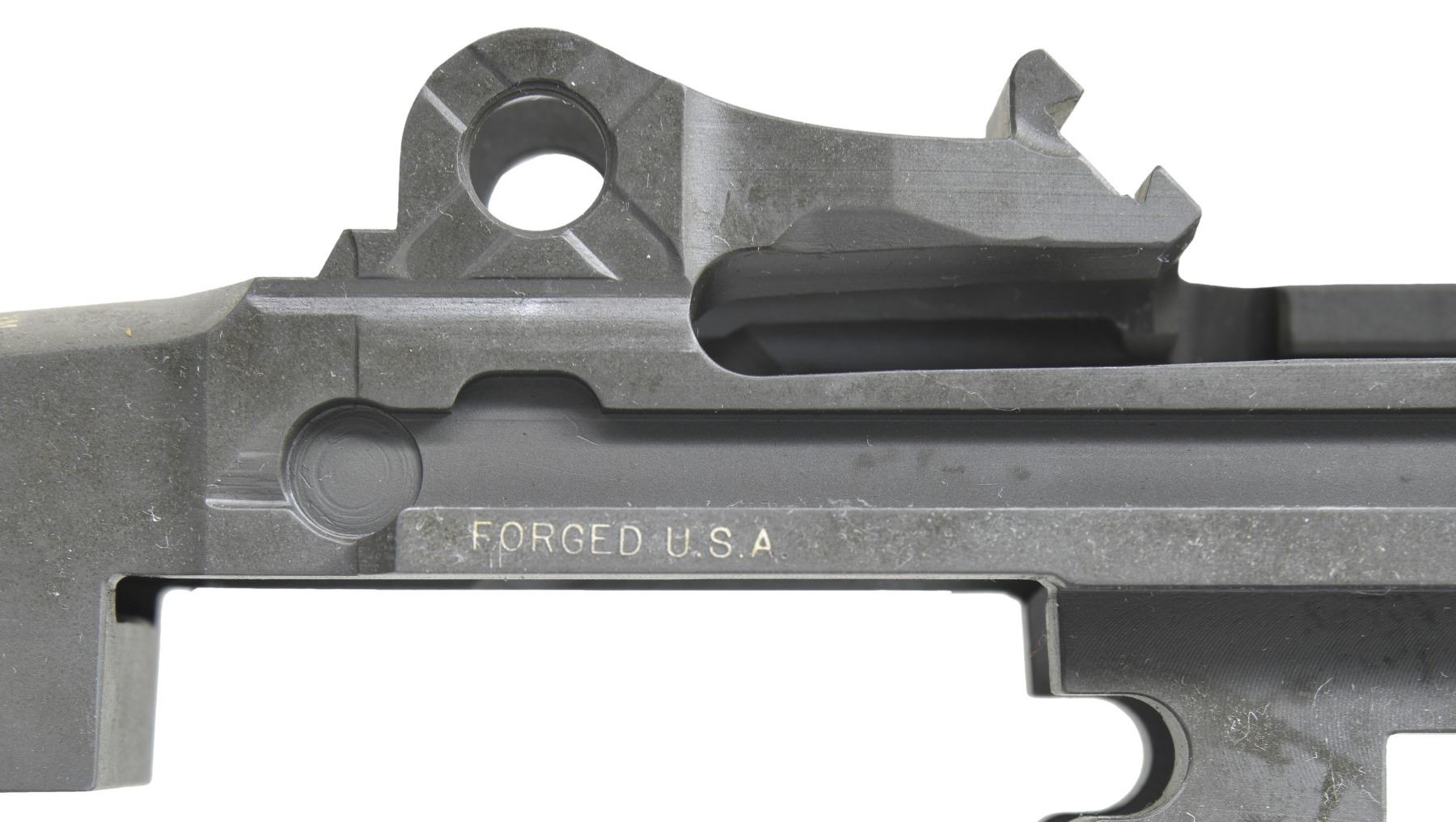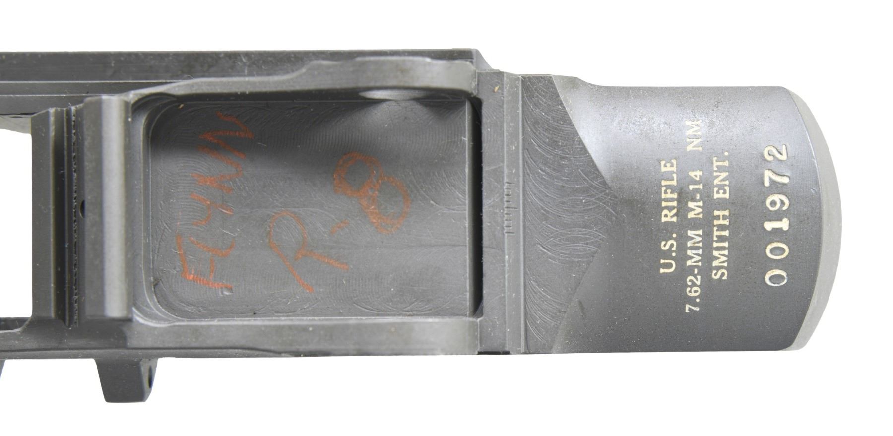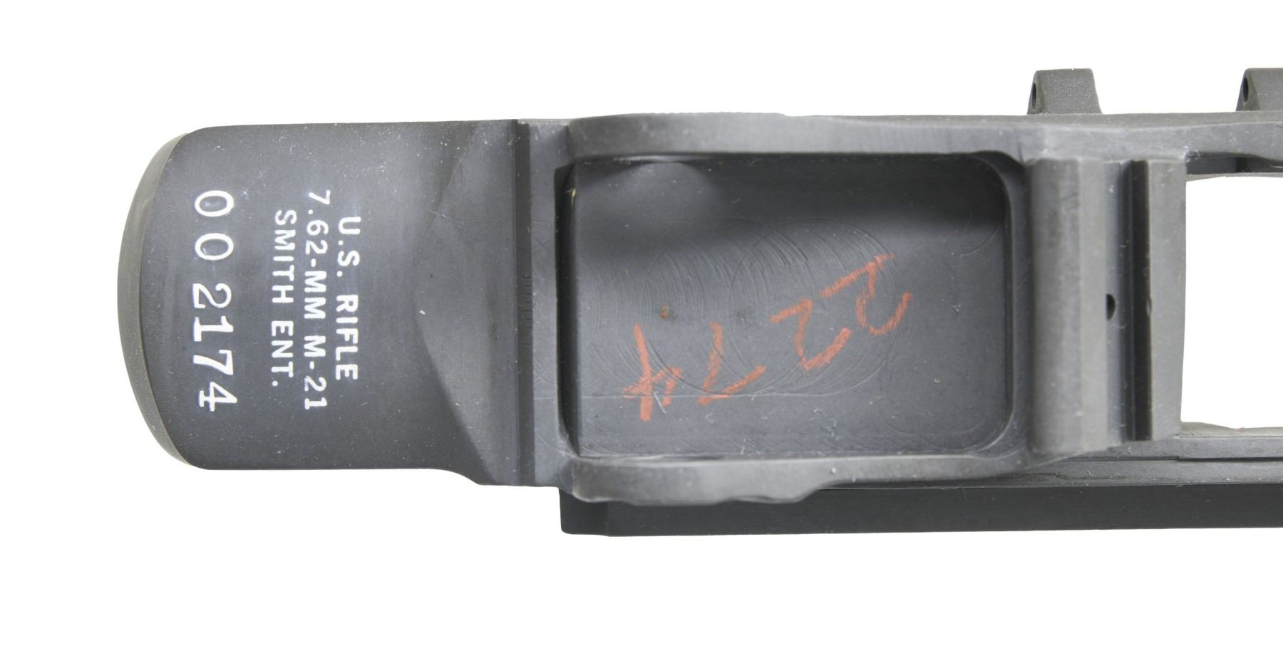AUTO RIFLE RECEIVERS. No.1: M21 Receiver. S# 002174. Receiver is marked at heel "U.S. RIFLE / 7.62-MM M-21 / SMITH ENT. / serial number". Letters are non-sarif. Markings enhanced w/ white. Marked at right forward end "MESA AZ". Receiver has integral rear lug & contains no additional parts. (25-3169/RW). No.2: M14 NM Receiver. S# 001972. Receiver marked at rear "U.S. RIFLE / 7.62-MM M-14 NM / SMITH ENT / serial number". Sarif lettering is enhanced in white. Receiver is marked on outer edge of right rail "FORGED IN USA / MESA AZ". Number "791089" appears below rail. Receiver has integral rear lug. OVERALL CONDITION: both receivers retain nearly all of their original Parkerized finishes w/ only very light high point wear & show no signs of having been fitted to rifles. (25-3170/RW). BOTH MODERN. $400-600.