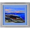 1) Jill Hoy; Maine, late 20th century. View of Cadillac Mountain on the horizon with small islands and calm water at the center, with a rocky shoreline in the foreground. Signed and dated "Jill Hoy 91" lower left. SIZE: overall 14" x 16", sight 9" x 11 1/2". 2) Jill Hoy; Maine, 20th century. A shoreline of boulders and calm water, pine covered islands in the distance with low billowing clouds beneath an azure sky. Signed and dated lower right center "Jill Hoy 2000". Both watercolors are on paper and are housed in matching antiqued white wood frames, matted under glass. SIZE: overall 15 1/2" x 19 1/4", sight 10 1/2" x 15". CONDITION: very good, untouched original condition. PROVENANCE: Private Maine Collection. (05-1052/TG). $800-1,200.