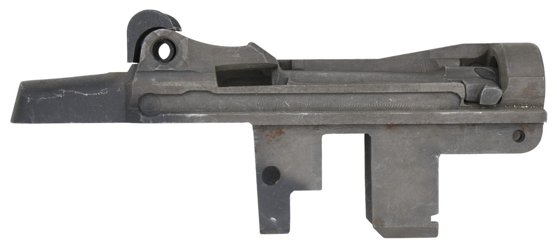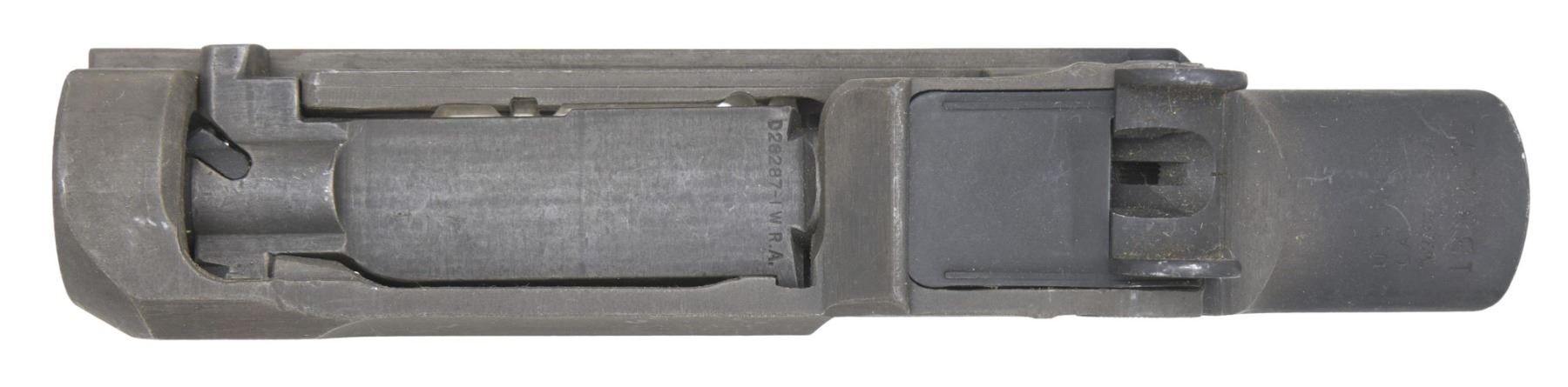 1) Winchester Receiver with Bolt. S# 1383072. Receiver mfg. in August of 1943 is marked on the right side with drawing number "D 28291-2." Receiver includes bolt marked at rear "D 28287-1 / W.R.A." Bolt complete with firing pin and extractor. Also included is a rear sight base and sight cover. Cardboard storage box included. CONDITION: receiver, bolt assembly, and sight parts have worn arsenal rework Parkerization with small spots of oxidation. (24-5534/RW). 2) Winchester M1 Garand Receiver. S# 2350361. Stripped receiver mfg. in 1943. Has standard Winchester markings with "D28291-2" on the front right and marked on the bottom of the receiver leg the "TE / 1-65" arsenal overhaul mark. Cardboard storage box included. CONDITION: receiver retains 80% of its gray arsenal rework Parkerization with light wear and thinning. (24-5536/RW). BOTH MODERN. $400-700.