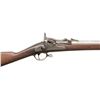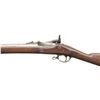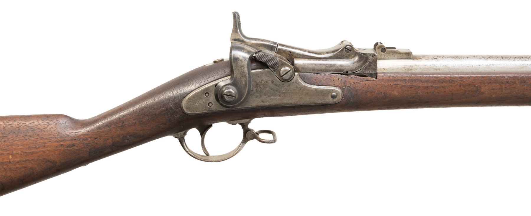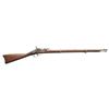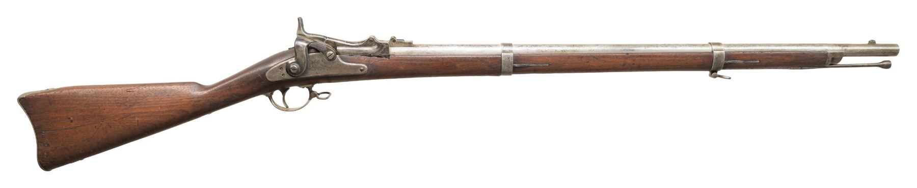 MILITARY RIFLE. Cal. 58 Rimfire. NSN. Bbl. 29 3/4". This scarce 1st Model Allin Conversion of a Civil War rifled musket to a breechloader taking a rimfire cartridge has been modified by a surplus arms dealer such as Bannerman for use by school cadets. The dealer modifications notably include leaving the middle band with its swivel in the original position and a radical thinning of the wrist area which differed from the methods used at the National Armory. The 1st Allin Conversion is notably more complicated and fragile than the later trapdoor single shots. The breechblocks are unmarked and the spring for the thumb-piece is not present for this rifle. Folding rear sight with aperture is graduated to 500 yards. Stud type front sight approximately 1 1/8" behind muzzle. Bevelled lockplate dated 1864 has the spread-wing eagle and US Springfield markings. Two position tumbler. Modified hammer has bevelled edges. Walnut stock has no visible markings except for a number "7" at the bottom of the toe area. The 7 is formed by 10 steel brads. U.S. marked buttplate. Trigger guard carries the rear swivel. Flat barrel bands retained by springs. Steel nose cap. Tulip-headed ramrod with swell measures 31 5/8" long and is partly threaded. Ramrod is retained by the swell and does not have a spoon spring. CONDITION: stock has a worn arsenal rework refinish with stained marks throughout. Notable deep scratch on right side of butt. The area between the breech block and the forward end of the lock has been repaired and shows a loss of wood as the wood is very thin in this area. The metal has been cleaned bright, returning to patina with notable areas of light pitting primarily on the furniture. Three groove bore is turning dark with areas of fine pitting, but retains strong sharp lands. PROVENANCE: From the PMRB Collection. (01-28439/RW). ANTIQUE. $500-800.