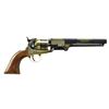 COMMEMORATIVE REVOLVER. Cal. 36. S# 671. Bbl. 7.5" octagonal. Manufactured in 1984. Limited production run of 2500 guns. U.S. Historical Society Robert E. Lee Commemorative Colt Model 1851 Navy Pistol. 6-Shot cylinder. Dark blued steel barrel & frame w/ polished brass trigger guard & pistol grip frame. Gold scroll & artwork on barrel frame & cylinder w/ "LEE" on top of barrel. In fitted lockable wooden case w/ leather top inlay. Interior of case is a gray colored velvet. Top cover interior bears brass plate engraved "THE OFFICIAL ROBERT E LEE COMMERATIVE PISTOL AUTHORIZED BY U.S. HISTORICAL SOCIETY". Case fitted for silver plated powder flask, a 1oz. commemorative coin bearing the likeness of Robert E. Lee marked "MACO FINE SILVER .999+". & 6 .36 caliber gold plated balls & a 1.6" diameter cap cup bearing the initials R.E. Lee. UNATTACHED ACCESSORIES: fitted hardwood case lined w/ gray velour, 1 oz. silver commemorative coin, silver plated powder flask, 6 gold plated 36 caliber balls. CONDITION: not uncommon of collectable commemorative items, all outward appearances indicate as new. No noticeable blemishing aside from natural tarnishing. (01-21793/JZ). ANTIQUE. $500-1000.