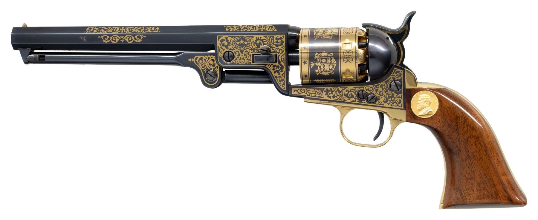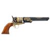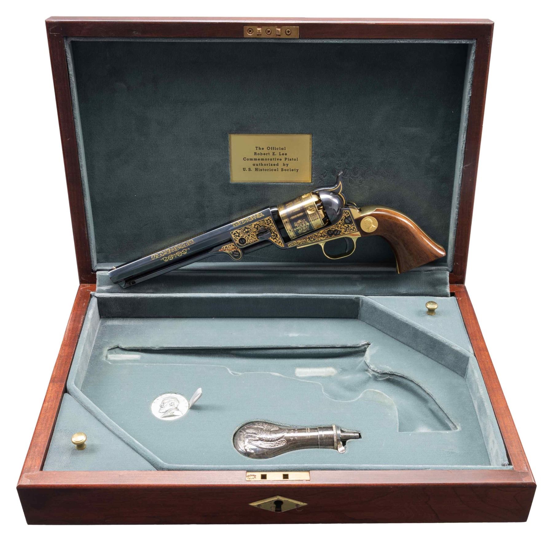 Cal. 44. S# 1946. Bbl. 7 1/2" with gold "LEE" accent. Post front sight. Blued finish with gold engraving, accents & Civil War scenes. Smooth walnut grips with gold Lee disc on left side. UNATTACHED ACCESSORIES: hardwood presentation case with Lee's image on lid, powder flask, key, RE Lee coin & six balls. CONDITION: very good plus overall with a turn line on cyl., some handling marks & a patch of flaking finish on grips. Bore has strong rifling. (01-28174/MJC). ANTIQUE. $700-1,000.