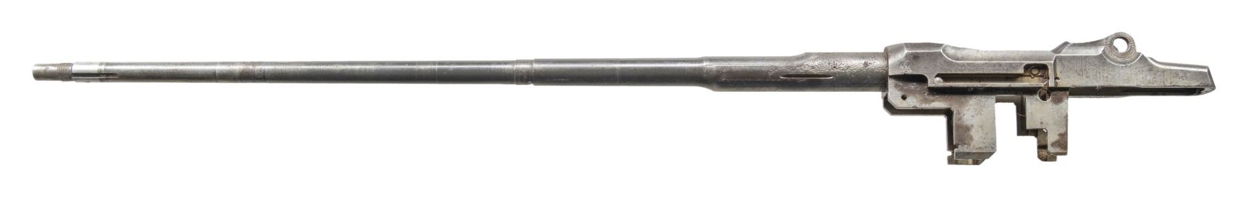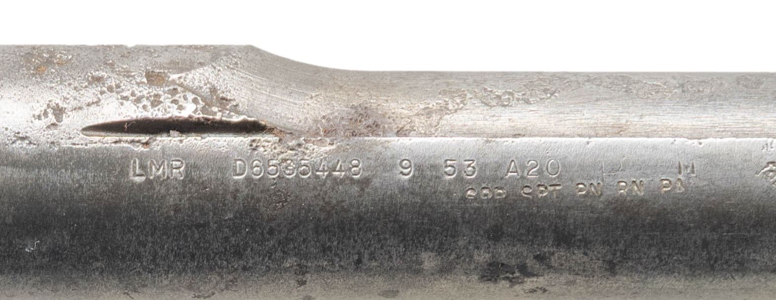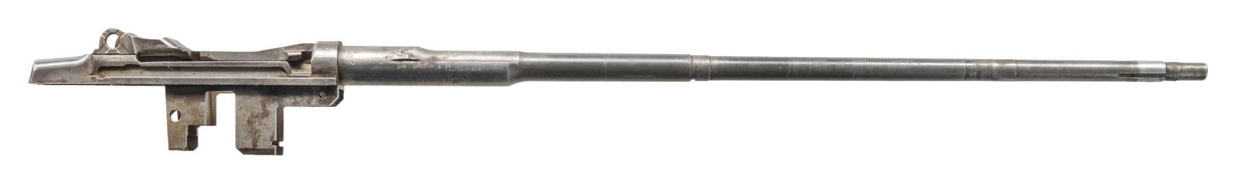 Cal. 30-06. S# 5024182. Bbl. 24". Throat gauges 3.0. Muzzle gauges 4.0. Barrel markings on right side include "LMR 9 53" & import marks. Receiver w/ standard markings at heel has "D6528291-P" at right forward end. Receiver & barrel carry no additional parts. CONDITION: barrel & receiver have extensive wear & areas of oxidation w/ moderate to deep pitting. Fair worn bore turning dark in grooves. (25-3136/RW). MODERN. $200-300.