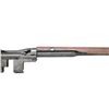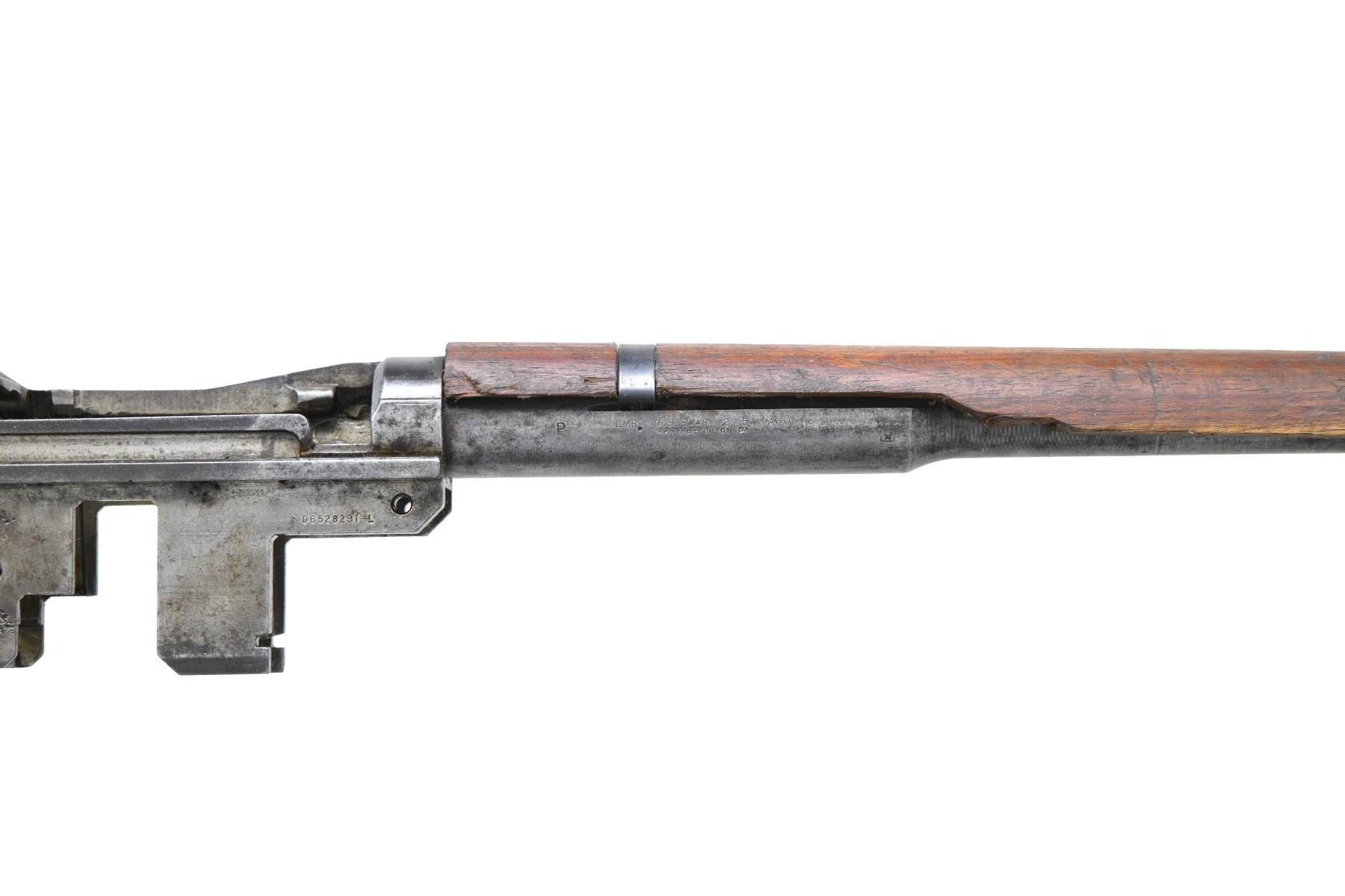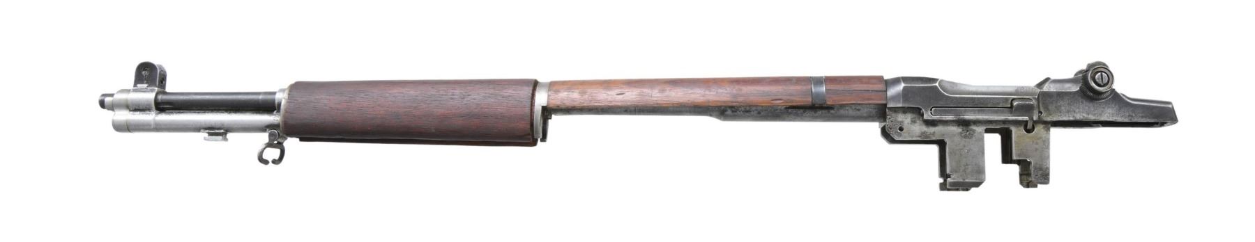 MILITARY RIFLE BARRELED RECEIVER. Cal. 30-06. S# 5113062. Bbl. 24". Marked on right side "LMR2 54". Import marked on right side of bbl. Throat gauges: 4.0. Muzzle gauges: 3.0. T105E1 aperture rear sight. Blade front sight w/ protective ears. Rifle has been partially dismantled leaving the following parts as well as the barreled receiver, rear sight assembly, clip latch assembly, front & rear handguards, gas cyl. assembly & front sight. CONDITION: handguards have moderate wear & staining. Rear handguard has notable crack on left side. Front handguard is partially fitted replacement. Metal is turning overall gray & patina w/ light oxidation & very fine pitting throughout. Gas cyl. assembly is devoid of finish. Dark worn oxidized bore. (25-3001/RW). MODERN. $300-500.