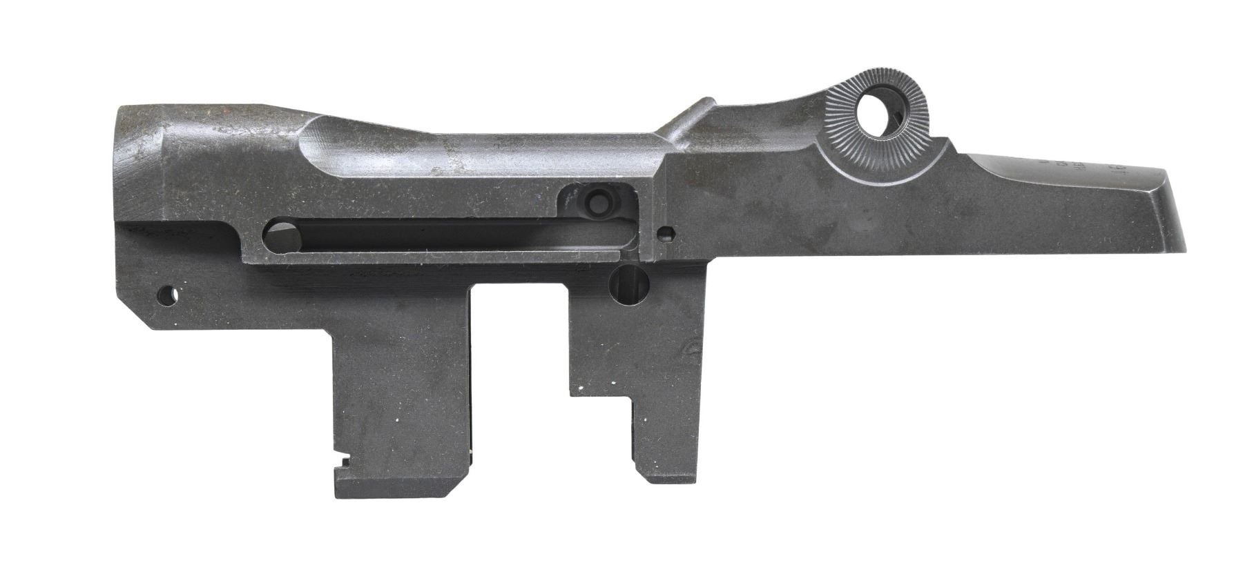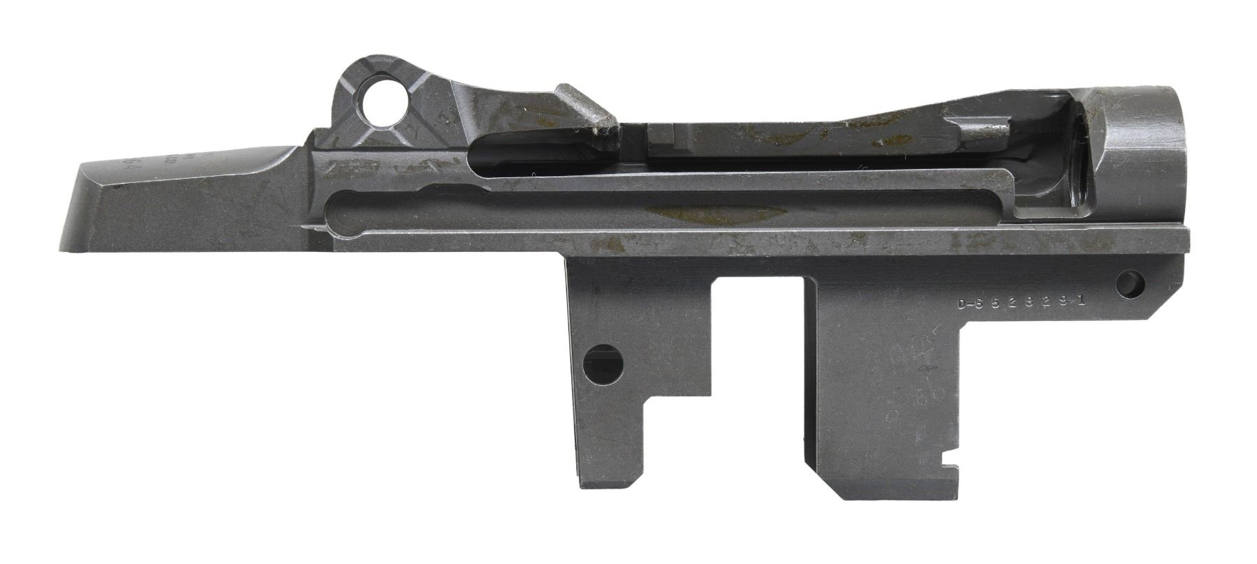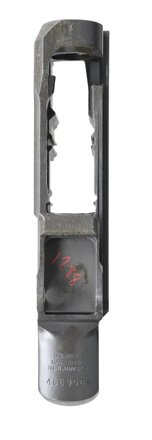 GARAND RIFLE RECEIVER. S# 4669564. Receiver manufactured by Harrington & Richardson Arms and carries the standard markings at the heel. Drawing number at right forward end is "D-6528291". Right front receiver leg is faintly electro-penciled "BA4 / 6-66" indicating an overhaul at the Benicia Arsenal in 1966. Receiver contains no additional parts. CONDITION: receiver is in very good condition retaining nearly all its arsenal rework Parkerized finish. Rear sight notches appear in very good condition. (25-3079/RW). MODERN. $400-600.