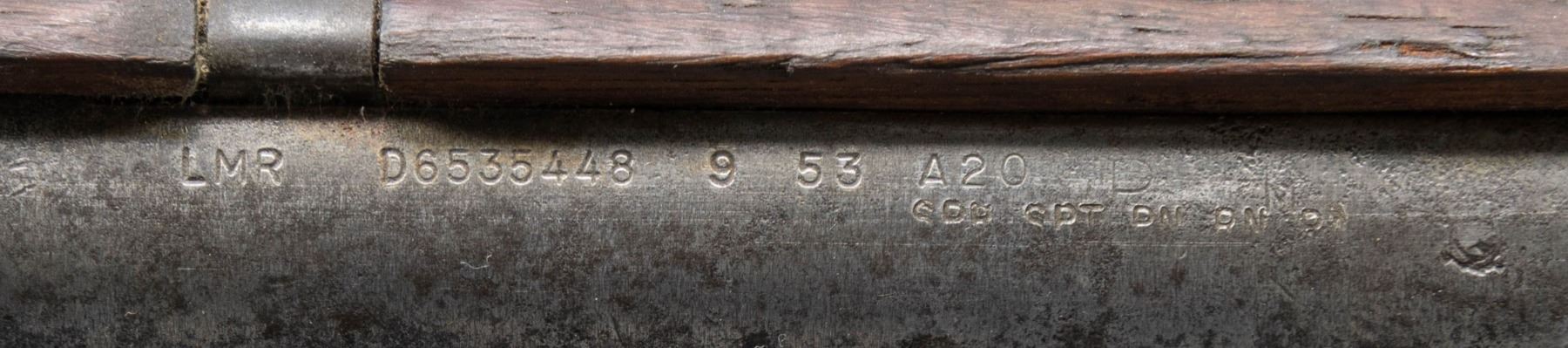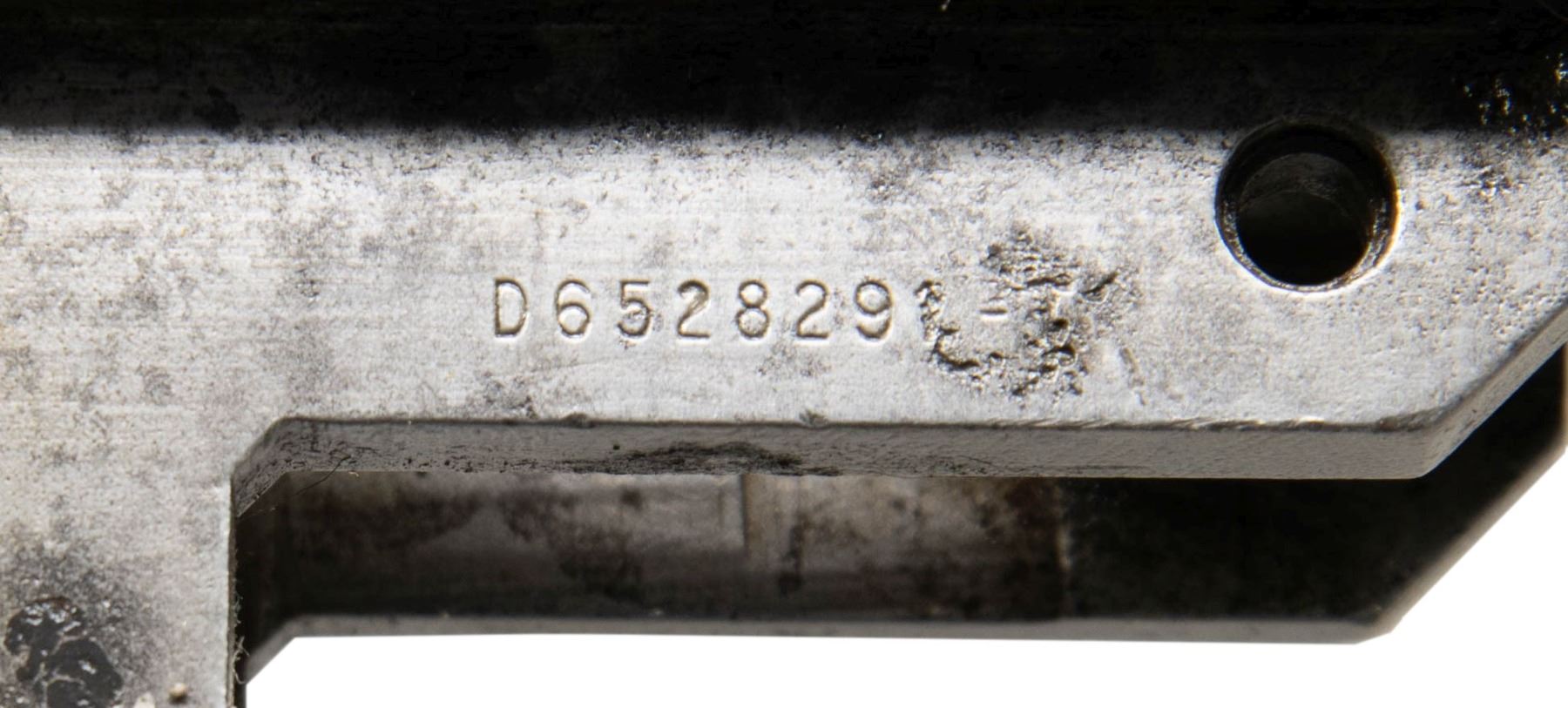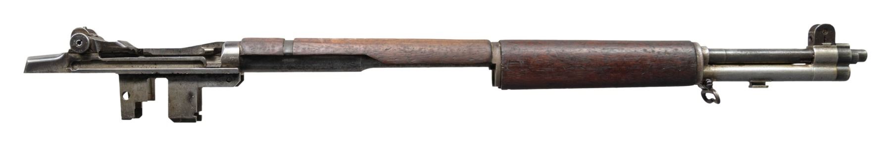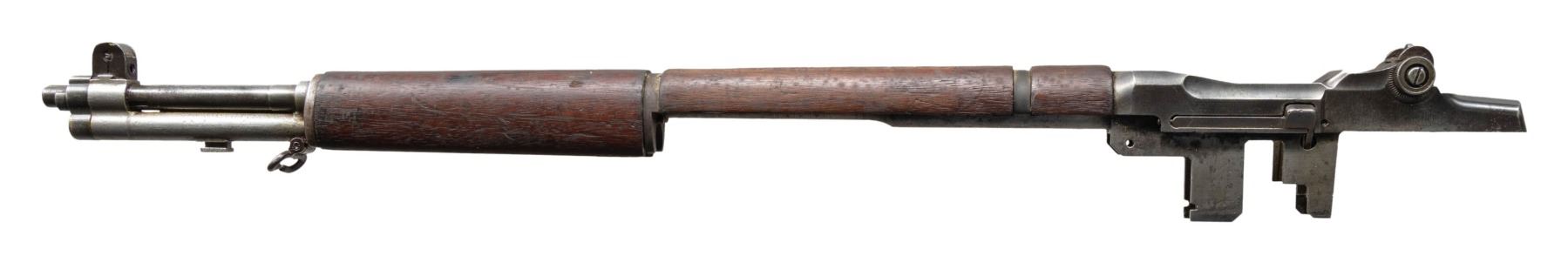GARAND BARRELED RECEIVER. Cal. 30-06. S# 5068661. Bbl. 24". Receiver has standard International Harvester markings at heel & drawing number "D6528291". Receiver is fitted w/ T105E1 aperture rear sight. Clip latch assembly is installed. Barrel has both walnut handguards w/ the associated hardware. Gas cyl. assembly is complete w/ front sight, high hump gas cyl. lock, lock screw & stacking swivel. Throat gauges: 3.0. Muzzle gauges: 7.0. CONDITION: handguards have extensive wear, staining & handling marks, but no visible cracks. Metal has extensive wear, turning overall gray & patina w/ areas of oxidation. Notable pitting at bottom of receiver rails. Bore has worn lands turning dark in grooves. (25-3143/RW). MODERN. $300-500.