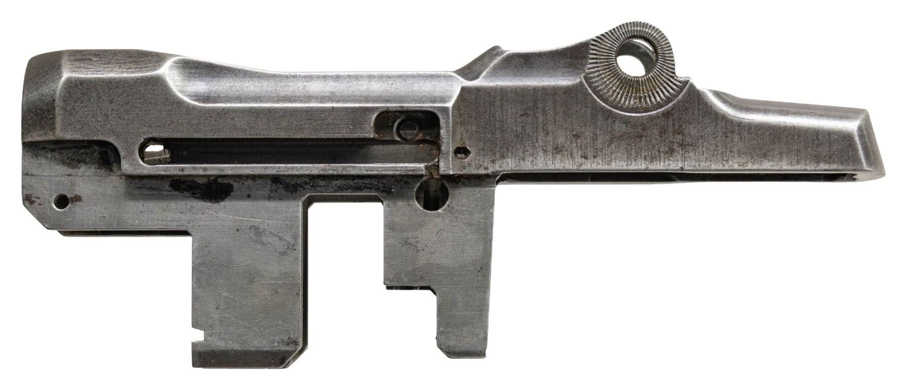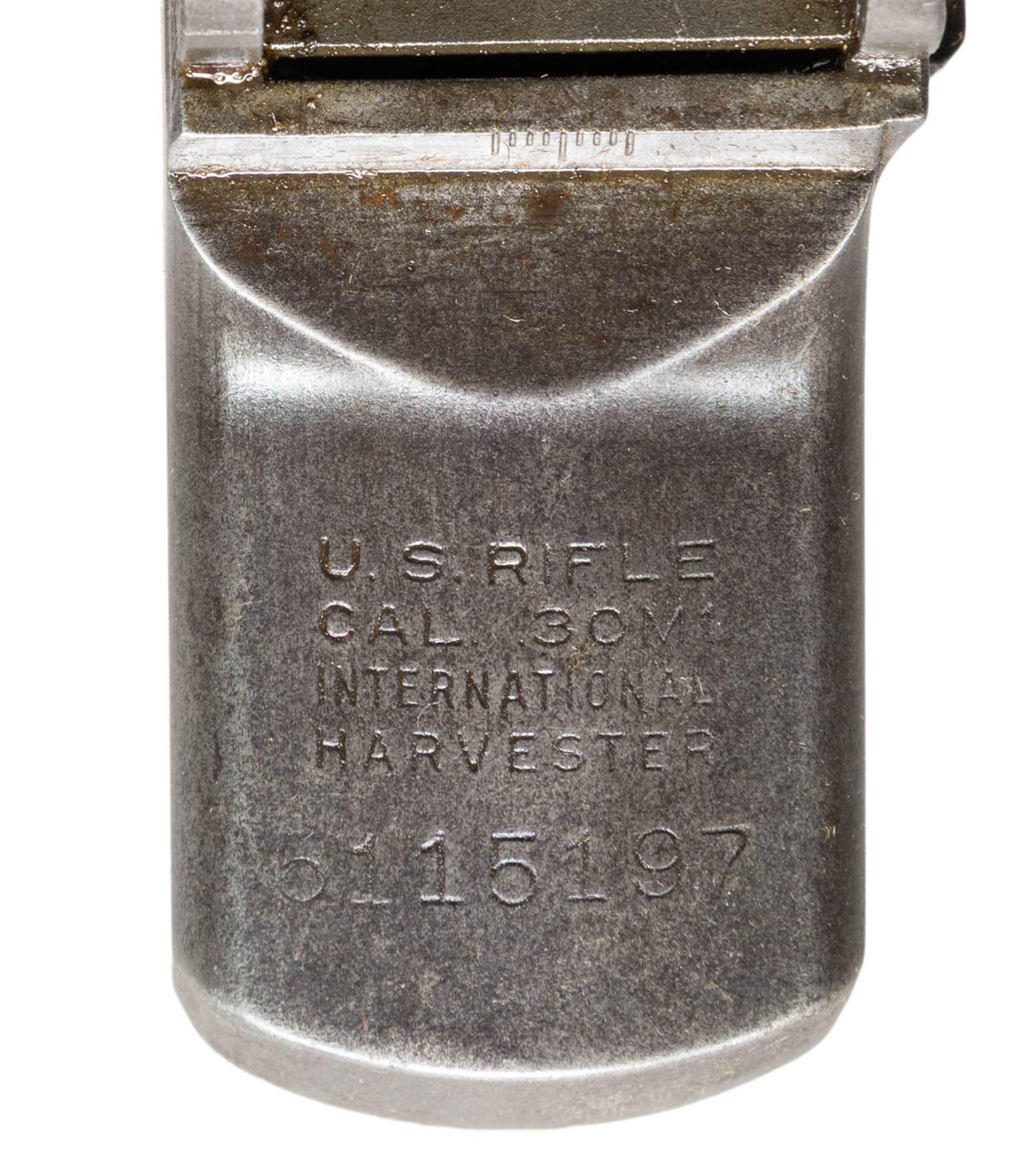 GARAND RECEIVER. S# 5115197. Receiver marked at heel "U.S. RIFLE / CAL. .30M1 / INTERNATIONAL / HARVESTER / serial number". Marked on right forward end "D6528291-X". No parts are present. CONDITION: well-worn receiver turning gray and patina w/ very light spots of fine pitting on front face of receiver ring. (25-2895/RW). MODERN. $250-450.