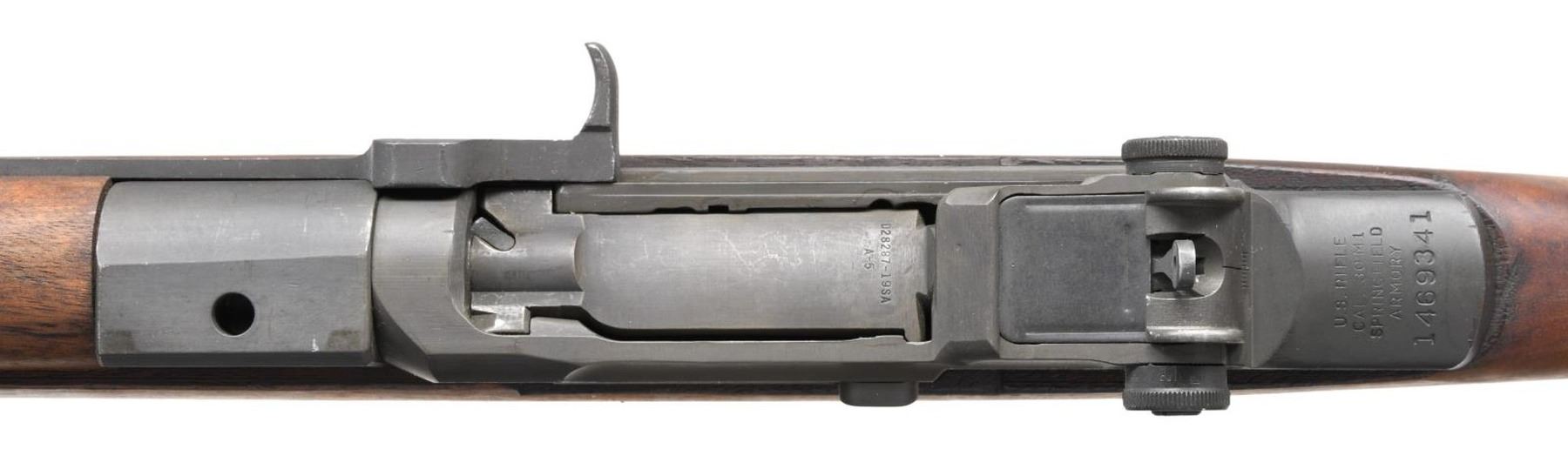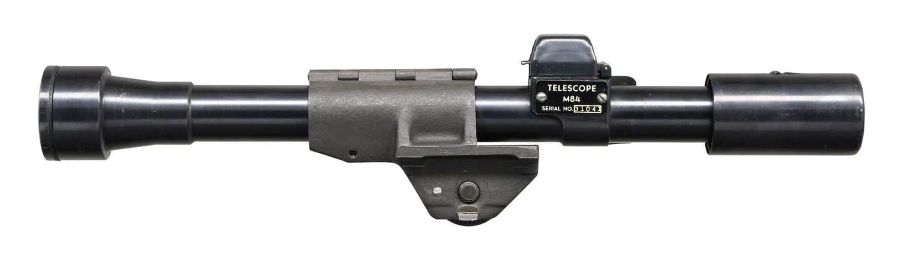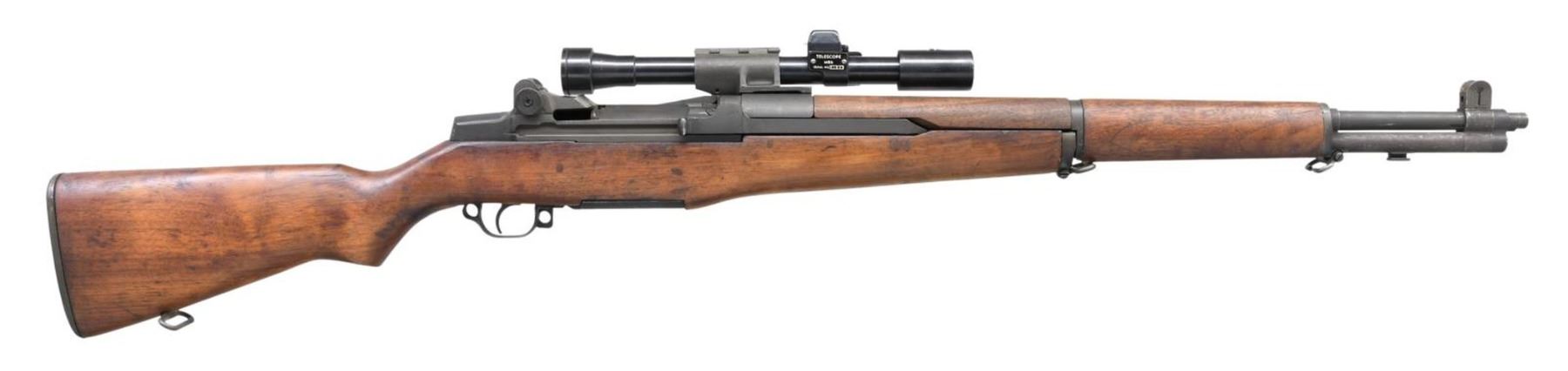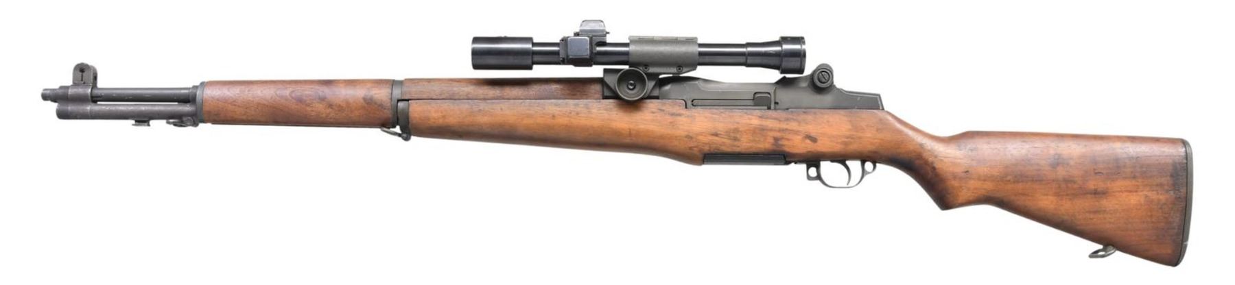 MILITARY SNIPER RIFLE. Cal. 30-06. S# 1469341. Bbl. 24" marked on the right side "S-A-6-52". Throat gauges 1.0. Muzzle gauges .5. T105E1 aperture rear sight. Blade front sight w/ protective ears. All visible parts markings are "SA". The M1D Sniper rifle was designed at Springfield Armory by John Garand in mid WWII but not put into production until the Korean War. This example features a quality reproduction scope mt. The attaching screw has the correct 50 clicks. Original M84 telescopic sight w/ untapered vertical post & horizontal crosshair. Scope nomenclature plate on right side attached by 2 screws is marked "TELESCOPE / (M84) / SERIAL NO. 31041." Flip up turret covers are present. Sliding sunshade is present at forward end. Base appears to be correct arsenal installation. Receiver has correct 2 tone annealed finish. Milled trigger guard has "C-46025-1" drawing no. Walnut stock set. Buttstock is marked on left side behind grip w/ boxed "S.A." overhaul mark & marked under grip w/ encircled "P" proof. Stock has inletted walnut repair at rear of trigger guard, visible only when rifle is disassembled. CONDITION: stock set has light wear, staining plus handling marks w/ arsenal rework type finish. Metal has a large degree of original finish on the receiver while the operating rod, barrel & gas cyl. have a dark arsenal rework parkerization. Blued steeled telescope has light wear & scattered tiny scratches. Optics appear clear & serviceable. Very good shiny bore w/ sharp lands. (23-5722/RW). CURIO. $1,200-1,800.