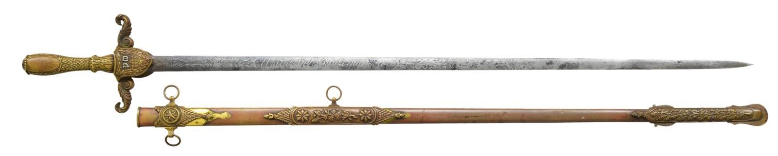 Overall length: 33". Blade length: 28". Blade has etching over 2/3 of its length with various foliate, patriotic and military motifs including a panel that reads, "United States Pay Department". There is an etched leaf near the ricasso that reads, "W. H. HORSTMAN & SONS PHILADELPHIA". Gilded brass hilt with large shield languets. Front languet has the silver letters, "P D" above 13 stars. Curled up leaf embellished crossguard. Solid brass grip with eagle in oval on 1 side. Finial is missing. Gilded brass scabbard with leaf and star embellished mounts. CONDITION: blade has a medium gray mottled patina. Etching remains clear. Hilt is loose and retains only traces of original gilded finish. As stated, pommel finial is missing. Scabbard is undamaged but only shows gilding under the mounts. Mounts are slightly displaced and all attachment screws are missing. (02-17656/BF). $1,800-2,500.
