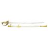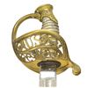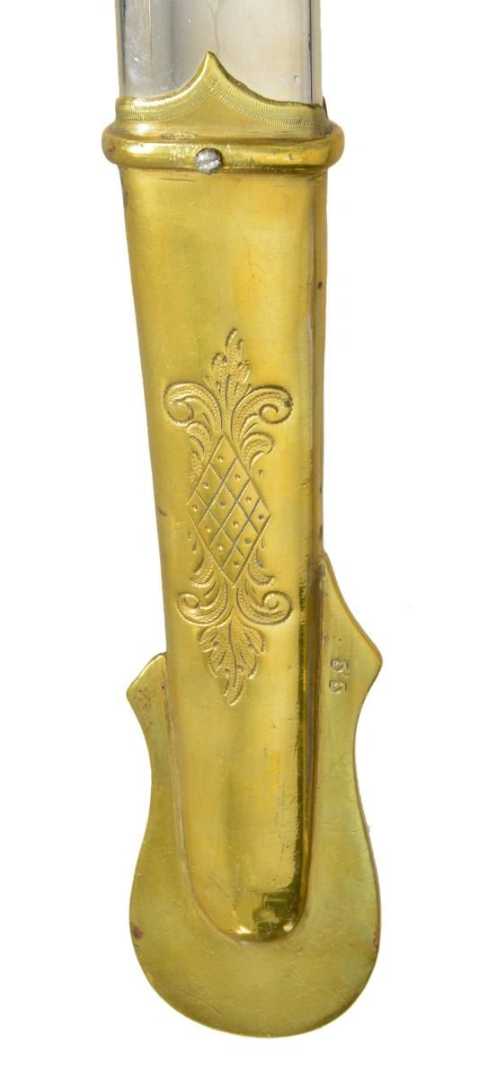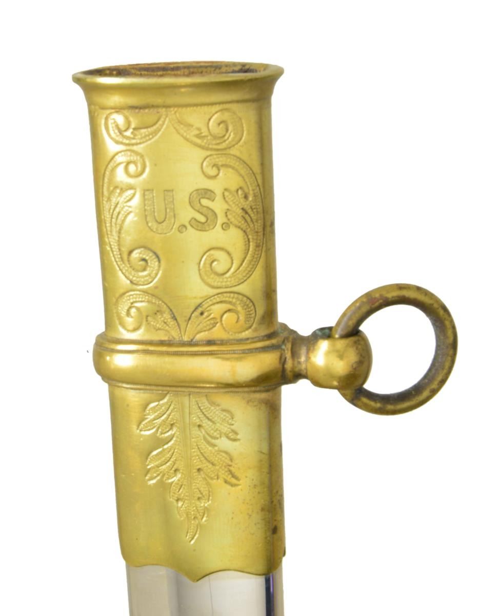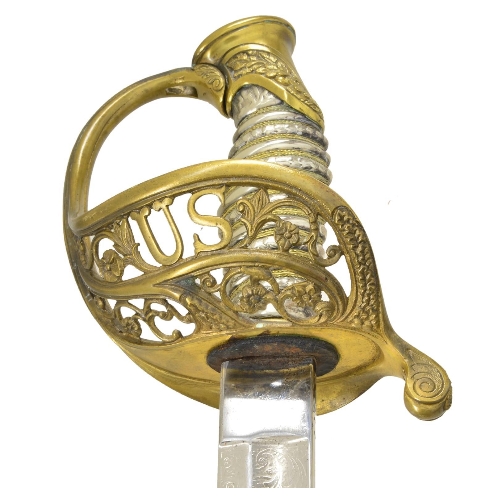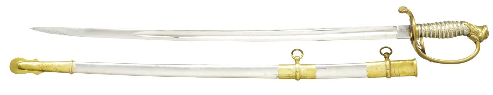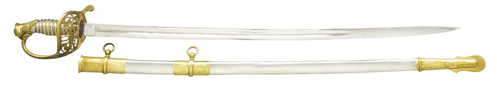 OFFICERS SWORD BY CLAUBERG. Overall length: 39 1/4". Blade length: 31 3/4". This is a beautiful presentation grade, silver gripped, American officers sword of the Civil War era. However, the entire blade & body of the scabbard have been heavily plated. Blade has a single wide fuller w/ a single narrow 14" fuller above. Blade is etched over 1/2 its length w/ military & foliate motifs. Ricasso is stamped, "W. CLAUBERG (knight) SOLINGEN". Gilded brass hilt w/ ornately cut out foliate motifs & "US" in guard. Highly embellished pommel & exceedingly attractive solid silver grip. Gilded brass mounted iron scabbard. Top mount has a "US" one 1 side & an unengraved scroll for presentation on the other. CONDITION: as stated, the blade & scabbard body have been heavily plated. The etching is somewhat obscured by the plating. The hilt is quite nice w/ areas of original gilding. Grip is undamaged. Scabbard mounts show only traces of original gilding. This fine sword would benefit greatly from restoration work removing the plated finishes. (02-17530/BF). $2,000-3,000.