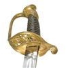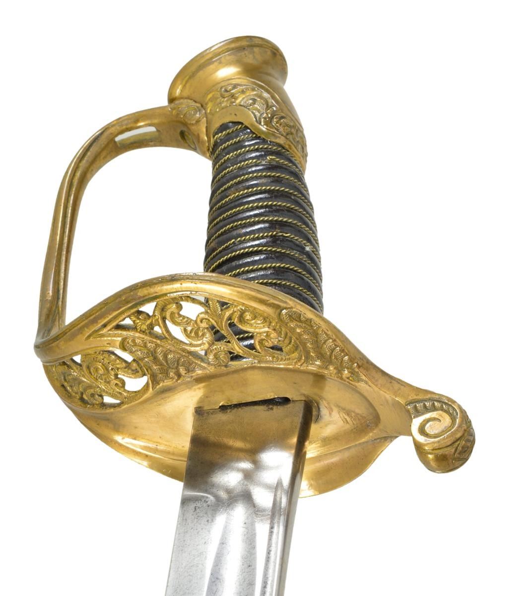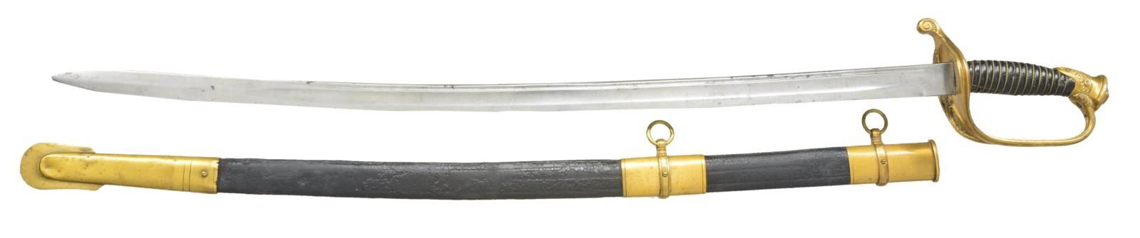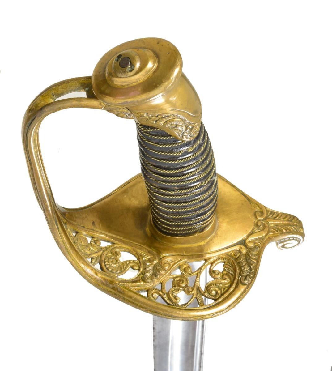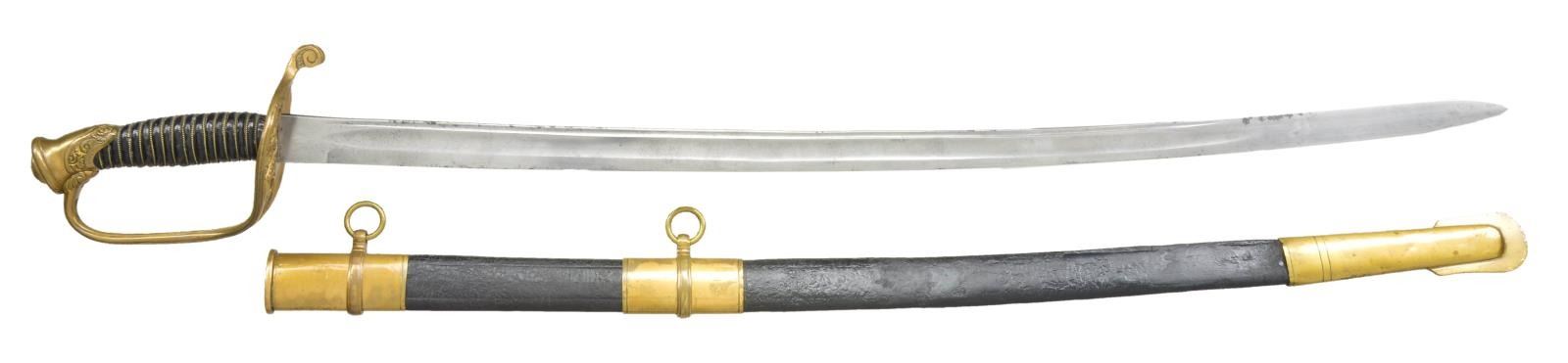 Overall length: 37". Blade length: 30 3/4". This is a fine example of an import non-regulation M1850 Foot Officer's sword. The sword is unsigned but possibly the work of sword importer & assembler, Saurbier of Newark, NJ. The blade has a single wide fuller topped by a single narrow fuller & is etched over 2/3 of its length w/ military, patriotic & foliate motifs. Gilded brass hilt w/ ornately pierced guard & embellished pommel. Wire wrapped leather grip. Gilded brass mounted leather scabbard. CONDITION: blade has a light gray cleaned finish w/ minor nicks to the edge of the blade. Etching is a bit light. Hilt shows only traces of original gilding. Leather & wire are complete & undamaged. Scabbard mounts show minute traces of original gilding. Leather shows crazing & a likely repair 9" up from the tip. Hilt & scabbard mounts appear to be coated w/ a preservative. (02-17533/BF). 700-1,000.