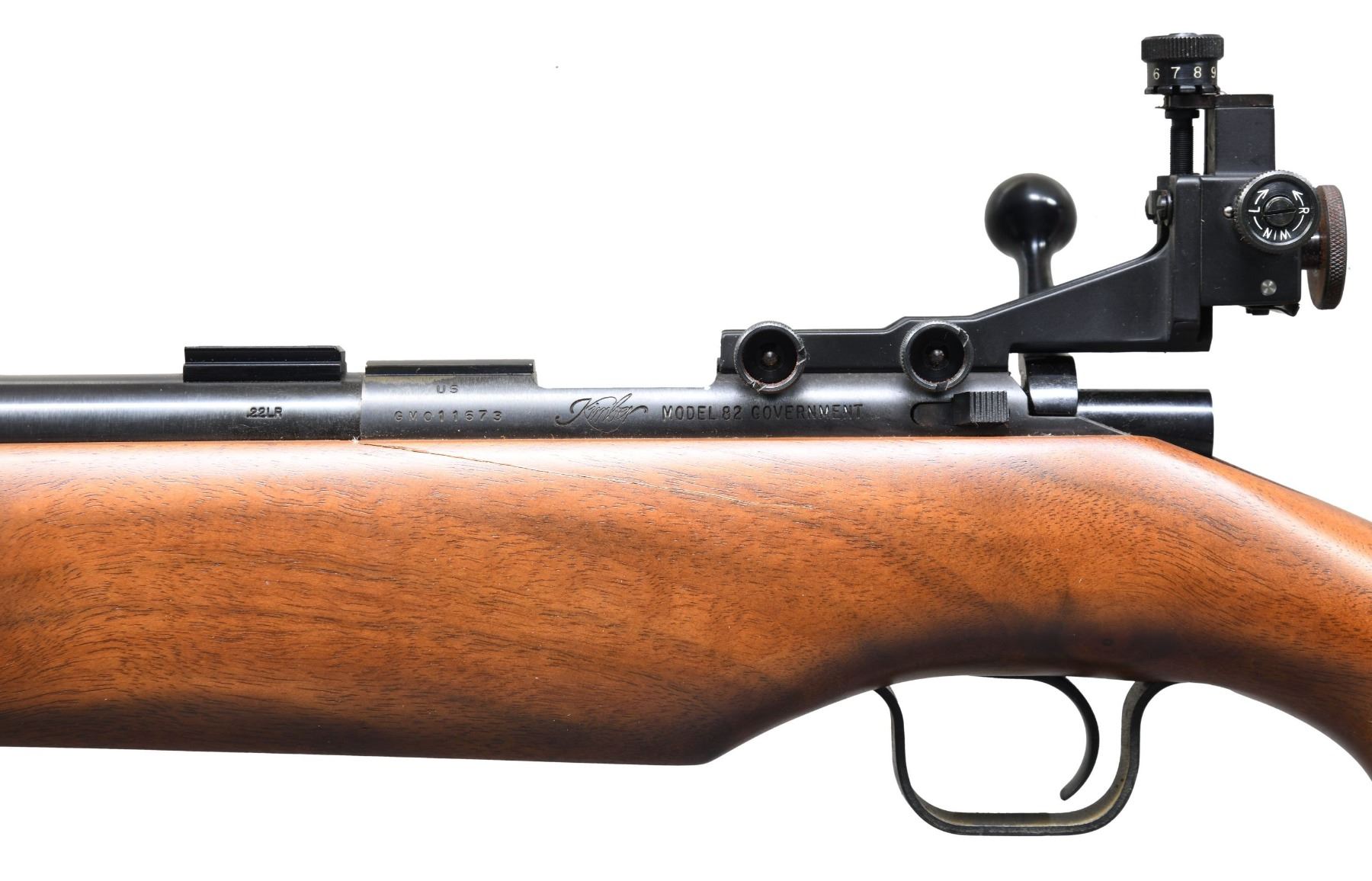 BOLT ACTION RIFLE. Cal. 22 LR. S# GM011673. Bbl. 25 1/8". Model 82 Government bolt action rifle mfg. by Kimber of Oregon. Top of the heavy rnd. bbl. is marked "KIMBER OF OREGON, INC, CLACKAMAS, OREGON, U.S.A." and features dovetailed scope bases. Left side of the grooved receiver is marked "US" above the S#, followed by standard factory markings. Metal components exhibit a blue finish overall, with the bolt body being polished in-the-white. 1-piece plain wood target stock with adj. recoil pad and accessory rail on underside of forearm. Unmarked post globe front sight with receiver mounted Kimber adj. aperture rear sight. CONDITION: metal components retain the vast majority of their original factory blue finish, showing some scattered spots of light surface and a few superficial handling marks overall. Receiver exhibits some spots of wear / finish loss on the top and left side on the top and left side of the optic groove. Mirror bore, retaining well defined rifling throughout. Stock shows a some light superficial handling marks with a few notable scratches on the left side. (25-3716/MLW). MODERN. $500-800.