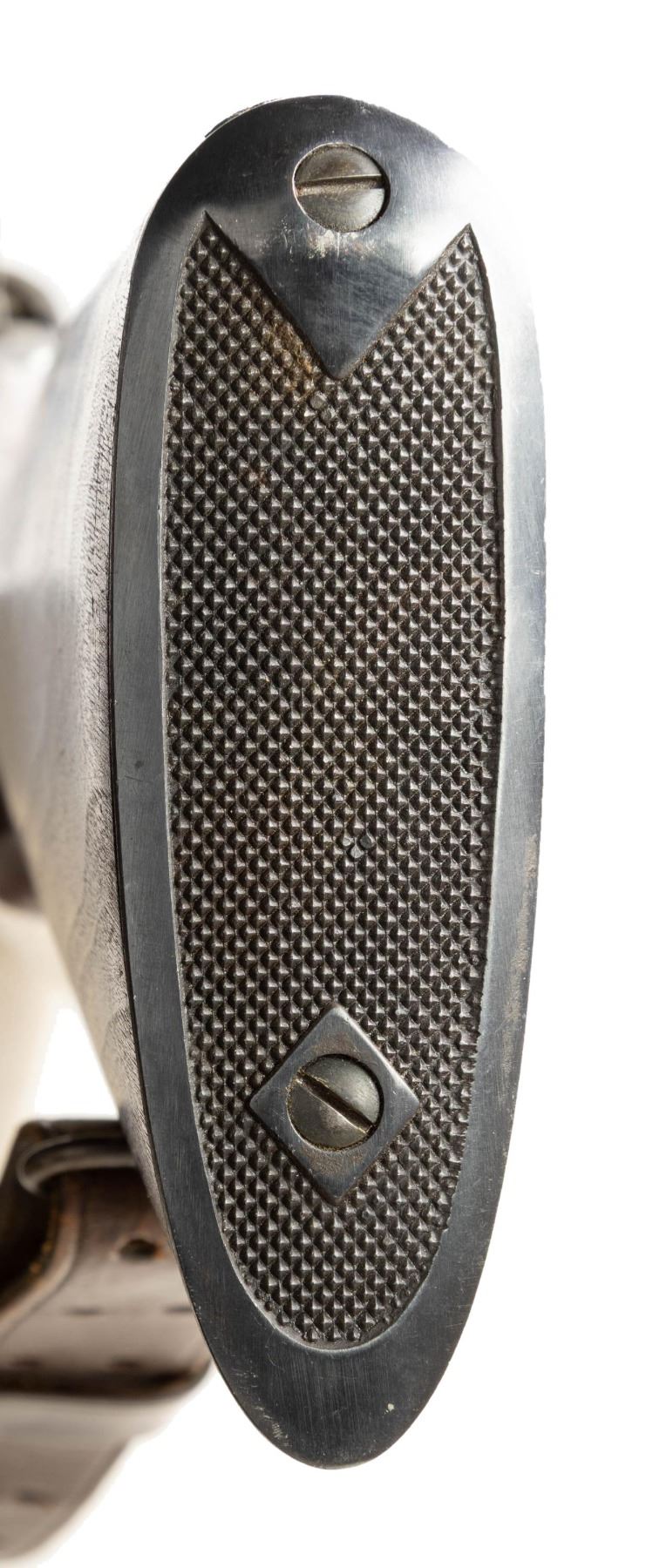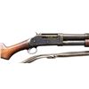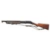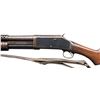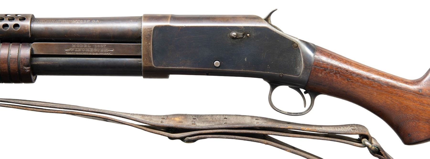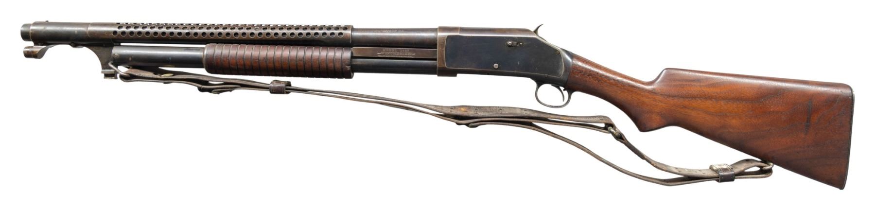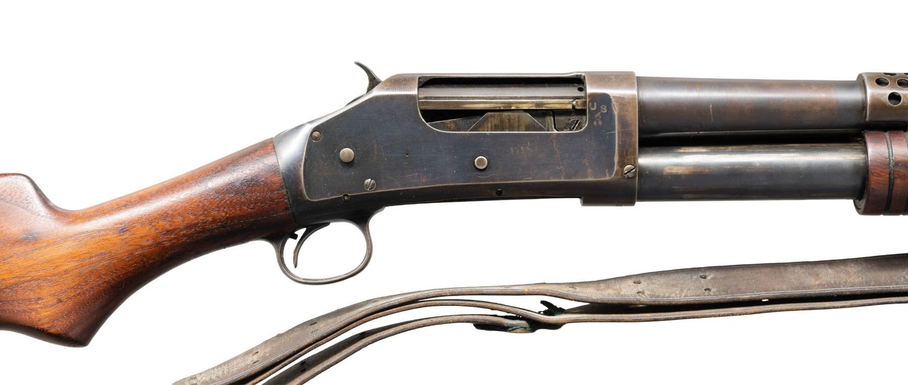 SHOTGUN. Cal. 12 ga. S#. E680545. bbl. 20" CYL bore. Bayonet lug with 6 row handguard. Tubular mag. Solid frame action. Right side is marked "US" over a flaming bomb ordnance mark. Grooved forend and pistol grip walnut stock with checkered steel replacement buttplate. Rock Island Arsenal marked leather sling has 1903 date. S# indicates 1919 mfg. CONDITON: 70% lightly faded blue showing carry & slide wear. Forend shows normal wear with a small chip along rear edge. Sanded & refinished stock is cracked thru the head. Sound mechanics. Generally bright bore shows spots of light pitting. (25-4564/DS). CURIO. $5,000-7,000.