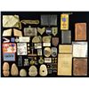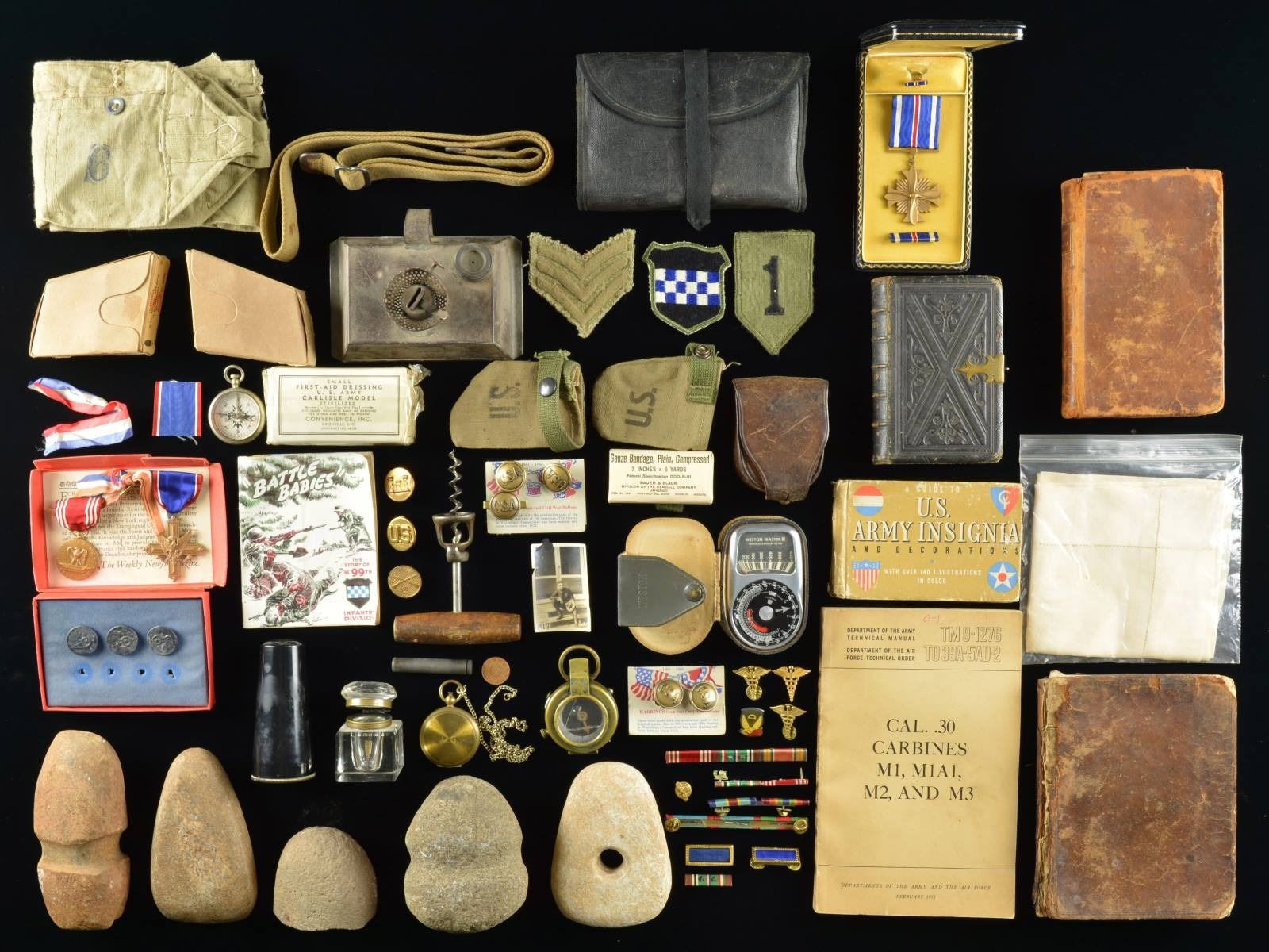 This varied lot includes 1 box of approximately 50 Native American projectile points. A few points are damaged but most are intact. / 1 Early book titled “Geography Made Easy” published in Boston in 1804. / 1 Framed photograph of a military gallows in Washington, DC. / 1 Early book titled “PLAIN DOCTRIN OF THE JUSTIFICATION OF A SINNER IN THE SIGHT OF GOD" published in 1700. Front cover is detached. / 1 Early Bible written in French, Latin, and other languages. / 1 Army tech manual titled “CAL. .30 CARBINES M1, M1A1, M2 AND M3” published in 1953. / 1 U.S. Army first aid dressing. / 1 Leather compass pouch. / 1 Universal exposure meter by Westin. / 1 Distinguished flying cross in original case. / 1 Oil lamp with no globe. / 1 Masonic collar. / 1 Bible published in 1864. / 1 Portable pocket microscope. / 1 Army distinguished service cross. / 5 Stones possibly of Native American origin. / 1 Tattered 45-star flag. / 1 Small U.S. Army insignia & decorations book published in 1941. / 3 Reproduction Revolutionary War buttons. / 1 Army good conduct medal. / 1 Compass with broken glass. / 7 U.S. medal bars. / 8 Pieces of U.S. insignia. / 1 Crystal inkwell. / 1 Green cotton 6-pocket disposable bandoleer. / 1 Plotting compass. / 1 Early corkscrew. / 2 Boxes of 8mm Mauser ammunition dated 1938. / 2 Military compasses. / 2 Divisional patches. / 2 Modern production “CSA” cufflinks and 1 tie bar. / 1 Oiler. / 7 Pieces of miscellaneous small militaria. / 2 Modern production “CSA” clip-on earrings. / 1 Early handkerchief. / 1 Small pamphlet titled “BATTLE BABIES”, the story of the 99th infantry division. / 2 Green canvas muzzle covers marked “US”. / 1 Khaki sling. CONDITION: books generally show moderate to heavy wear except as noted. Modern items appear unissued. Other pieces show light to moderate wear. (02-16889/BF). $200-400.