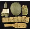 MILITARIA. This large group consists of many cartridge belts & other militaria & includes 2 WWI 10 pocket khaki colored canvas cartridge belts. / 2 WWII 10 pocket OD colored canvas cartridge belts. / 1 Post WWII 10 pocket dark OD canvas cartridge belt. / 1 USMC WWII cartridge belt with 6 smaller pockets & 2 large pockets. / 4 M1903 1st pattern Mills 9 pocket cartridge belts with subdued eagle snaps. / 2 M1903 2nd pattern Mill's 9 pocket cartridge belts in OD with subdued eagle snaps. / 1 WWII BAR 6 pocket light OD cartridge belt. / 1 WWI era cartridge belt with 2 large pockets & 2 Small pockets in khaki canvas with rimmed eagle snaps. / 1 WWI period cartridge belt with 10 medium size pockets. Khaki canvas with rimmed eagle snaps. / 2 Dewat US Pineapple type hand grenades. / 1 Leather pouch marked "SEARS 1943". / 1 Gun oiler. / 1 M1 helmet camouflage cover. / 1 M1 helmet net cover. / 2 Canteens with black enameled surface. / 3 Aluminum canteens. / 1 Plastic canteen. / 2 Aluminum canteen cups. / 1 Rear seam, swivel bail M1 helmet with WWII liner & net cover. CONDITION: all items show light use & remain in serviceable condition with no noted problems. (02-16427/BF). $1,000-1,500.