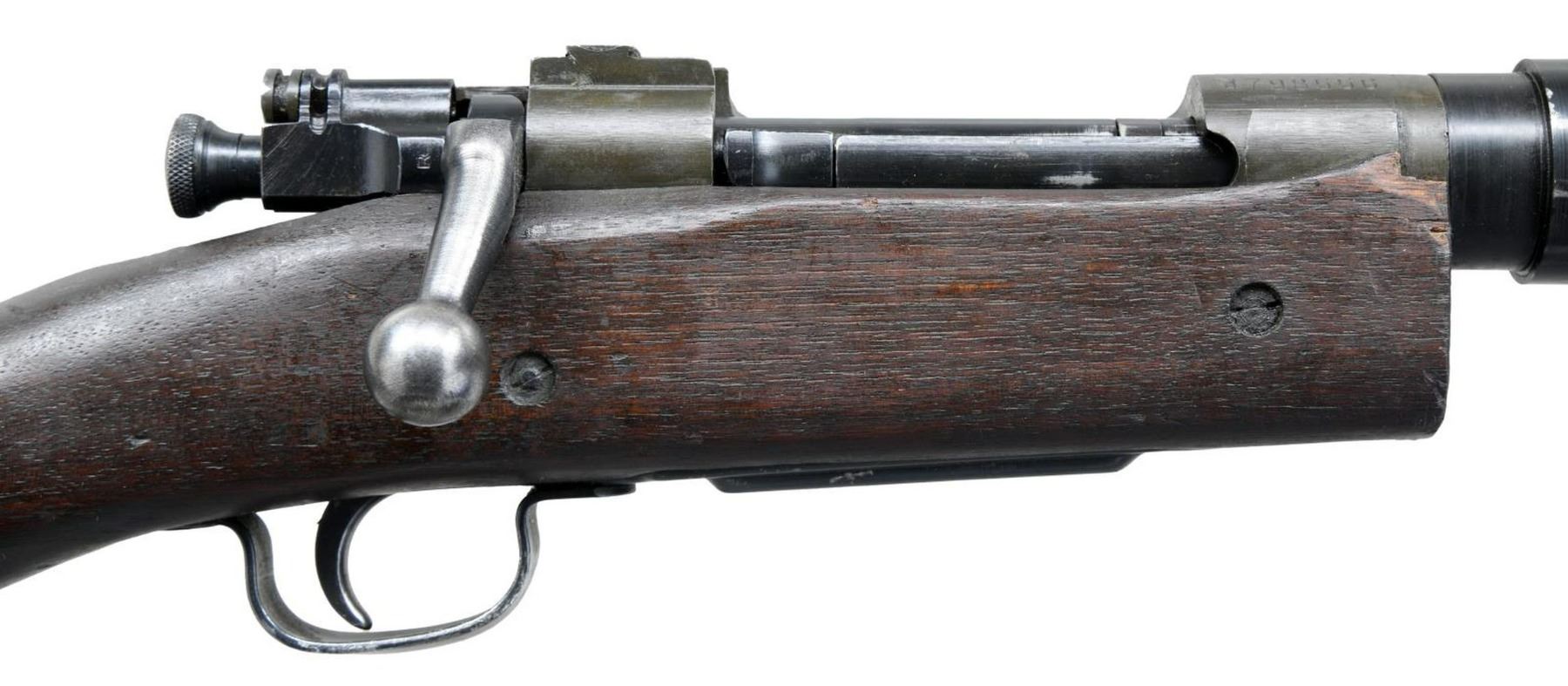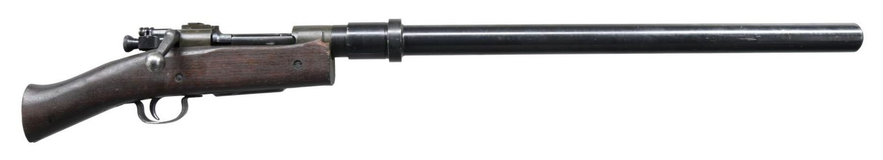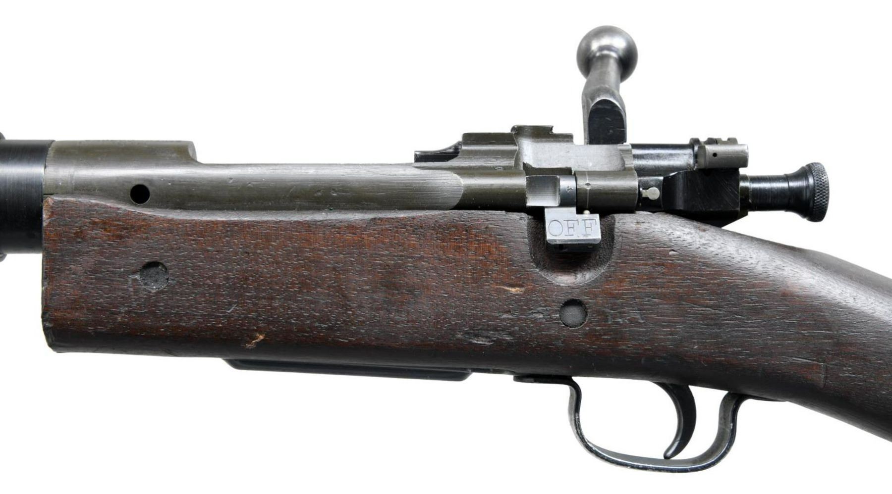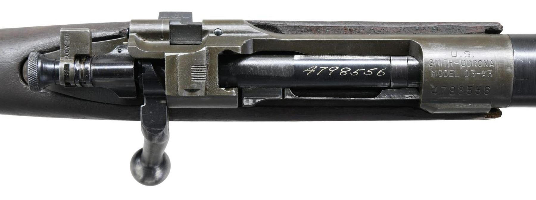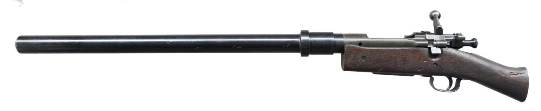 1903A3 BOLT ACTION RIFLE. Cal. 30-06. S# 4798556. Bbl. 22". Bottom of bbl. marked "HFG", "1971", '7553795", "9805" & S/N 0062". No sights fitted. Bolt is electropencil matching numbered to receiver. This device was invented by Dr. F.W. Mann to test accuracy from different ammo, while eliminating the chance for human error. These Mann devices were made in limited numbers & used by both government arsenals & commercial ammunition makers. Safety not engaging may require attention. Walnut stock w/ two bolts. Forend & butt stock were removed. CONDITION: stock has a couple chips, a couple gouges, scattered dings & handling marks. Metal retains 85% arsenal blue & parkerizing w/ a few dings, some light oxidation, scattered silvering & fading. Very good plus bright bore. PROVENANCE: From the estate collection of Thomas J. Mulligan. (23-1214/MJC). CURIO. $700-1100.