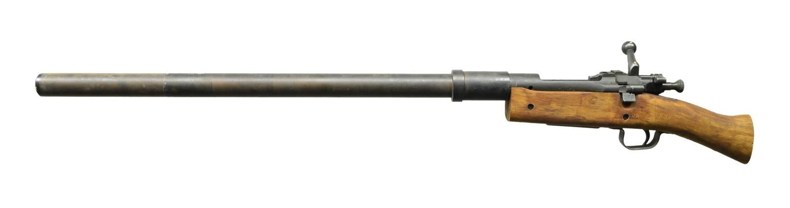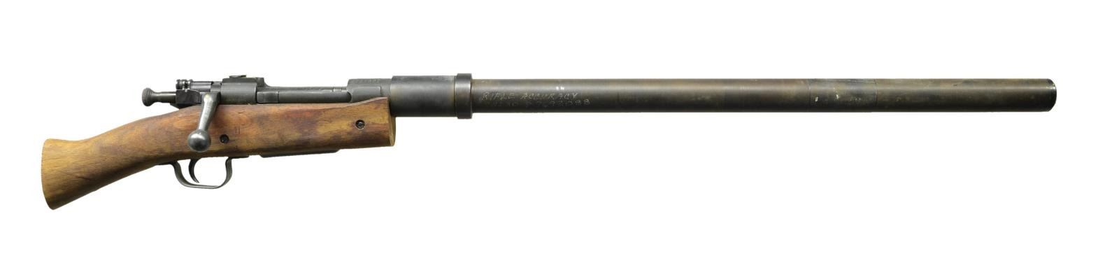 CORONA MODEL 1903-A3 BOLT ACTION RIFLE RECEIVER AND REMINGTON MARKED HEAVY BARREL. Cal. 30-06. S# 4727807. Four grooved 24-1/8" bbl. marked on lower left side “REMINGTON ARMS CO. INC. ILION N.Y. MADE IN USA” “346” & “859330?”. Marked on right side in electro pencil “RIFLE ACCURACY CAL 30” “?” & “7692088”. No sights are fitted. Receiver bridge has standard inverted dovetail rear sight mount. These accuracy test devices were named for famed ballistics experimenter Dr. Franklin W. Mann & used his system of a massive bbl. fitted w/ concentric rings to slide in a “V” rest in order to test the accuracy of ammunition. These bbls. & devices were used in both Army ordnance & civilian ammunition plants including Frankford & Springfield Arsenals & Winchester Repeating Arms dealing w/ government contract ammunition production. Information on these unique devices may be found in “The Springfield 1903 Rifles” by Brophy. Receiver is marked “U.S. SMITH-CORONA” & “MODEL 03-A3”. Rifle is fitted w/ Remington marked bolt & bolt sleeve. Bolt is electro pencil numbered to match. Unmarked mag. cutoff. Lg. bow Remington type stamped trigger guard. Bbl. made w/ cylindrical portion ahead of receiver ring measuring 2-1/4" long & 1-1/2" in dia. followed by 1/2" ring approx. 1-5/8" dia. Balance of bbl. measures 20-5/8" long & 1-1/4" in dia. Rifle fitted w/ the middle section of a walnut stock marked on left side “RA” “crossed cannons” & “FJA”. Stock section is approx. 12-1/2" overall extending rearward from receiver ring to the stock nose area. 2 recoil bolts. Stock has little or no finish. UNATTACHED ACCESSORIES: matching protective wrapping labeled “Rifle Cal 30 Accuracy” & “NFSN” dated “6-72”. Wrapping is in fair condition. CONDITION: abbreviated stock has light wear & staining. Markings are faint. Metal has lg. degree of original Parkerized finish w/ wear & staining plus tiny scattered areas of white paint. Muzzle appears to have been recrowned. Near excellent shiny bore. (22-4208/RW). CURIO. $1,200-1,800.