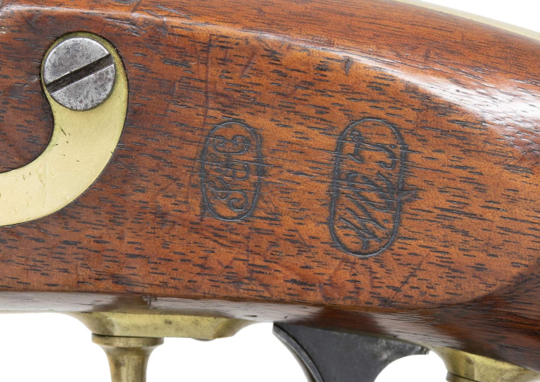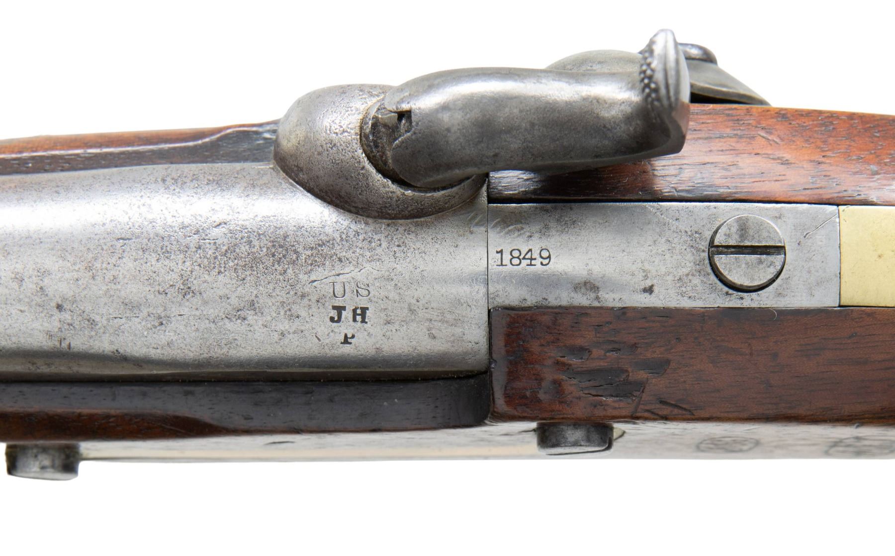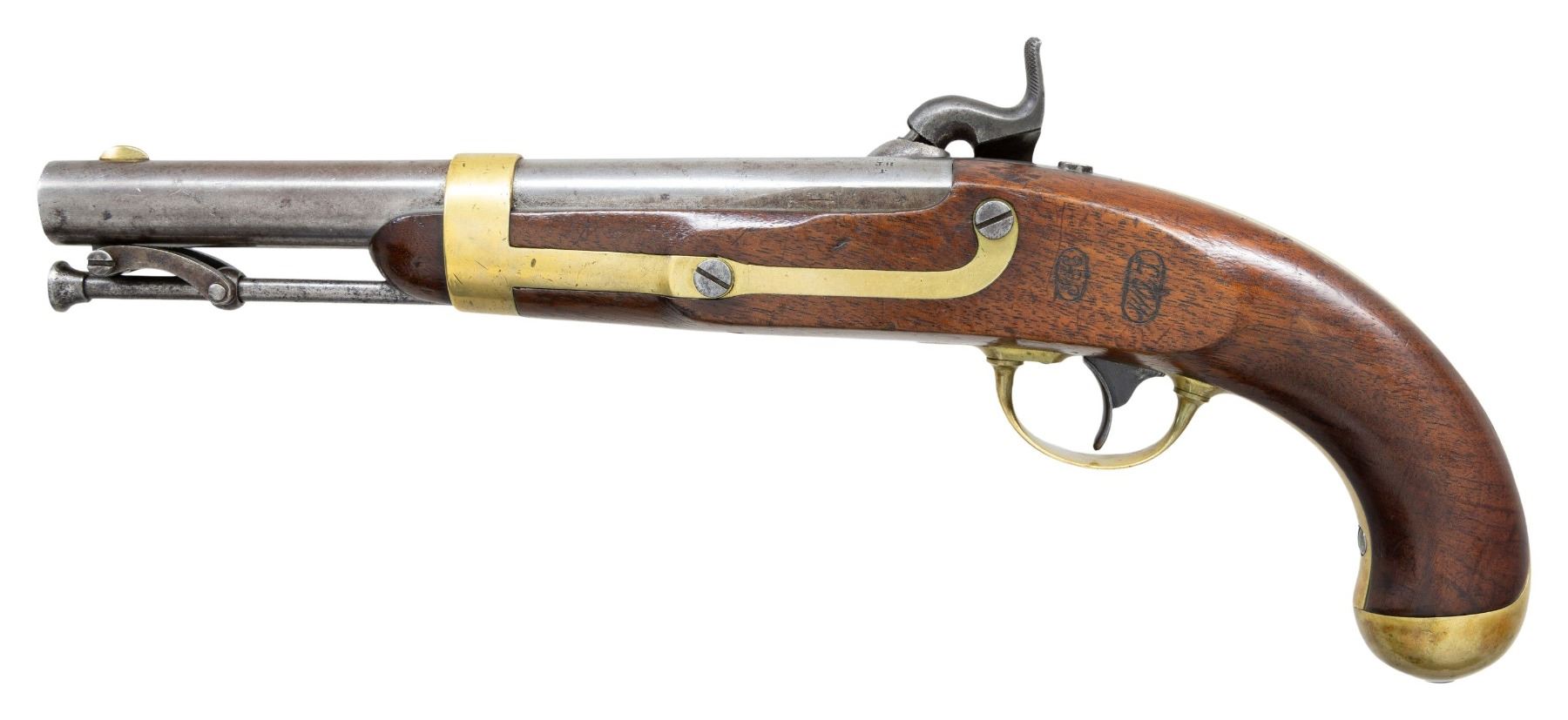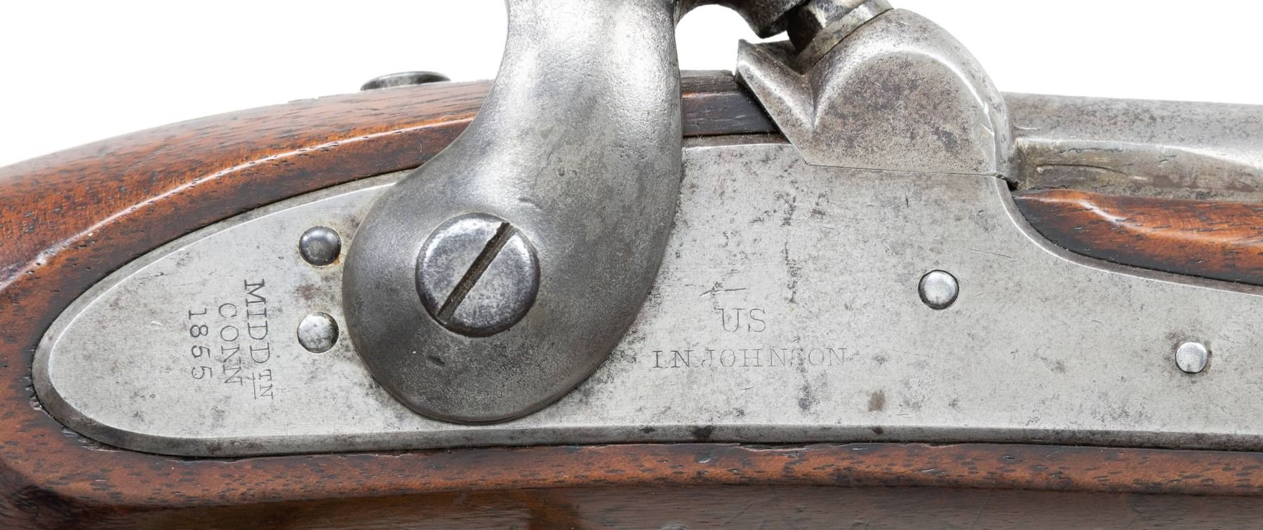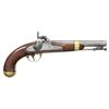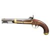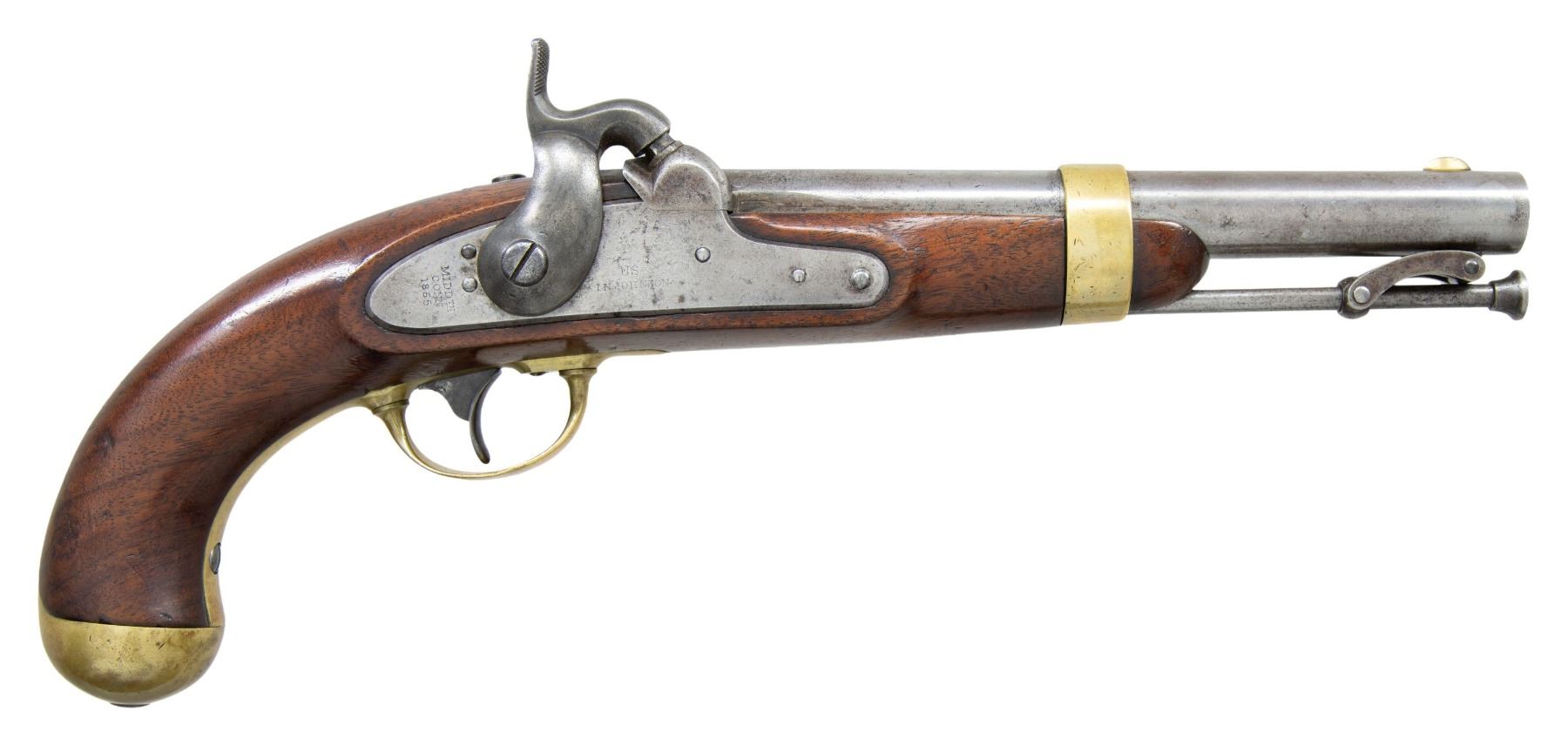 PERCUSSION PISTOL. Cal. 54. NSN. Bbl. 8". Pistol assembled using mixed parts. Inspector's marks present only on barrel & left side opposite lock. Brass blade front sight. Barrel is marked on top left at breech "US / JH / P". Tang is marked "1849". Lockplate is marked in-front of hammer "US / IN JOHNSON". Marked on tail of lock "MIDDTN / CONN 1855". Stock on left side has two inspector's cartouches, one "WAT" is William Thornton. The other cartouche is "JJC". Pistol is brass mounted. Barrel band has strap extension joining sideplate. Steel ramrod w/ swivel. Flat lockplate w/ beveled edge. Blued trigger. Walnut stock. CONDITION: stock has moderate wear & handling marks w/ added finish. Metal is finished bright. Brass parts have moderate wear w/ the beginnings of patina. Steel parts turning gray w/ wear & small spots of oxidation. Lock has crisp correct function. Bore has lighter oxidation w/ fine shallow pitting throughout. PROVENANCE: Estate Collection of Nicholas Apergis. (01-27413/RW). ANTIQUE. $700-1,000.