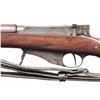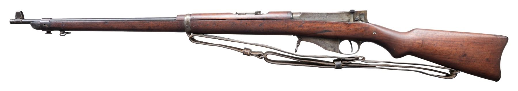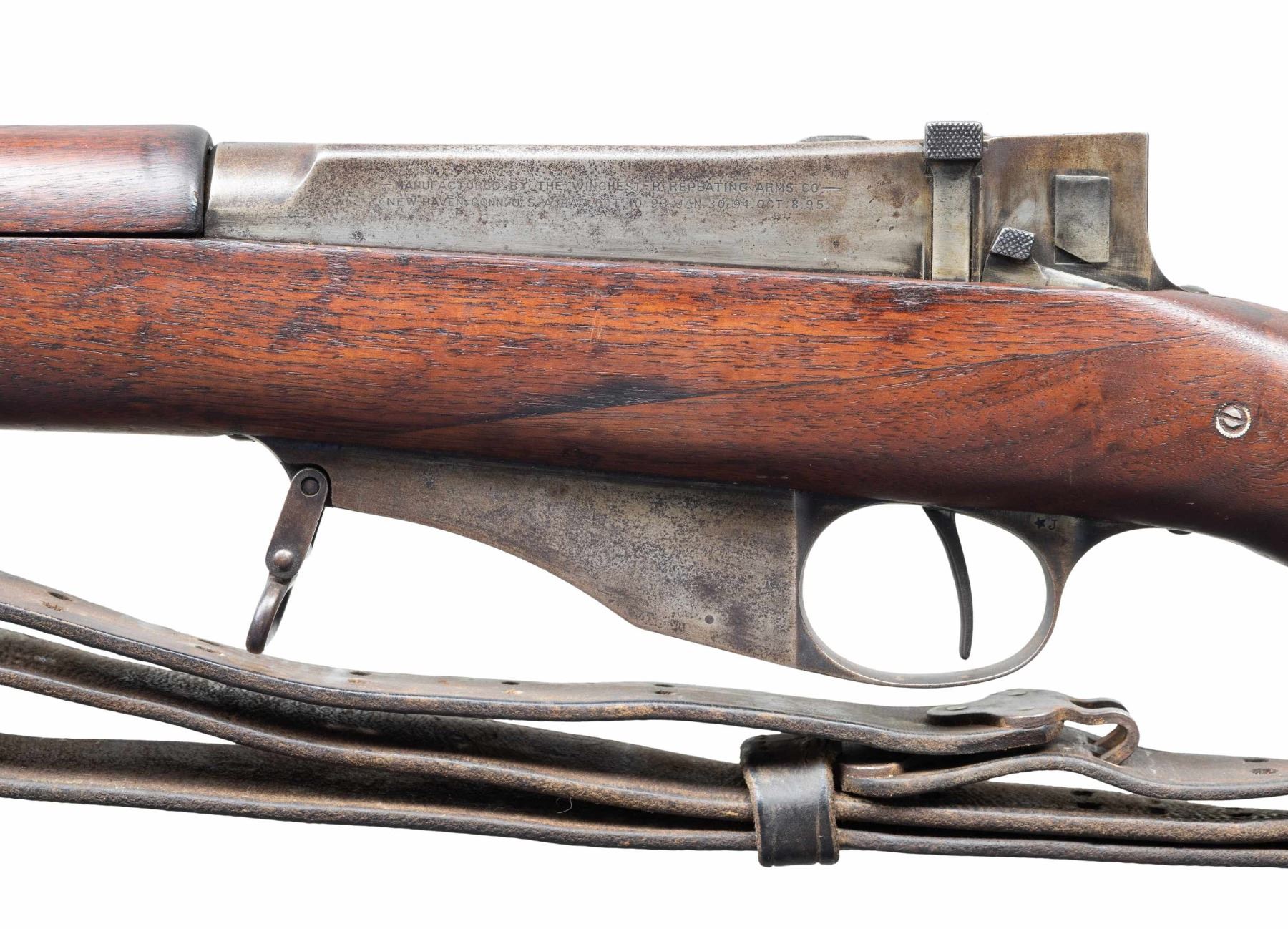 STRAIGHT PULL BOLT ACTION RIFLE. Cal. 6mm Lee. S# 4676. Bbl. 28" rnd. Hooded blade front sight with graduated leaf rear sight. Early bolt action rifle designed by James Paris Lee, mfg. rights were obtained by Winchester primarily to fill orders from the U.S. Navy. The Navy designation was "The Model 1895 Musket". Receiver has patent dates of 93, 94, & 95. Clip fed 5 rd. box mag. Band fastened pistol grip walnut stock with hand guard and trapdoor musket buttplate. Leather military sling on original swivels. Total of about 20,000 mfg. 1895-1902. S# under about 13390 were mfg. prior to Dec. 31, 1898. CONDITION: 70% dull lightly faded bbl. blue. Receiver and mag. box have largely faded to gray showing some very light pitting. Sanded and refinished stock shows numerous scratches, marks, and dents. Sound action. Bore is dark with worn rifling. (01-26283/DS). ANTIQUE. $1,800-2,700.