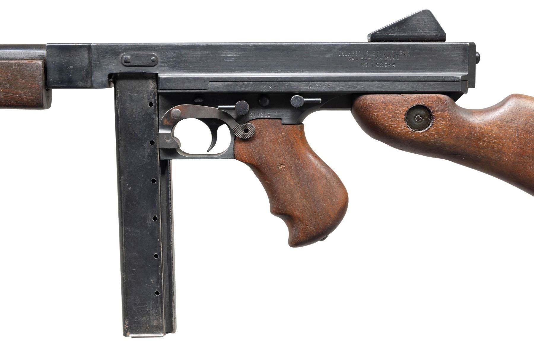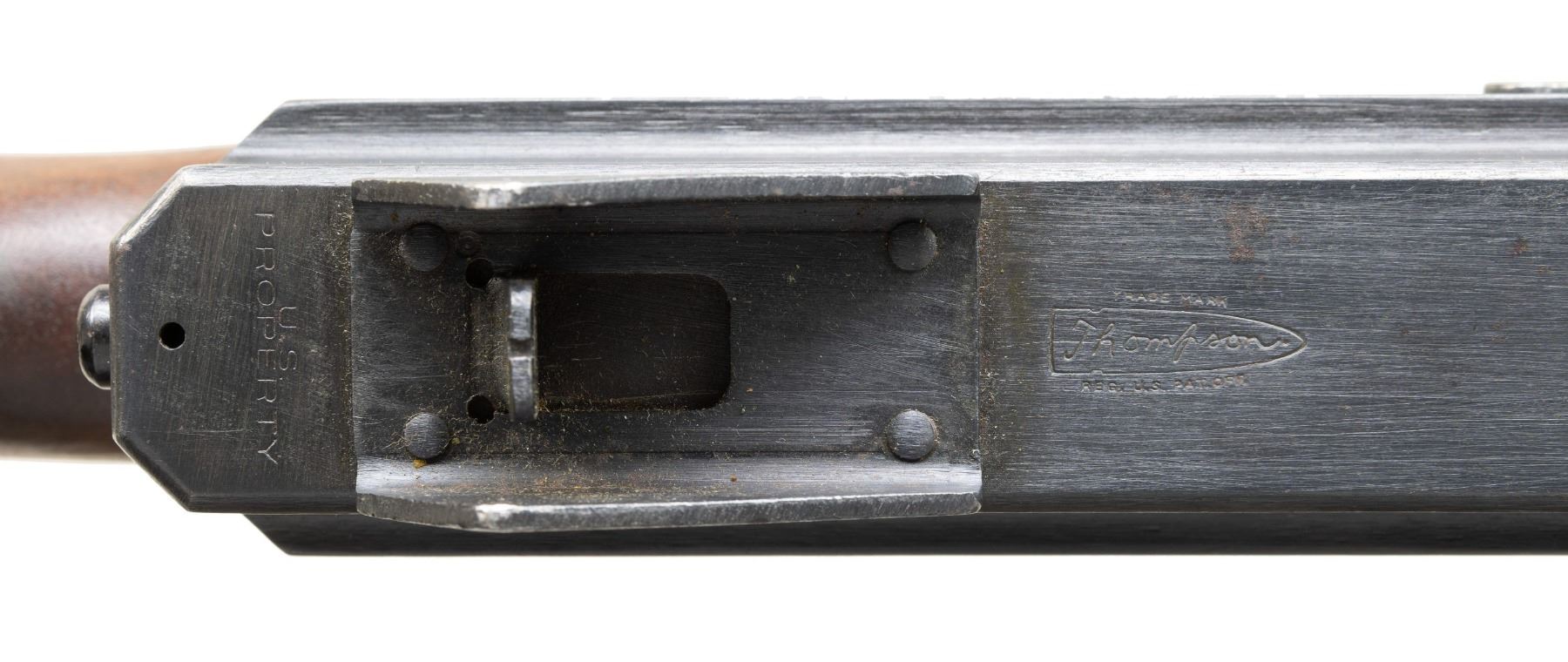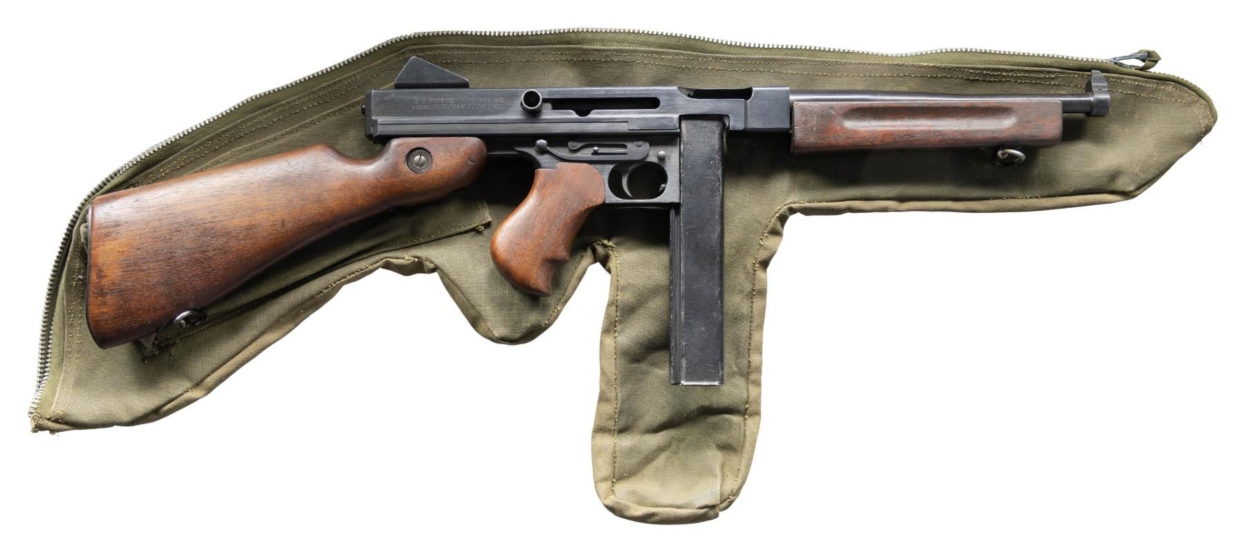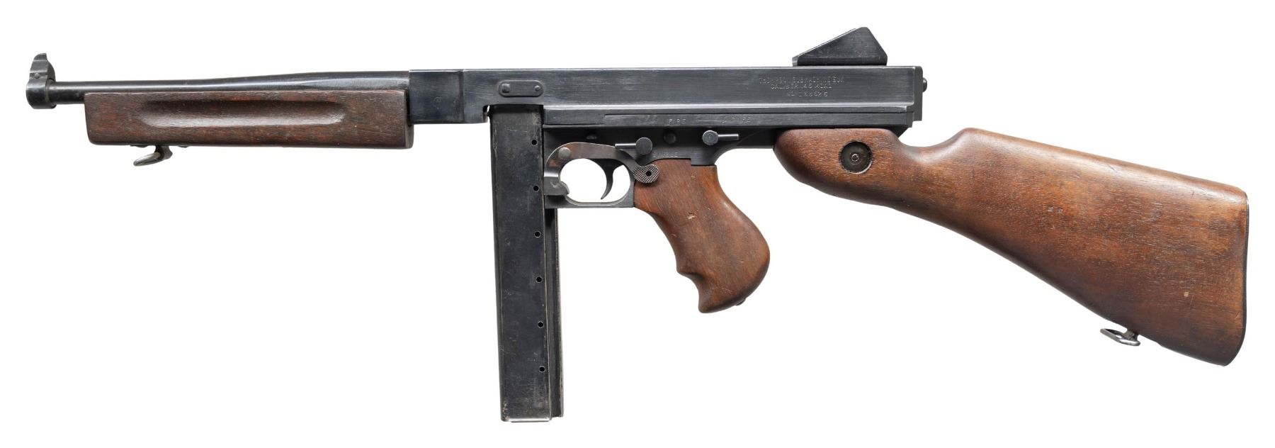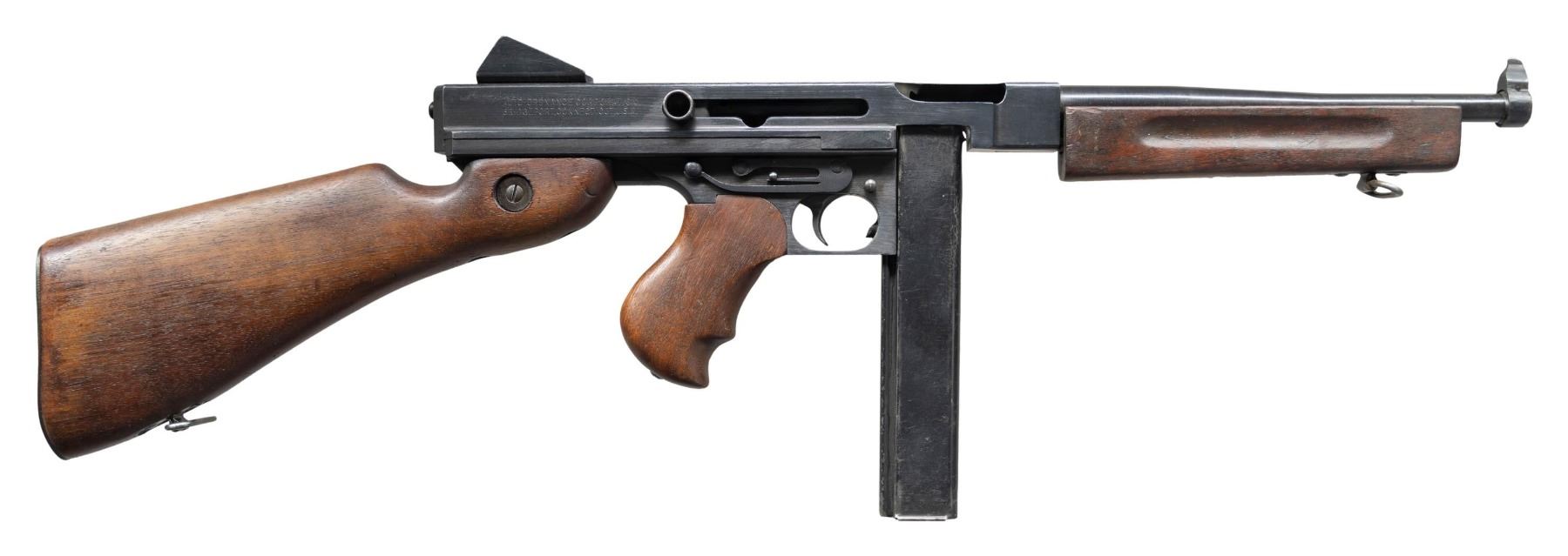 Cal. 45 ACP. S# 168626. Bbl. 10.5". M1A1 Model of the infamous Thompson SMG, “the gun that made the 20’s roar”. SMG was dewatted, similar to other Cadmus Industries guns with a plug, and was reactivated at some point. Classic hardwood furniture including horizontal forend. Shoulder stock had metal butt plate w/ trap door. Blued finish on all exposed metal surfaces. Above the horizontal handguard lies a smooth tapered bbl. which terminates at the familiar exposed front blade sight. Sling swivels front & rear. The simple yet effective rear sight combines a fixed peep w/ a notch in its protected environment for fast target acquisition. Right side smooth cocking handle. The M1A1 utilizes the heavily produced 20 rd. & 30 rd. stick mag. Receiver markings are as follows: (Left side) “THOMPSON SUB MACHINE GUN – CALIBER 45 M1A1 – NO. 168626” (Top) familiar Thompson trademark bullet logo forward of rear sight, "U.S. PROPERTY" behind rear sight & "CADMUS IND" to the left of the ejection port. (Right side) “AUTO – ORDNANCE CORPORATION – BRIDGEPORT, CONNECTICUT, U.S.A.”. MAGS: 5 steel 30 rd. stick Mags, all blued finish. UNATTACHED ACCESSORIES: fitted green canvas transport case. CONDITION: reapplied blued finish on all exposed metal surfaces quite complete & consistent w/ some thinning in areas of mechanical intervention & on high edges. Light, speckled patina on top of receiver & barrel. Wooden furniture exhibits period typical impressions, while retaining structural integrity. Bore is frosted w/ visible rifling. Fire control mechanism appears to function correctly when cycled by hand. NATIONAL FIREARMS ACT SMG REQUIRING BATF TRANSFER BEFORE TAKING POSSESSION. FULLY TRANSFERABLE. (03-1907/JZ). CURIO CLASS III. $12,000-18,000.