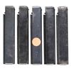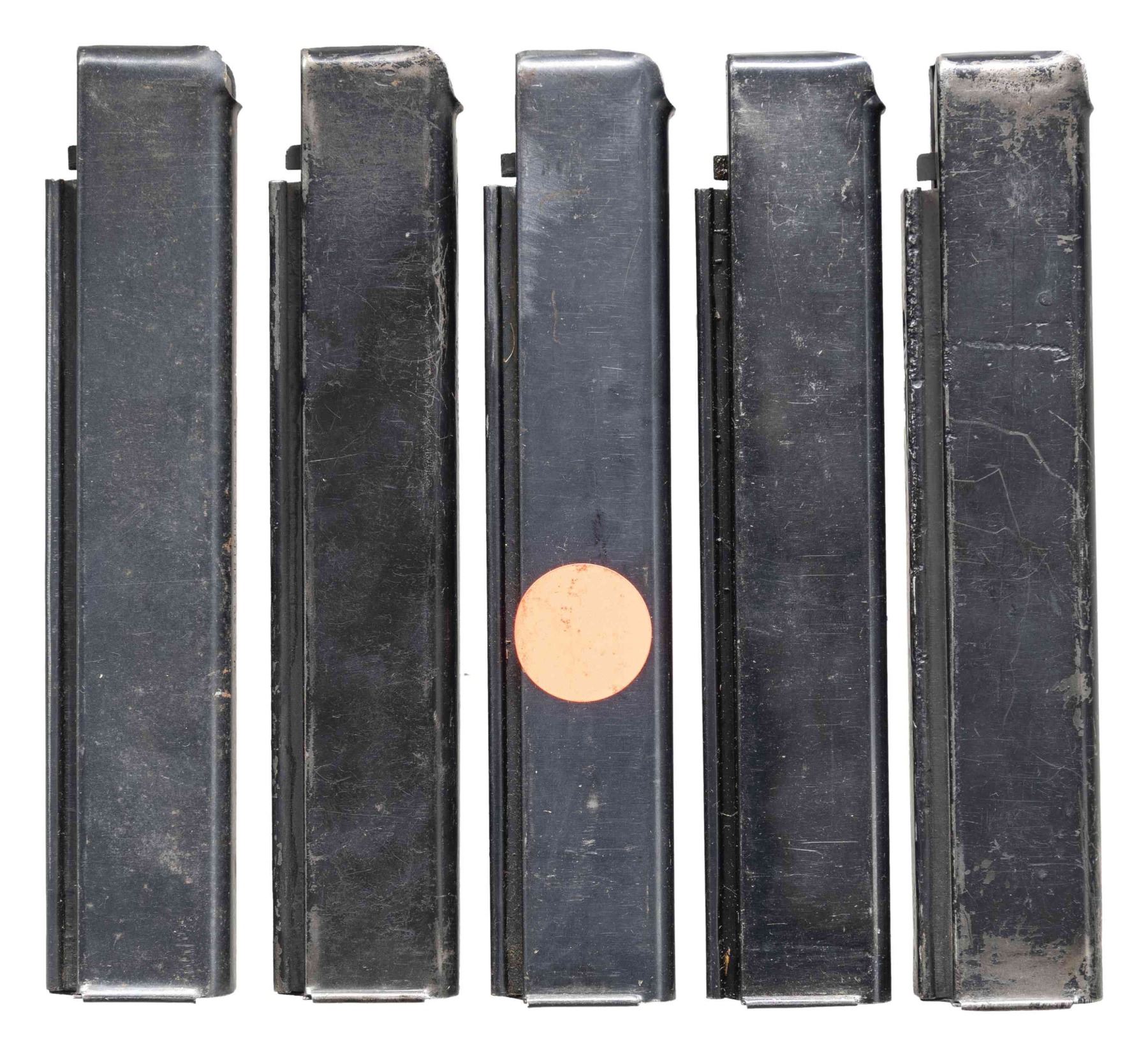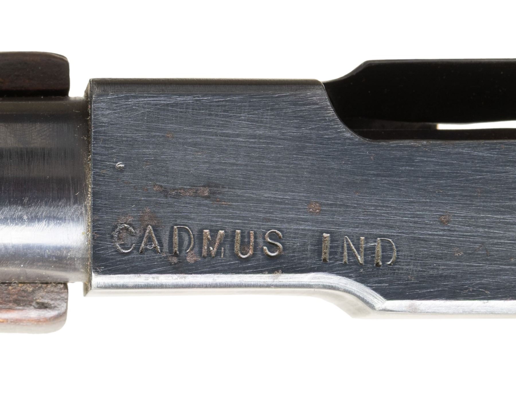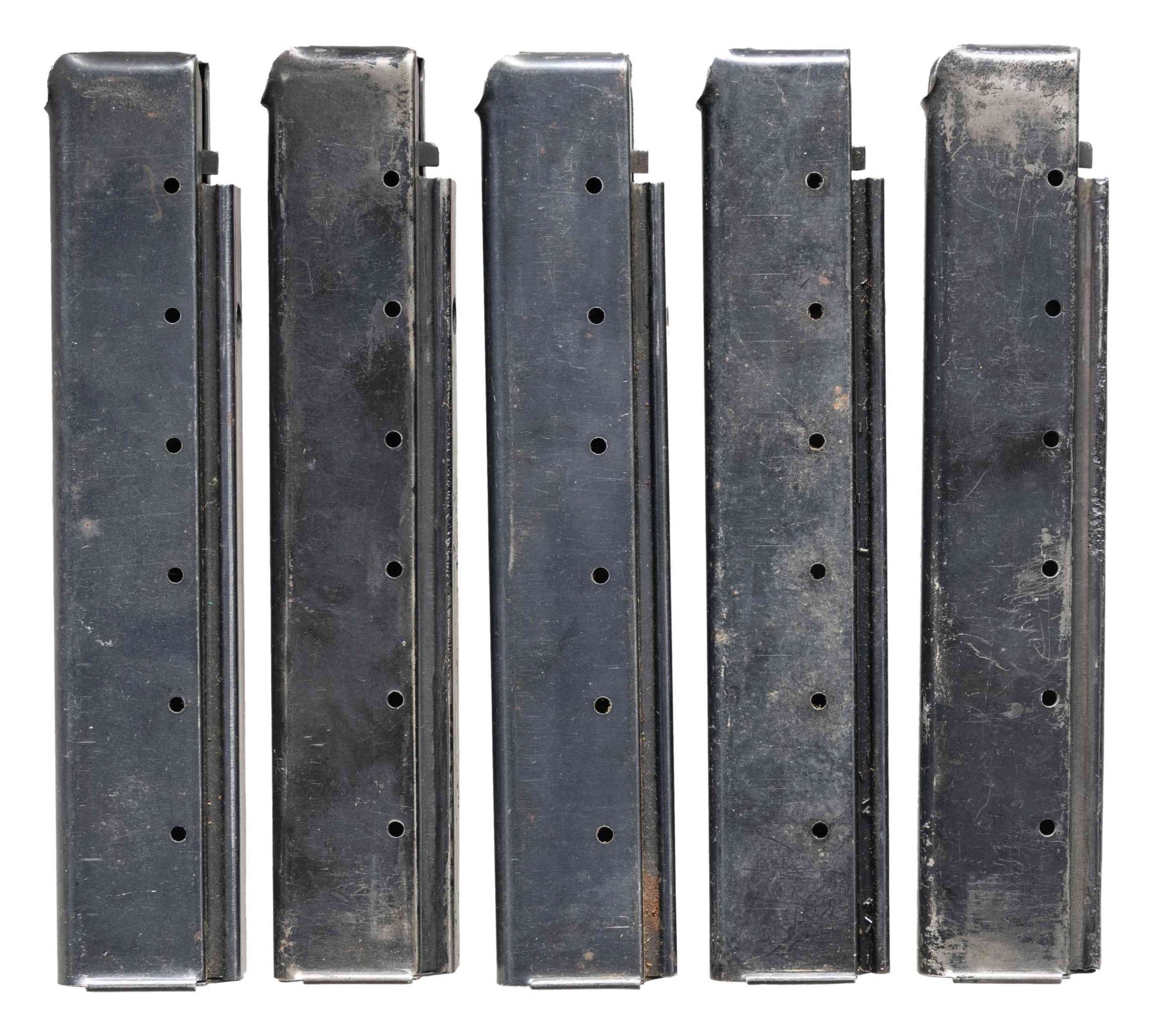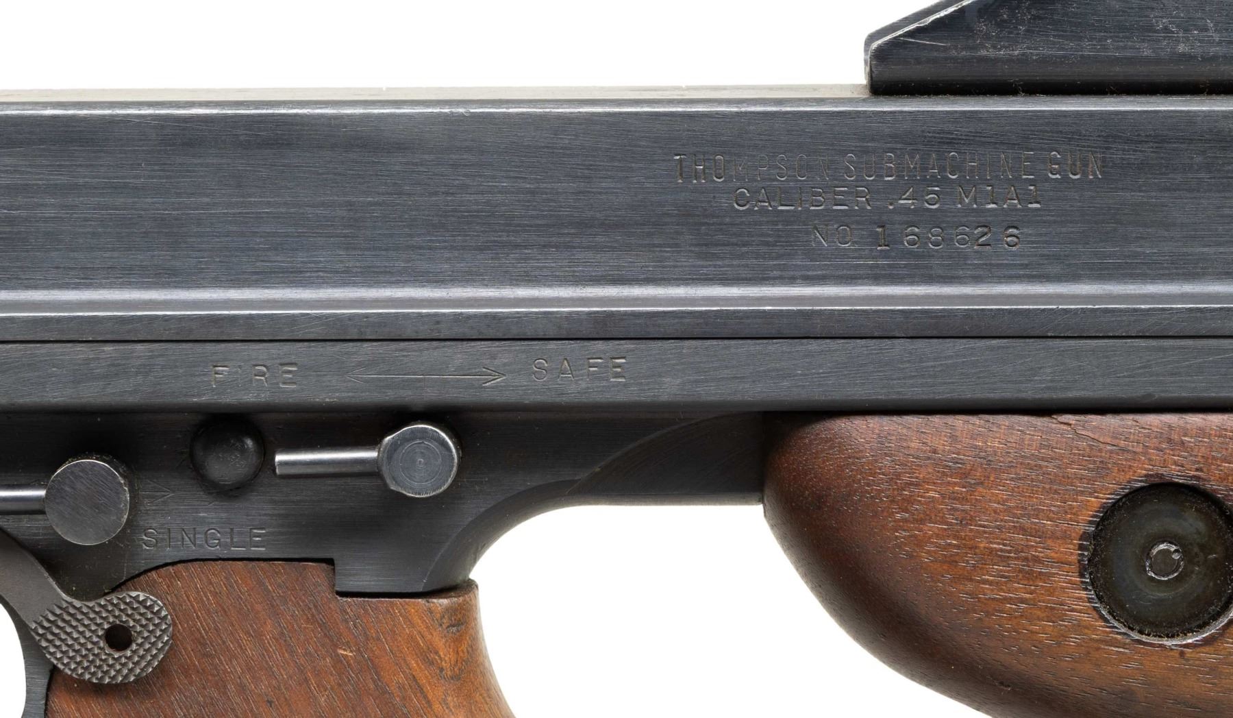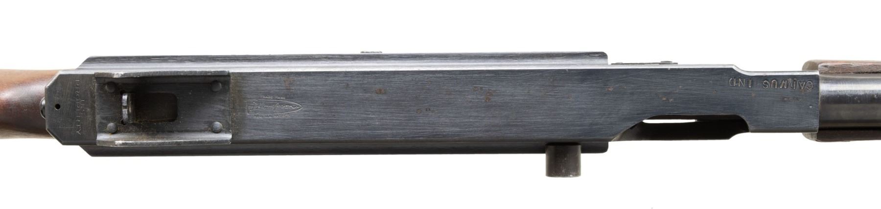 Cal. 45 ACP. S# 168626. Bbl. 10.5". M1A1 Model of the infamous Thompson SMG, “the gun that made the 20’s roar”. SMG was dewatted, similar to other Cadmus Industries guns with a plug, and was reactivated at some point. Classic hardwood furniture including horizontal forend. Shoulder stock had metal butt plate w/ trap door. Blued finish on all exposed metal surfaces. Above the horizontal handguard lies a smooth tapered bbl. which terminates at the familiar exposed front blade sight. Sling swivels front & rear. The simple yet effective rear sight combines a fixed peep w/ a notch in its protected environment for fast target acquisition. Right side smooth cocking handle. The M1A1 utilizes the heavily produced 20 rd. & 30 rd. stick mag. Receiver markings are as follows: (Left side) “THOMPSON SUB MACHINE GUN – CALIBER 45 M1A1 – NO. 168626” (Top) familiar Thompson trademark bullet logo forward of rear sight, "U.S. PROPERTY" behind rear sight & "CADMUS IND" to the left of the ejection port. (Right side) “AUTO – ORDNANCE CORPORATION – BRIDGEPORT, CONNECTICUT, U.S.A.”. MAGS: 5 steel 30 rd. stick Mags, all blued finish. UNATTACHED ACCESSORIES: fitted green canvas transport case. CONDITION: reapplied blued finish on all exposed metal surfaces quite complete & consistent w/ some thinning in areas of mechanical intervention & on high edges. Light, speckled patina on top of receiver & barrel. Wooden furniture exhibits period typical impressions, while retaining structural integrity. Bore is frosted w/ visible rifling. Fire control mechanism appears to function correctly when cycled by hand. NATIONAL FIREARMS ACT SMG REQUIRING BATF TRANSFER BEFORE TAKING POSSESSION. FULLY TRANSFERABLE. (03-1907/JZ). CURIO CLASS III. $12,000-18,000.