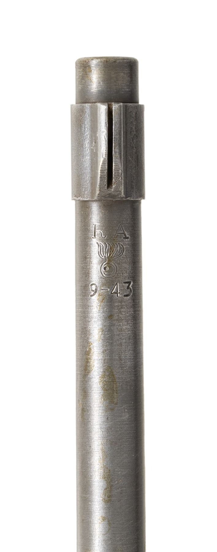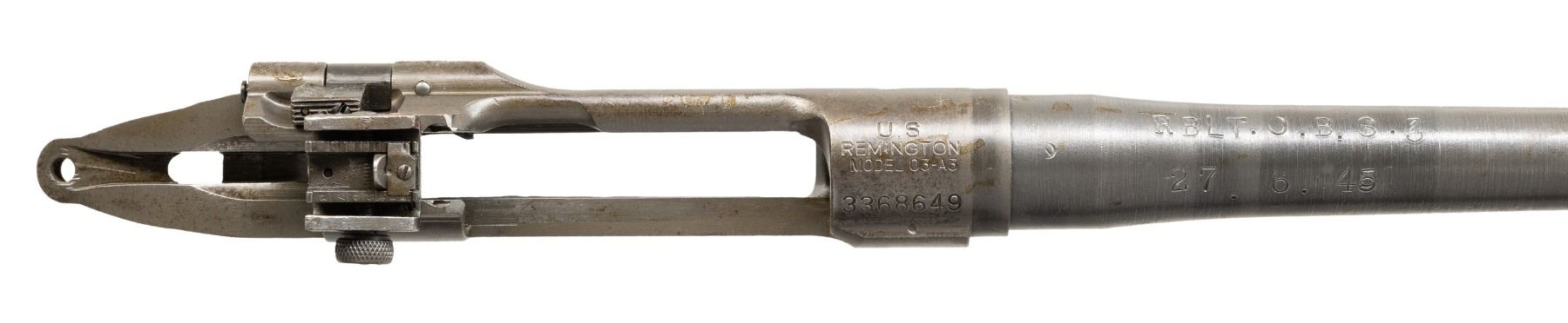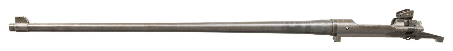 Cal. 30-06. S# 3368649. Bbl. 24". The barrel, which is marked behind the front sight "RA / flaming bomb / 9-43", is also marked on top ahead of chamber "RBLT.O.B.S.3 / 27.6.45". These marks indicate a rebuild at the U.S. Army Ordnance Base Section 3 in Brisbane, Australia. Work was performed on June 27th, 1945. The barreled receiver contains the following parts only: adjustable aperture rear sight assembly, cutoff assembly and front sight base. Receiver markings and assembly markings are crisp and clear. CONDITION: receiver and barrel appear to retain their thinning original parkerized finish with light wear. Very good shiny two-groove bore. (25-3071/RW). MODERN. $100-200.