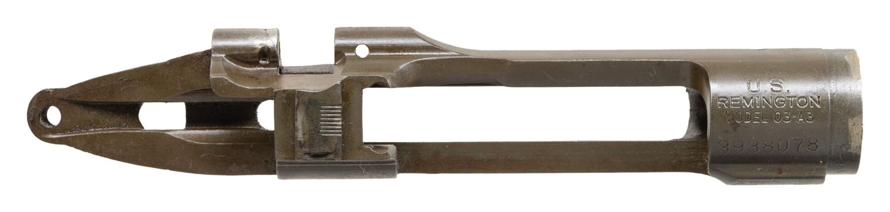 S# 3938078. Receiver likely re-purposed from a drill rifle. Receiver has remnants of arc-welding on top forward edge of receiver ring and at the rear of the cutoff recess. Receiver is marked on top "U.S. / REMINGTON / MODEL 03-A3". No additional parts included. CONDITION: receiver retains 90% of its original parkerized finish with very light wear except where welds have been removed. (25-6246/RW). MODERN. $100-200.