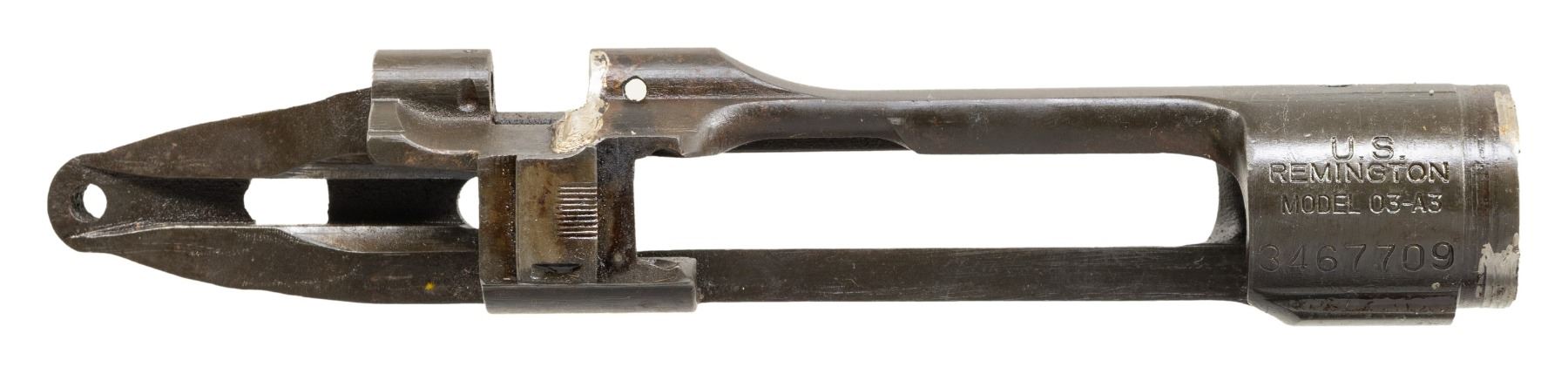 S# 3467709. Receiver likely re-purposed from drill rifle. Top forward edge of receiver ring has two partly removed areas of arc-welding. Notable area of arc-welding in cutoff recess. Receiver is marked "U.S. / REMINGTON / MODEL 03-A3". No additional parts included. CONDITION: receiver retains 70% of its original parkerized finish with light wear and scattered spots of oxidation. (25-6244/RW). MODERN. $100-200.