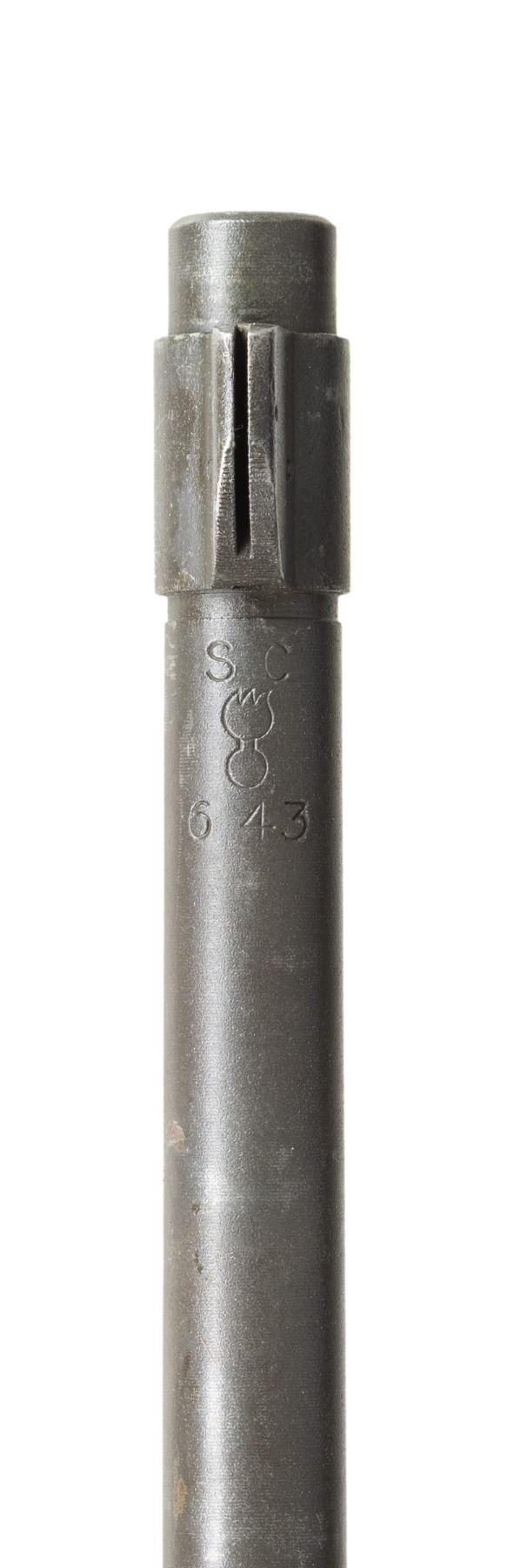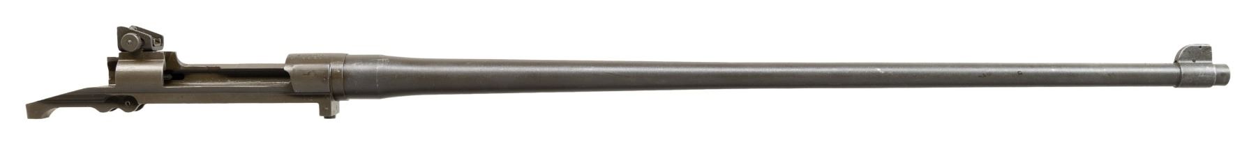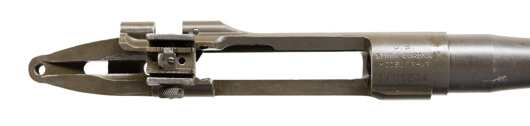 Cal. 30-06. S# C3708231. Bbl. 24". Barrel marked behind front sight "SC / flaming bomb / 6 43". Receiver is equipped with adjustable aperture rear sight adjusted to 800 yards. Front sight base without blade is present. The only additional part present is the stamped handguard ring. Receiver is marked on top "U.S. / SMITH-CORONA / MODEL 03-A3". CONDITION: entire assembly contains 90% of its lightly worn arsenal rework parkerized finish. Very good shiny four groove bore. (25-3069/RW). MODERN. $100-200.
