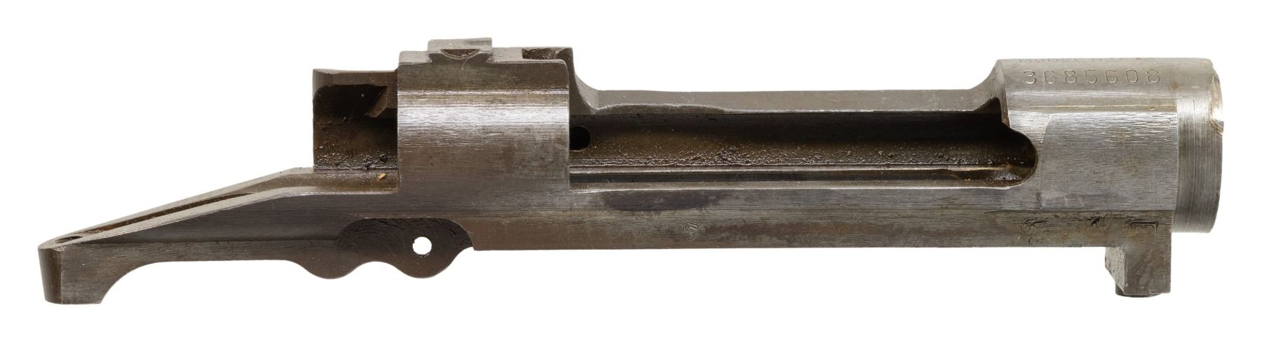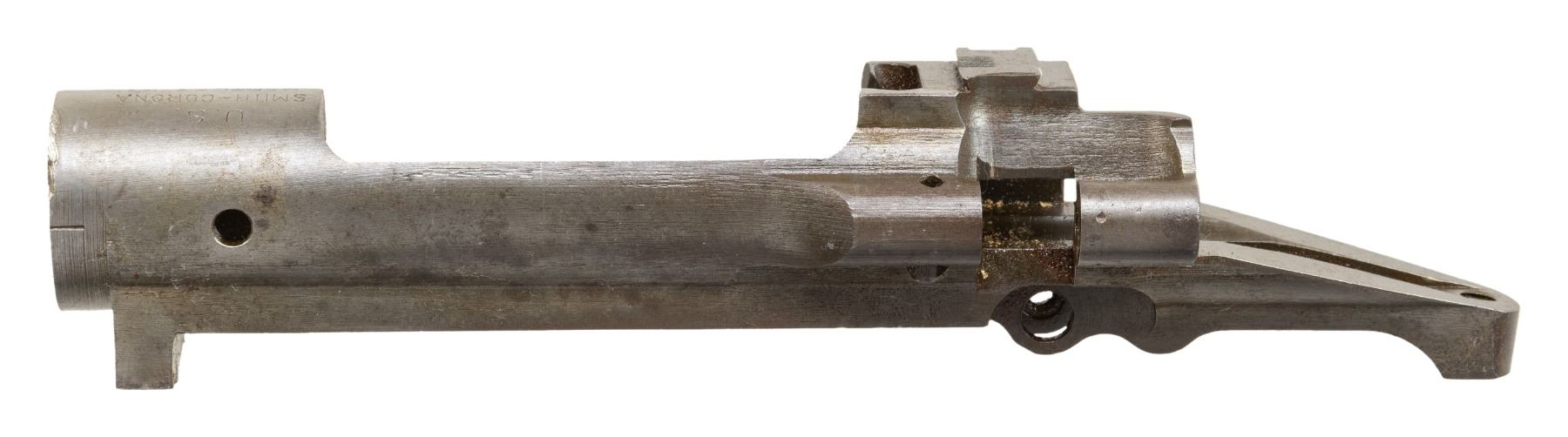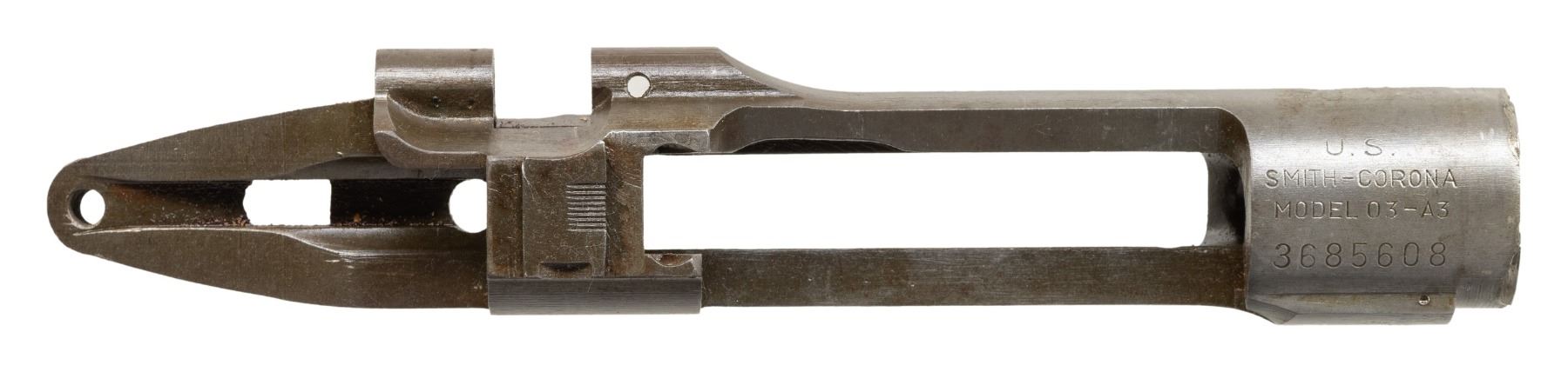S# 3685608. Receiver likely re-purposed from drill rifle. Top forward edge of receiver ring has two areas of arc welding. Receiver marked on top "U.S. / SMITH CORONA / MODEL O3-A3". No additional parts included. CONDITION: receiver is turning gray under a preservative coating with evidence of areas of very light pitting. (25-6231/RW). MODERN. $100-200.