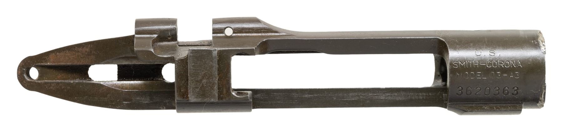 S# 3620363. Receiver likely re-purposed from drill rifle. Top forward edge of receiver ring has traces of arc-welding. Receiver marked on top with "U.S. / SMITH CORONA / MODEL 03-A3". Sight dovetail on receiver bridge is without notches. No additional parts included. CONDITION: receiver retains 80% of its original lightly worn parkerized finish. (25-6229/RW). MODERN. $100-200.
