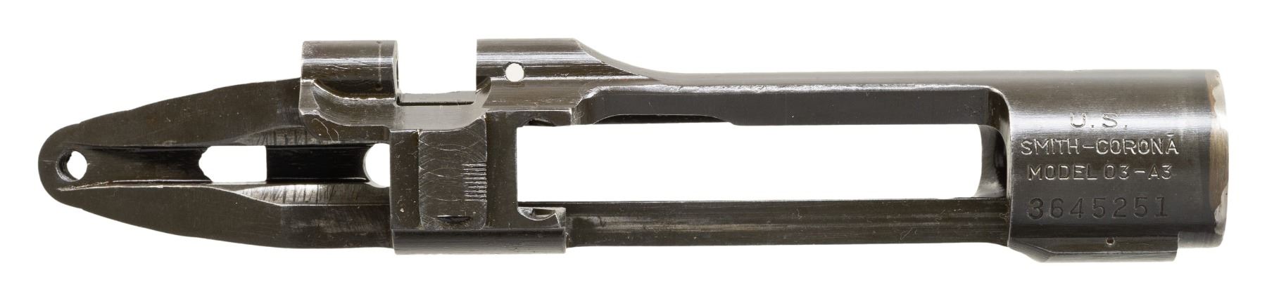 S# 3645251. Receiver likely re-purposed from drill rifle. Front edge of receiver ring has had arc welding removed from two areas. Receiver marked on top "U.S. / SMITH CORONA / MODEL 03-A3". No additional parts included. CONDITION: receiver retains 75% of its original parkerized refinish with light wear. (25-6232/RW). MODERN. $100-200.