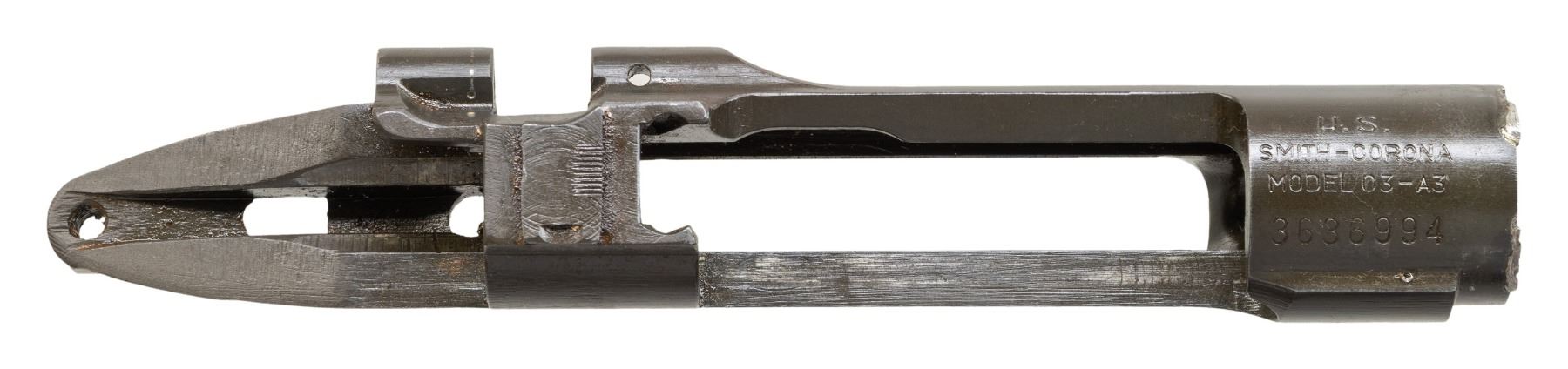 S# 3636994. Receiver likely re-purposed from drill rifle. Top front edge of receiver ring has remnants of two approximately 1/2" areas of arc welding. Top of receiver marked "U.S. / SMITH CORONA / MODEL 03-A3". No additional parts included. CONDITION: receiver retains 85% of its original lightly worn parkerized finish. (25-6235/RW). MODERN. $100-200.