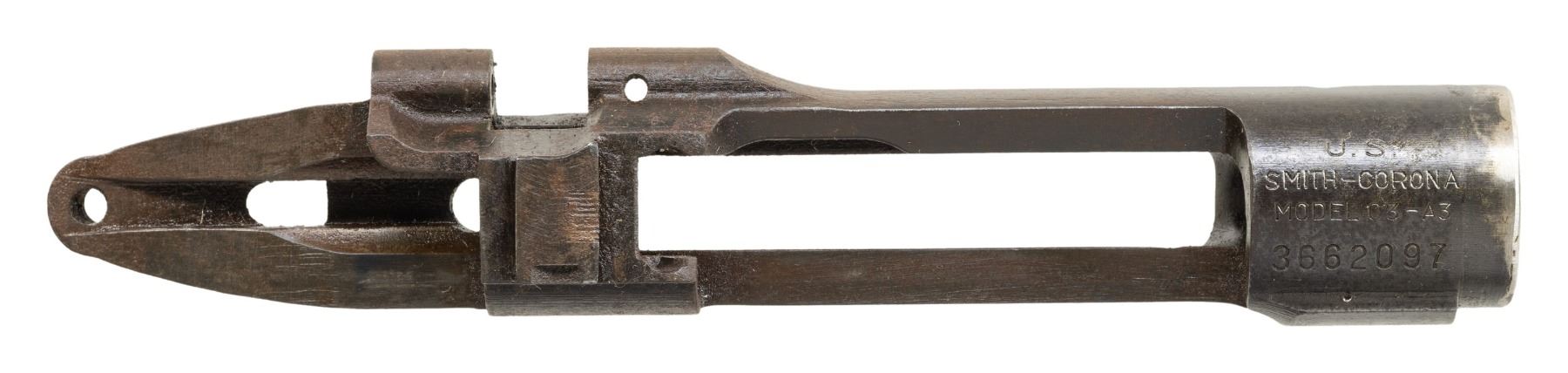 S# 3662097. Receiver is likely re-purposed from a drill rifle due to the presence of small areas of arc welding on the front edge of the receiver ring. Face of the ring has been machined to remove welds. Receiver is marked on top "U.S. / SMITH CORONA / MODEL 03-A3". Receiver contains no additional parts. CONDITION: receiver is coated with a preservative finish similar to cosmoline, but exhibits light wear and spots of oxidation. (25-6249/RW). MODERN. $100-200.