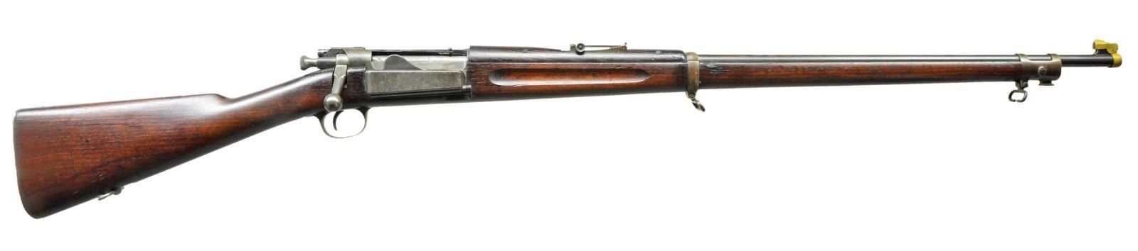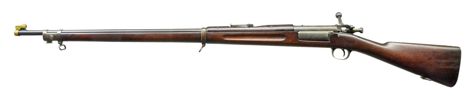 Cal. 30-40 Krag. S# 270474. Bbl. 30". Rifle fitted w/ Model 1896 rear sight graduated to 1800 yards. Due to problems w/ the 1898 rear sight all Model 1898 rifles on which they were installed were recalled in 1900 & fitted w/ Model 1896 rear sight. This appears to be one of those rifles so fitted. Blade front sight. Walnut stock set w/ crisp boxed "J.S.A.1900". Circle "P" proof under grip. Trap buttplate. UNATTACHED ACCESSORIES: brass sight protector in muzzle cover. CONDITION: stock set has nice original finish w/ scattered sm. handling marks & crisp cartouche. Metal has fading blue turning gray notably at receiver area. Extractor has traces of fire blue. Bore has strong lands w/ slightly darkened grooves. (22-675/RW). CURIO. $500-700.