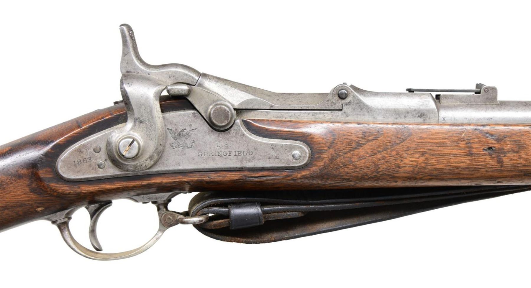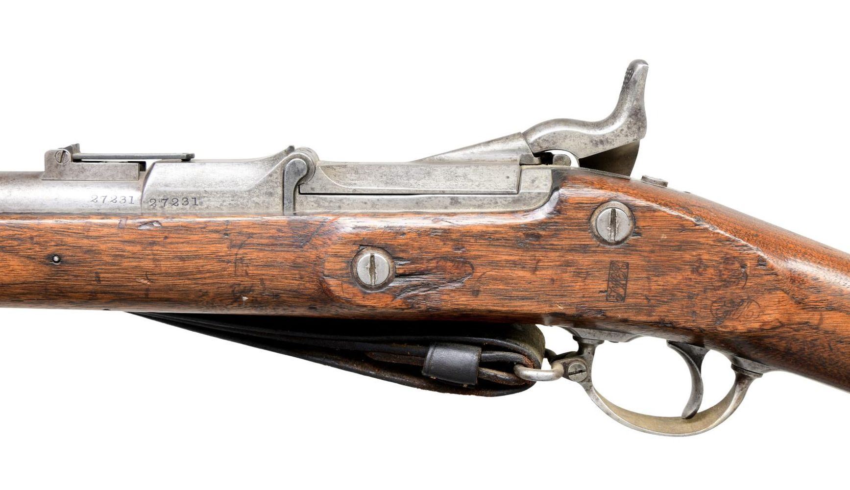 SINGLE SHOT MILITARY RIFLE. CAL. 50-70. S# 27231. S# matches on receiver and bbl. Bbl. 32 1/2". Ladder rear sight graduated to 900 yards. Moveable slide is not present. Stud type front sight. Breech block is dated "1870", has the eagle head over crossed arrows, / "U.S.". Beveled lock pipe is dated 1863 & has the spread wing eagle plus "U.S. SPRINGFIELD". 2 Click tumbler. Walnut stock has two clamping bands retained by springs. Ramrod retained by spring & has flat tip. Stock is marked on left panel w/ 4 faint cartouches of which only the "SWP" & "ESA" are legible. No markings are visible behind trigger guard. Buttplate marked "U.S." on tang. Two piece trigger guard. Sling swivels are mounted on the upper band & trigger guard bow. Period black leather sling w/ single hook & 2 sliding keepers marked "ROCK ISLAND". CONDITION: well worn stock w/ numerous handling marks has been cleaned w/ added finish. Notable chip on left side of forend. Sm. chips along ramrod channel. Metal has turned overall gray w/ patina. Fine pitting & numerous handling marks. Bore has strong sharp lands & fine pitting throughout. (01-25348/RW). ANTIQUE. $500-700.