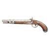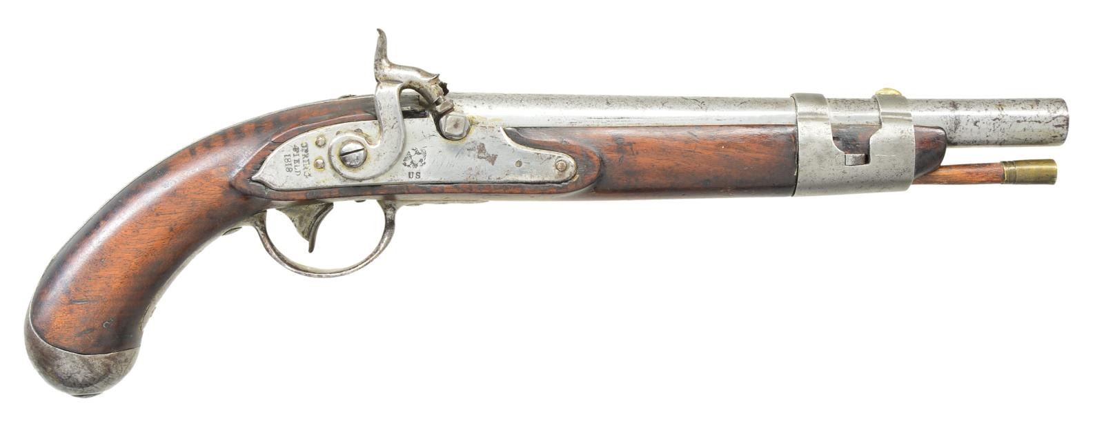 CONVERSION SINGLE SHOT MUZZLE LOADING PISTOL. Cal. 69. S# NSN. Rnd. 10 1/4" smooth bore bbl. Fixed brass blade on front strap of bbl. band. These pistols were made at Springfield Armory CA 1807-1808 but the production run was not completed. Production was restarted in 1817 & approx. 1,000 guns were completed. This pistol was converted to percussion using a sporting type hammer, drum & nipple. The lockplate w/ rearward extension is marked in front of hammer w/ the "eagle US". Marked vertically behind hammer "SPRINGFIELD 1818". Top of bbl. is dated "1818". Left side of bbl. has "oval P" proof, "eagle head" & "V". Marked inside trigger guard w/ "LA". Double strap bbl. band. Iron furniture. Walnut stock w/ 2 obscured oval inspector marks. Replacement wooden ramrod w/ brass tip. CONDITION: stock has had early refinish w/ slight loss of wood in inletted areas w/ added finish over wear & handling marks. Crack on left side extending from rear of bbl. to top sideplate screw. Metal has extensive wear & handling marks w/ oxidation. Metal appears to have been nickel plated & plating partially removed in an attempt at restoration. Ramrod appears to be vintage replacement. Bore appears worn turning dark w/ oxidation & fine pitting. (01-23051/RW). ANTIQUE. $700-1,100.