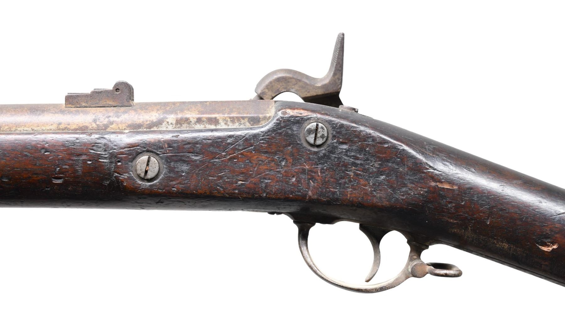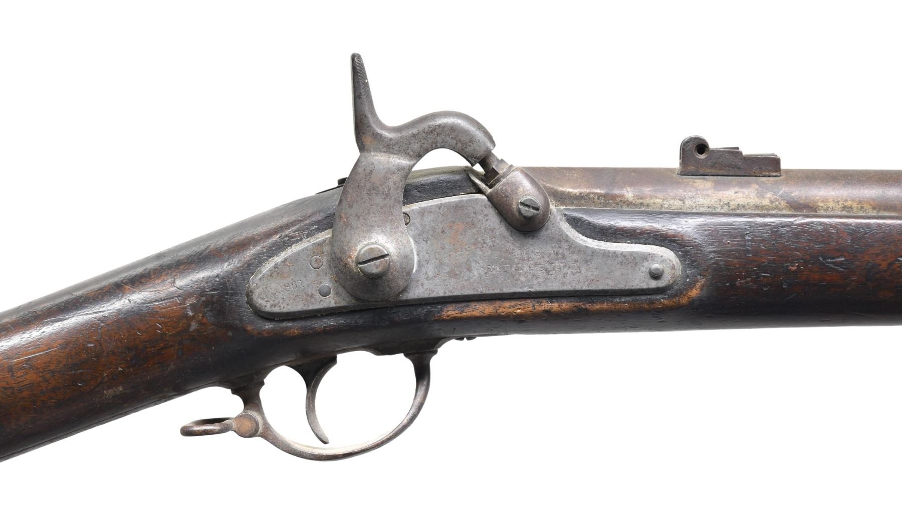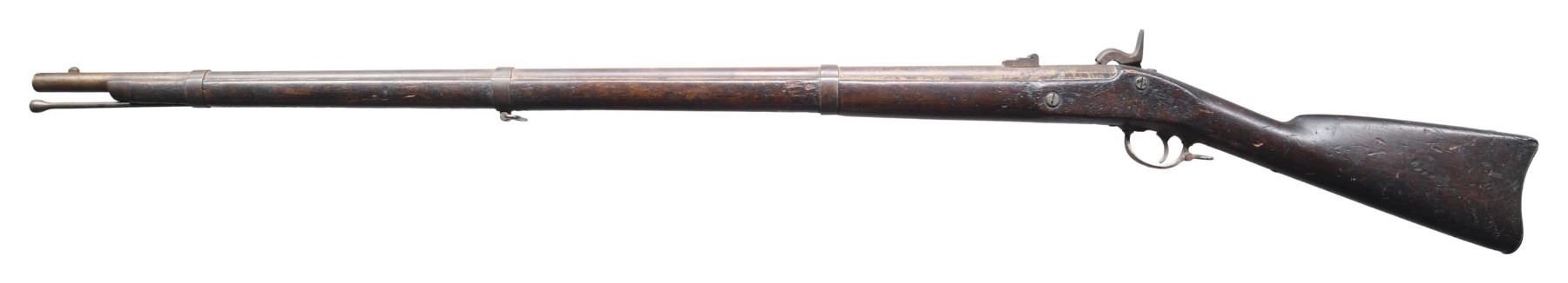Cal. 58. NSN. Bbl. 40" round w/ rifled bore. Fixed front sight with a folding leaf rear sight. "1861" dated Springfield lock. 3-band walnut stock with iron fittings. Tulip tipped iron ramrod. Total of 265,129 mfg. 1861-1862. CONDITION: metal has largely faded to mottled brown showing spotted surface corrosion and light pitting. Stock has age darkened worn appearance with numerous scratches, marks, and dents. Lock will not hold in cocked position. Lightly pitted bore retains sound rifling. (01-27211/DS). ANTIQUE. $300-500.