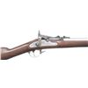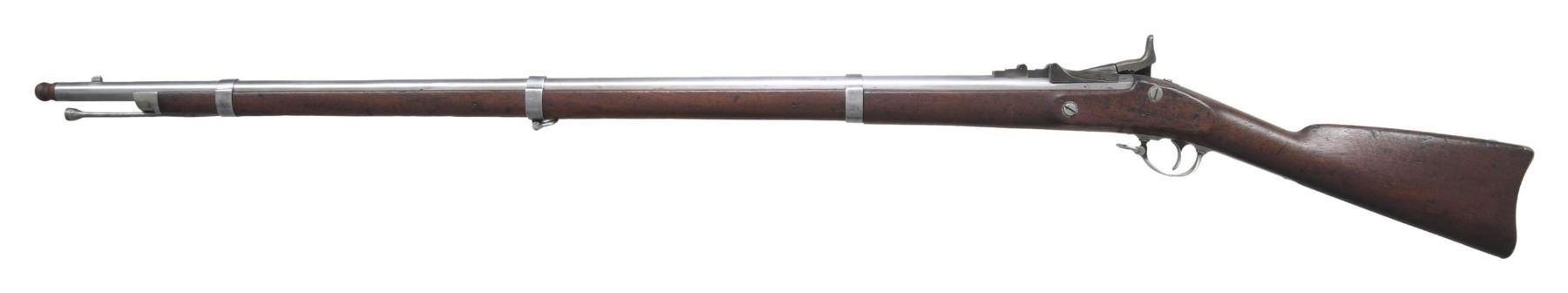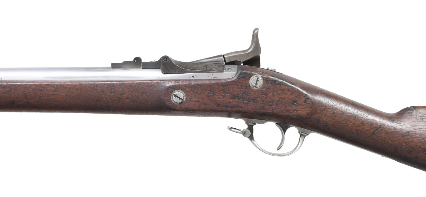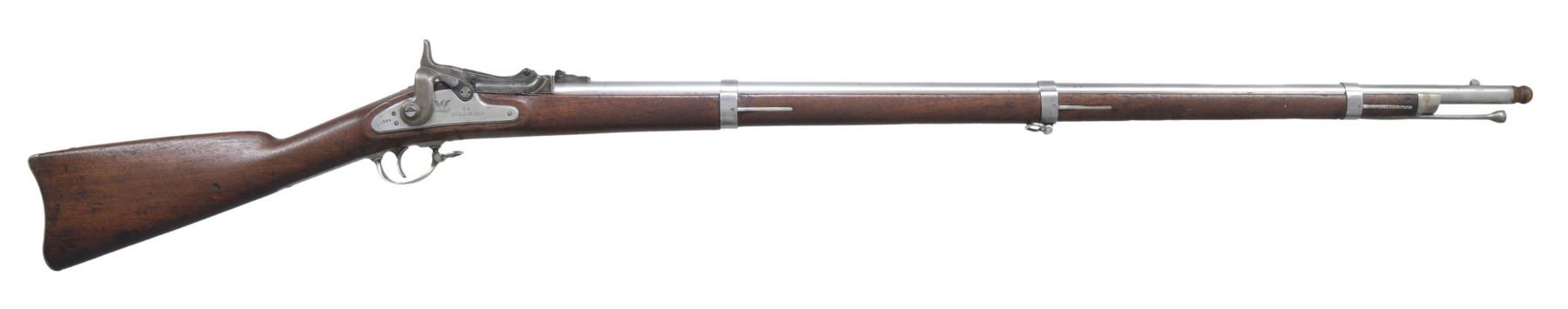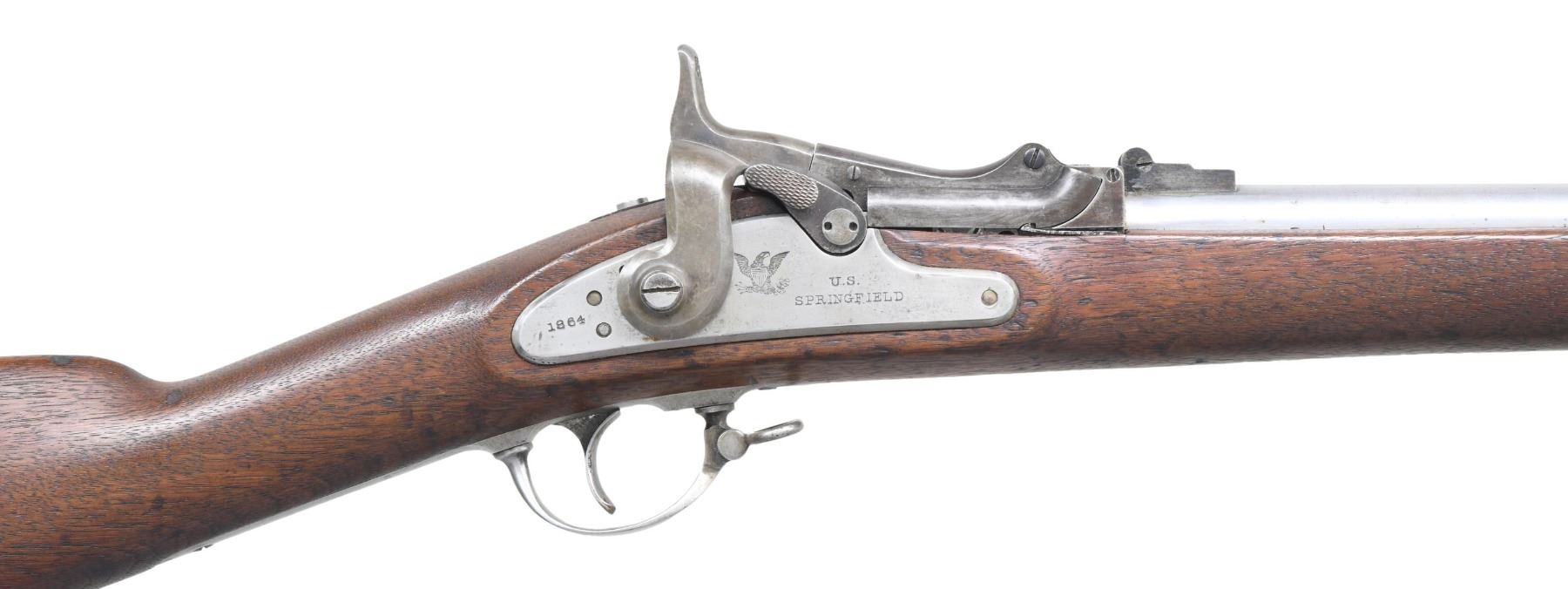SINGLE SHOT TRAPDOOR RIFLE. Cal. 58 RF. NSN. Bbl. 37 3/4" with rifling bore. Fixed front sight with folding leaf rear sight. Upward pivoting breechblock is released by right side thumb latch. "1864" dated Springfield lock. 3-band walnut stock with iron fittings. Tulip tipped ramrod. Approx. 5,000 altered at Springfield from percussion muskets. UNATTACHED ACCESSORIES: wood muzzle plug. CONDITION: bbl., lockplate, and fittings are cleaned bright. Hammer, action, and breechblock have a faded light gray appearance. Stock shows wear with numerous dents and marks. Functioning lock and action. Bore retains intact rifling having a bulge approx. 12" from the muzzle. (01-27227/DS). ANTIQUE. $1,200-1,800.